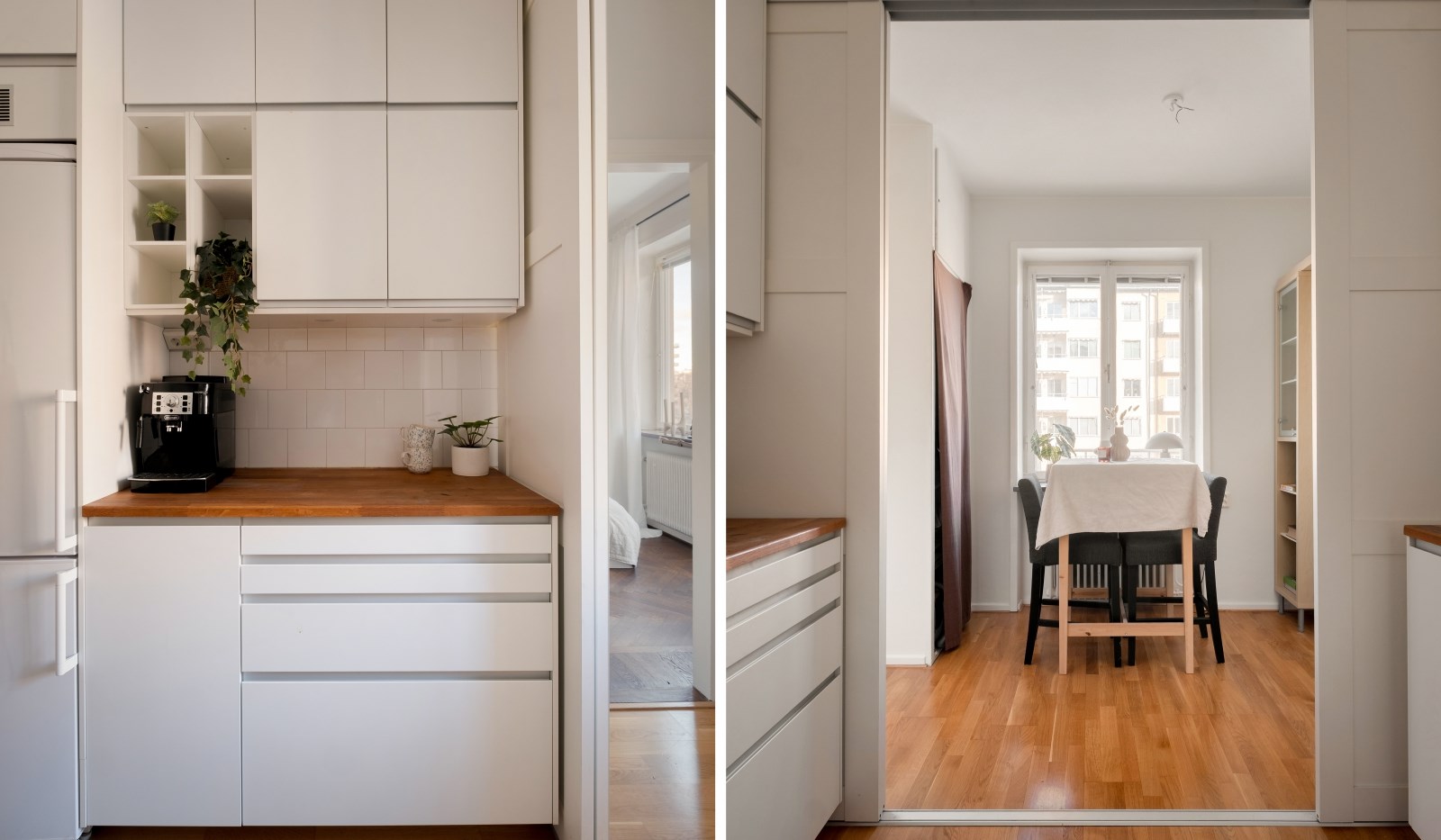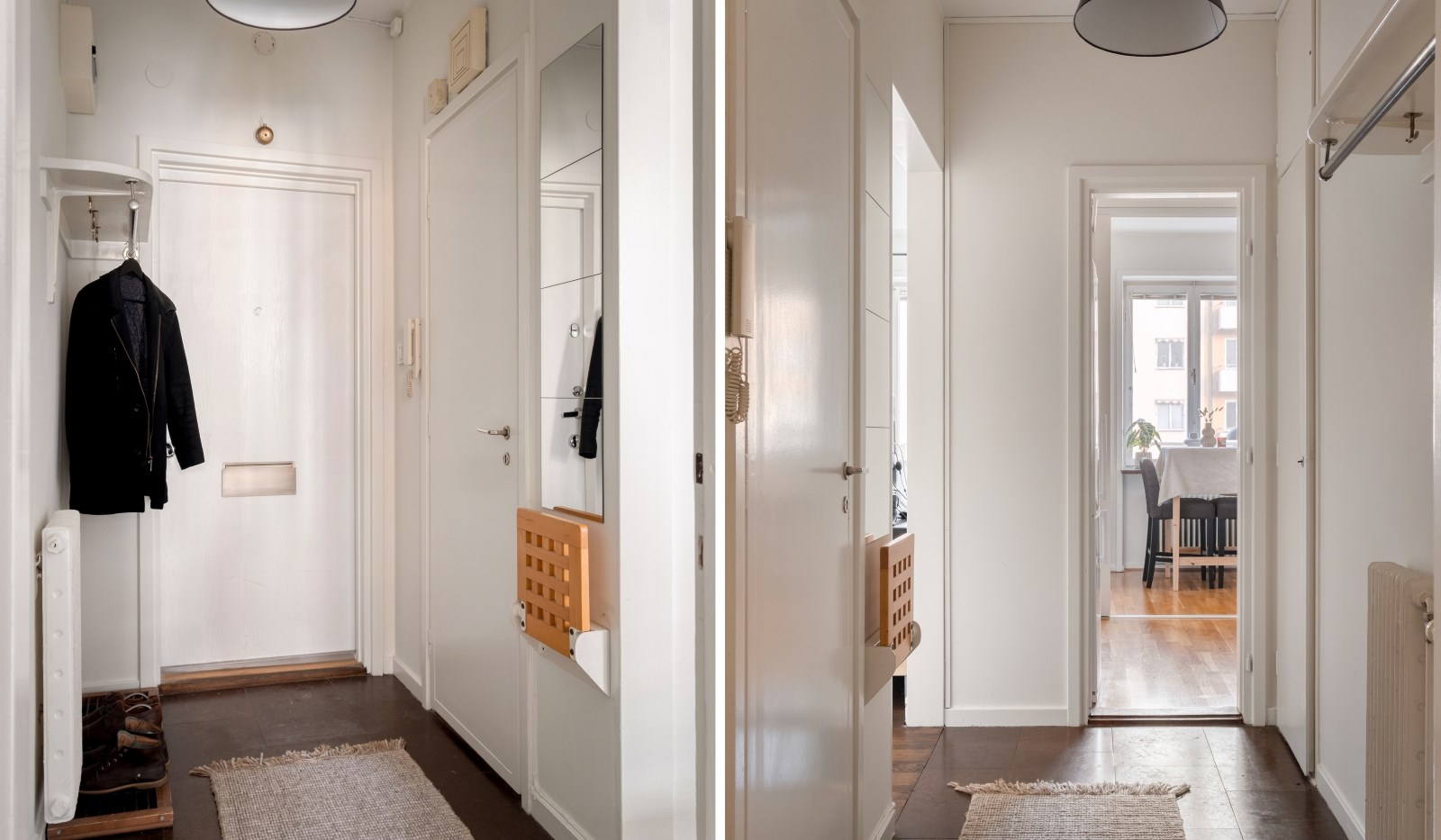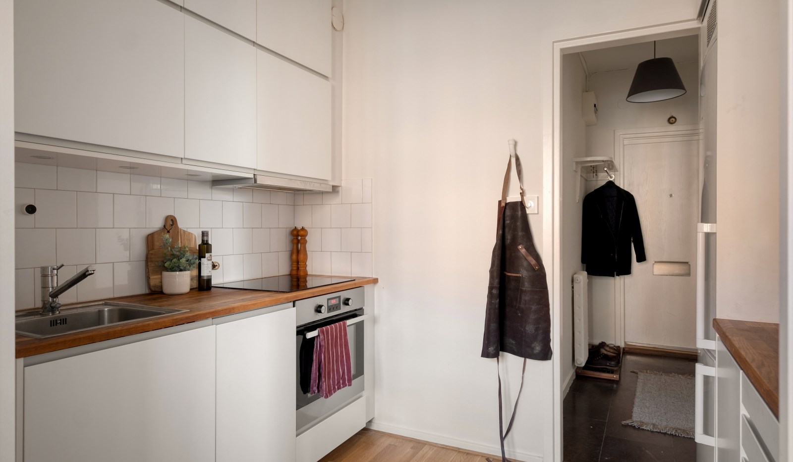 Invändigt möts du av vitmålade väggar, vacker fiskbensparkett och en smart planlösning där varje kvadratmeter är väl utnyttjad. Det praktiska och stilrena köket ger gott om arbetsyta och förvaring. Vardagsrummet erbjuder plats för både soffgrupp och matplats och kompletteras av en rymlig klädkammare som löser förvaringen med bravur.