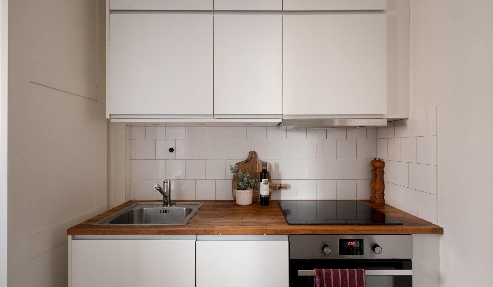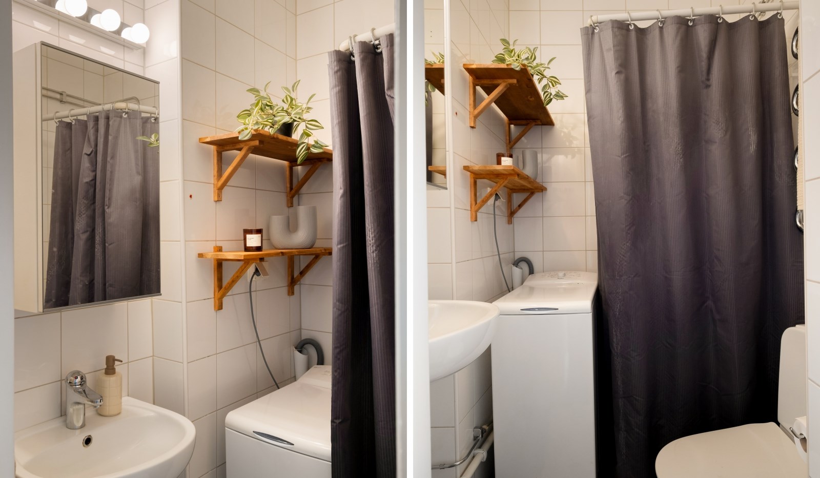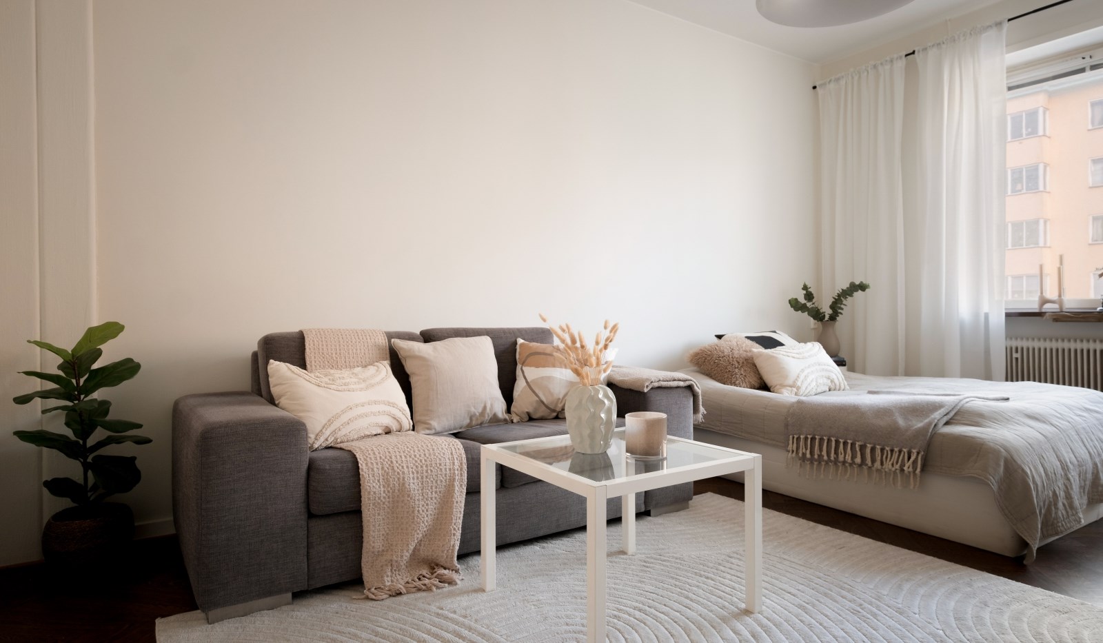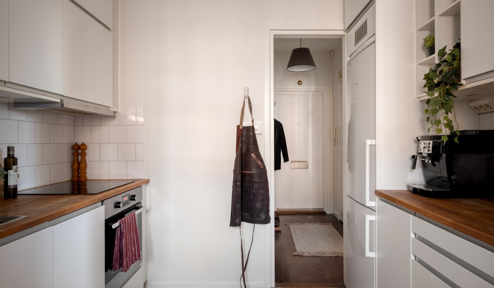 Invändigt möts du av vitmålade väggar, vacker fiskbensparkett och en smart planlösning där varje kvadratmeter är väl utnyttjad. Det praktiska och stilrena köket ger gott om arbetsyta och förvaring. Vardagsrummet erbjuder plats för både soffgrupp och matplats och kompletteras av en rymlig klädkammare som löser förvaringen med bravur.