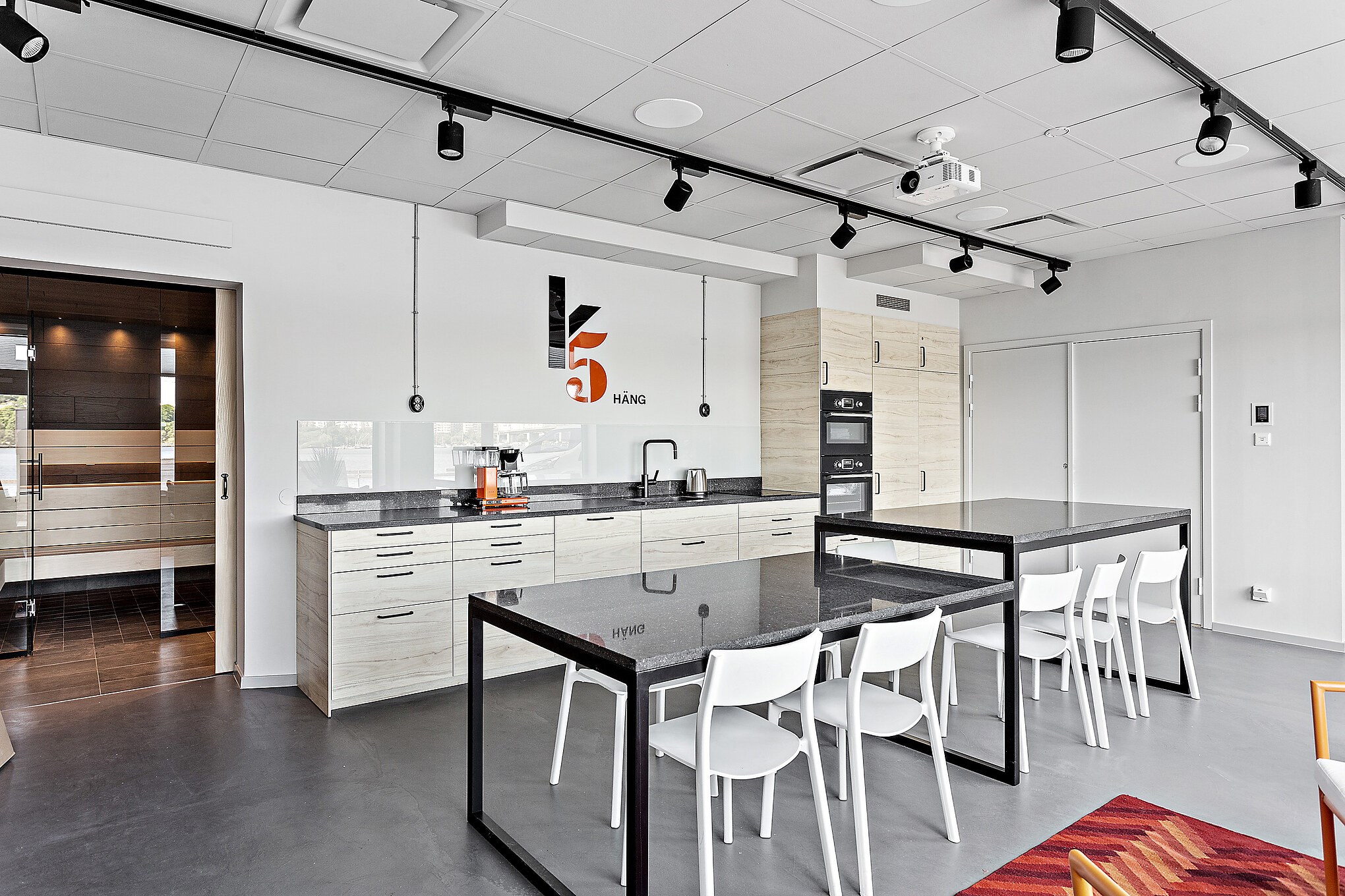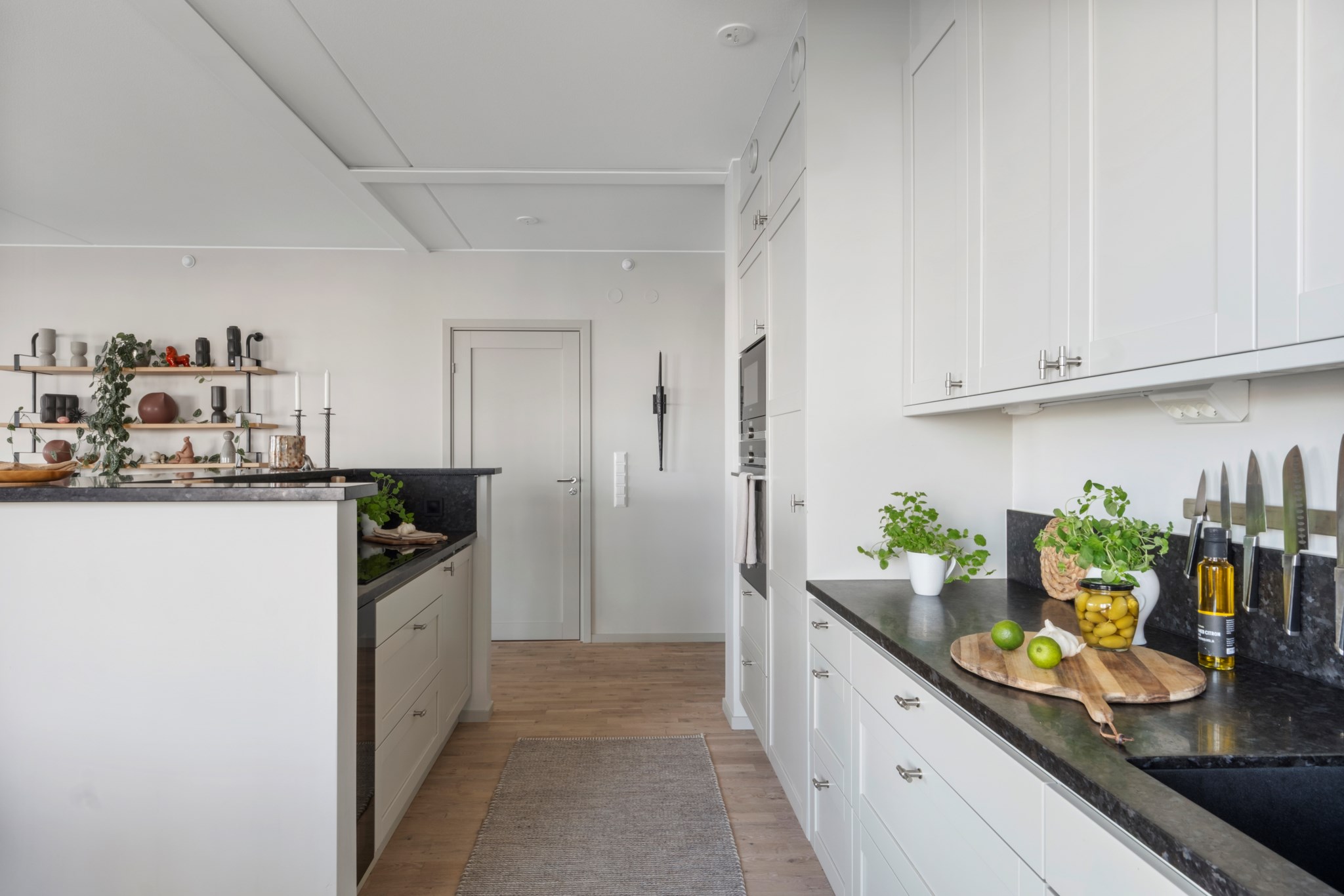 Smakfullt och fullt utrustat kök med generösa arbetsytor och gott om förvaring. Den öppna planlösningen mot vardagsrummet skapar en social och inbjudande miljö. Intill fönsterpartiet finns plats för en större matgrupp där du njuter av utsikten över vattnet.