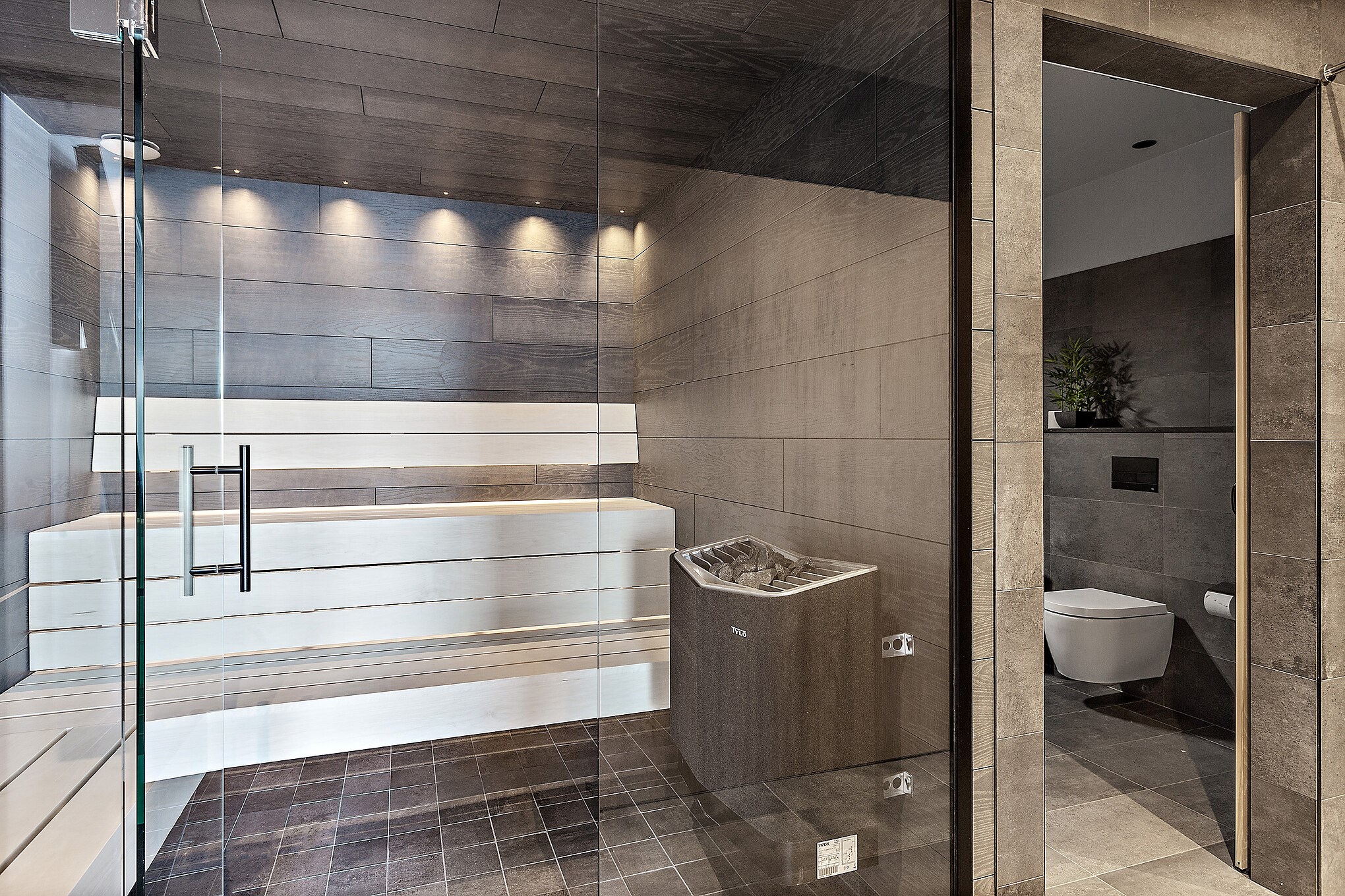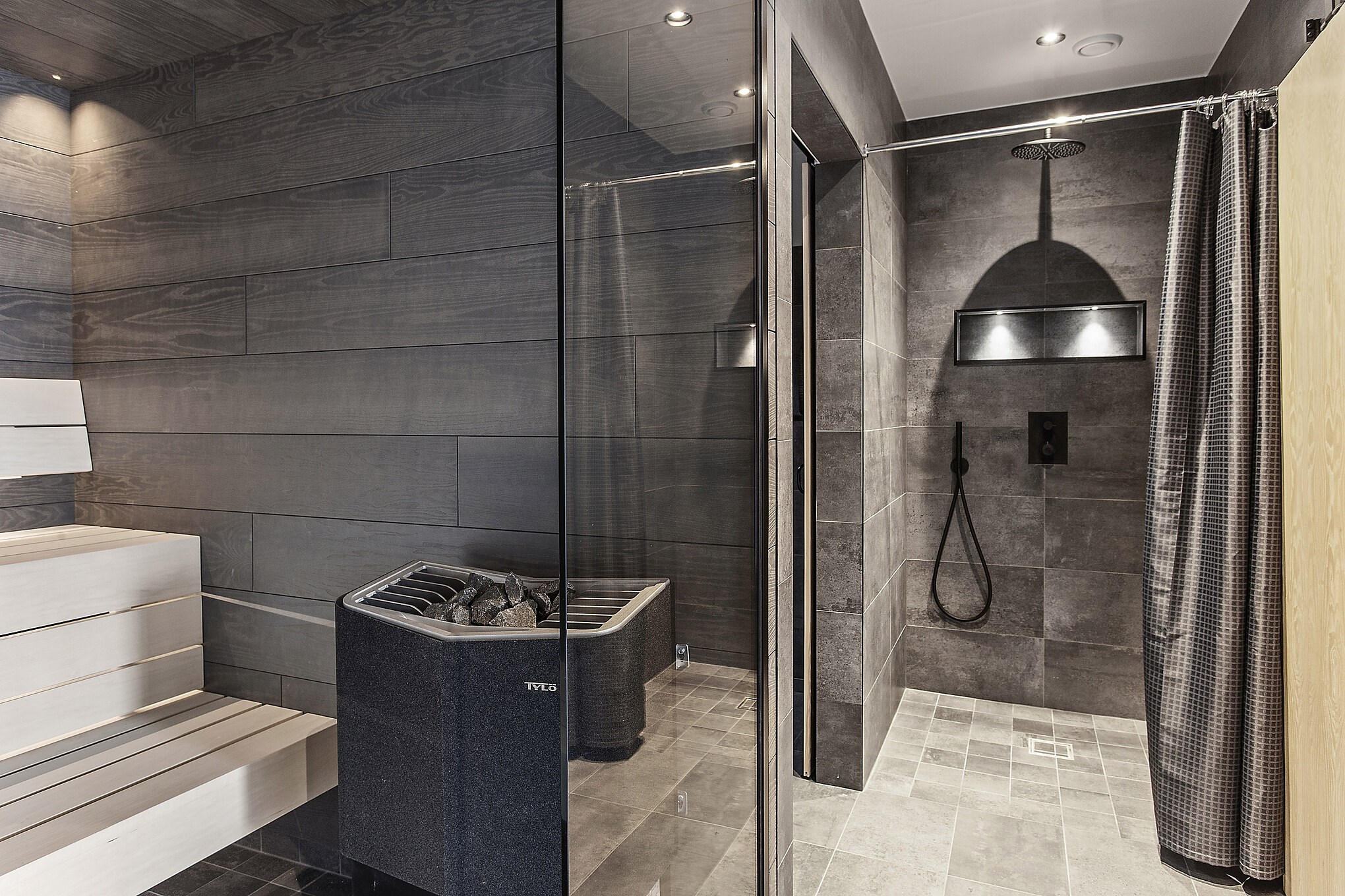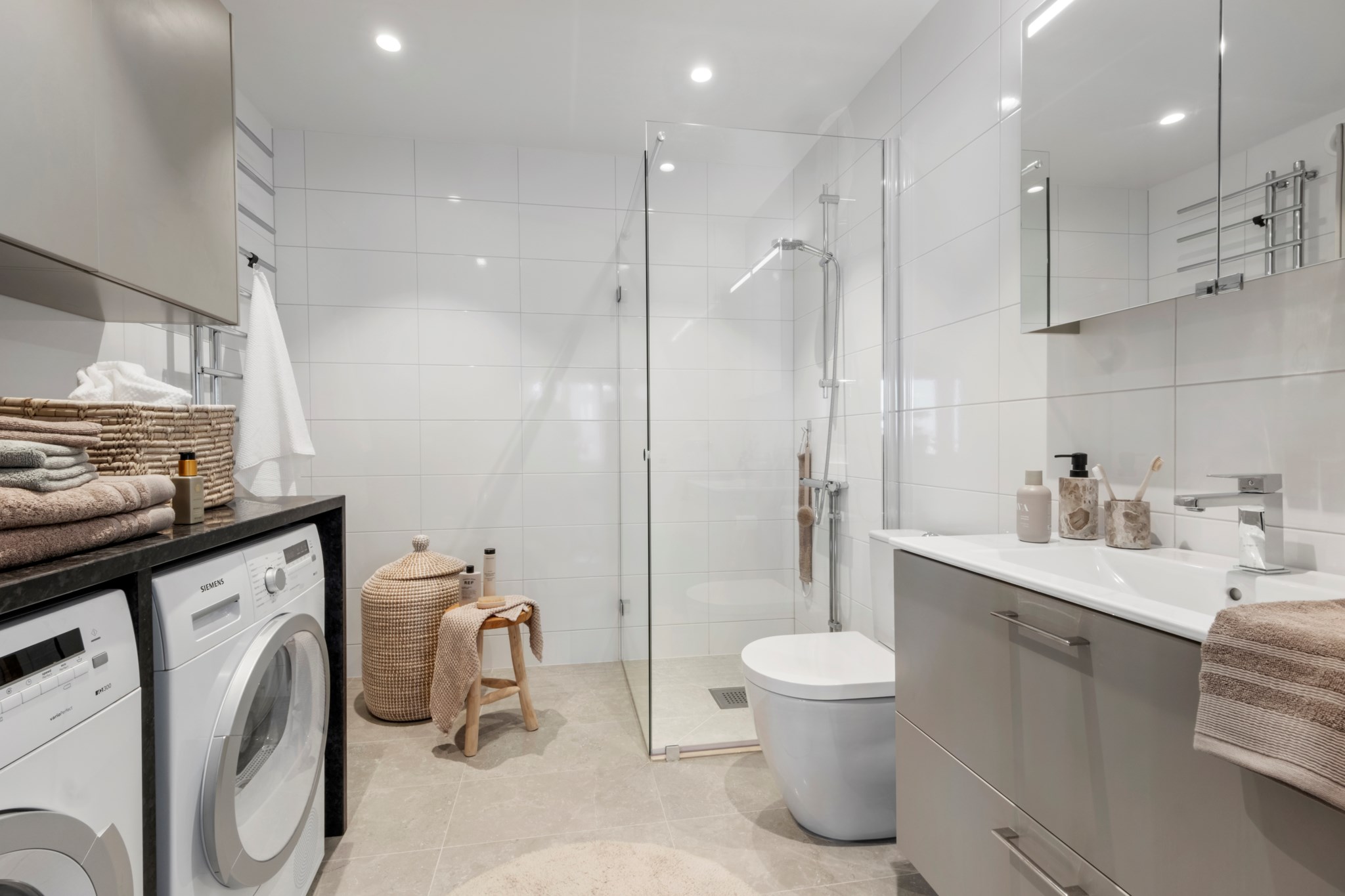 Stilrent badrum utrustat med dusch, wc, handfat med kommod samt egen tvättdel med tvättmaskin och torktumlare. Smakfulla materialval och funktionella lösningar som förenklar vardagen.