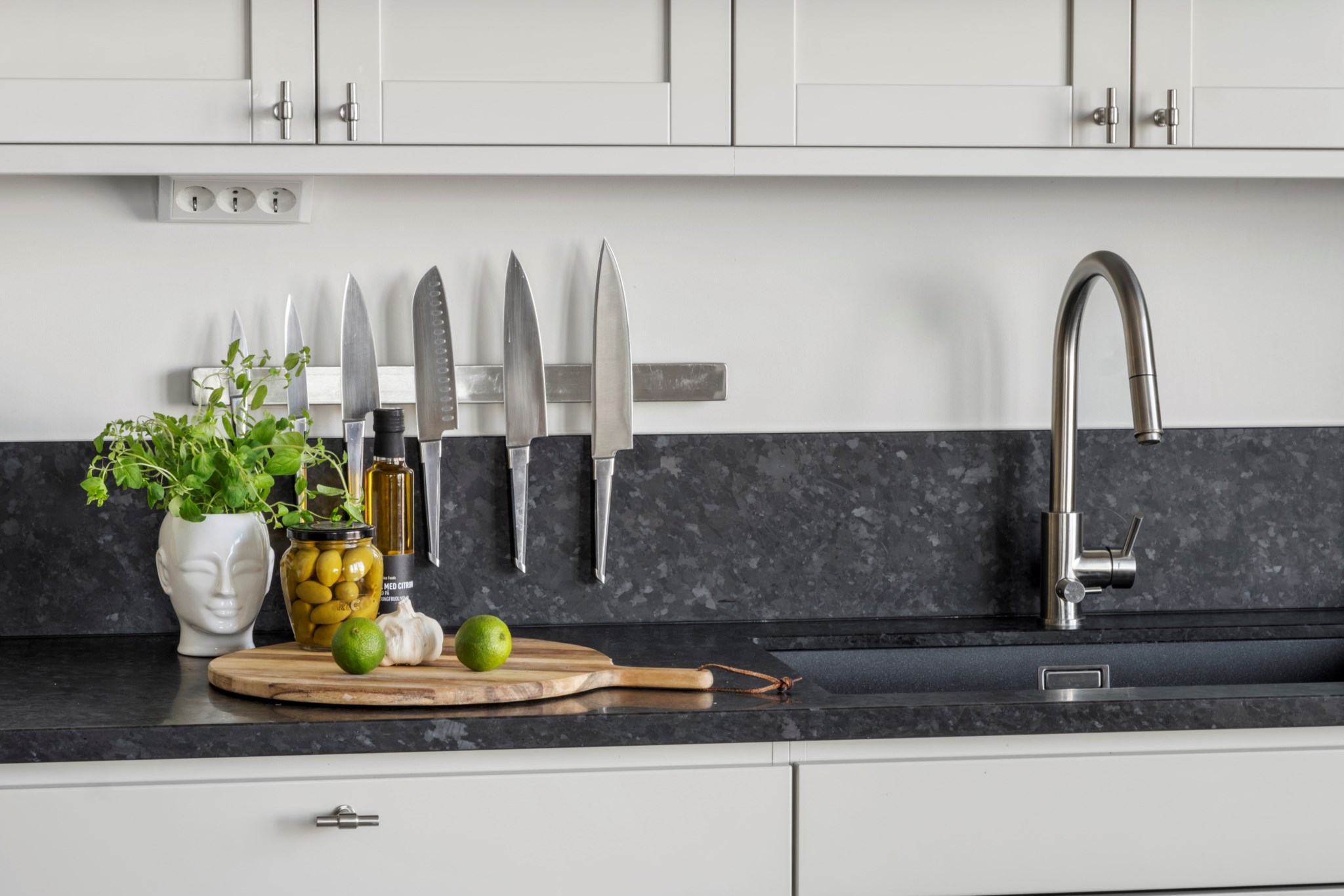 Smakfullt kök med nya luckor, köksö, bänkskivor i sten samt ny maskinpark, inklusive spishäll med integrerad fläkt.