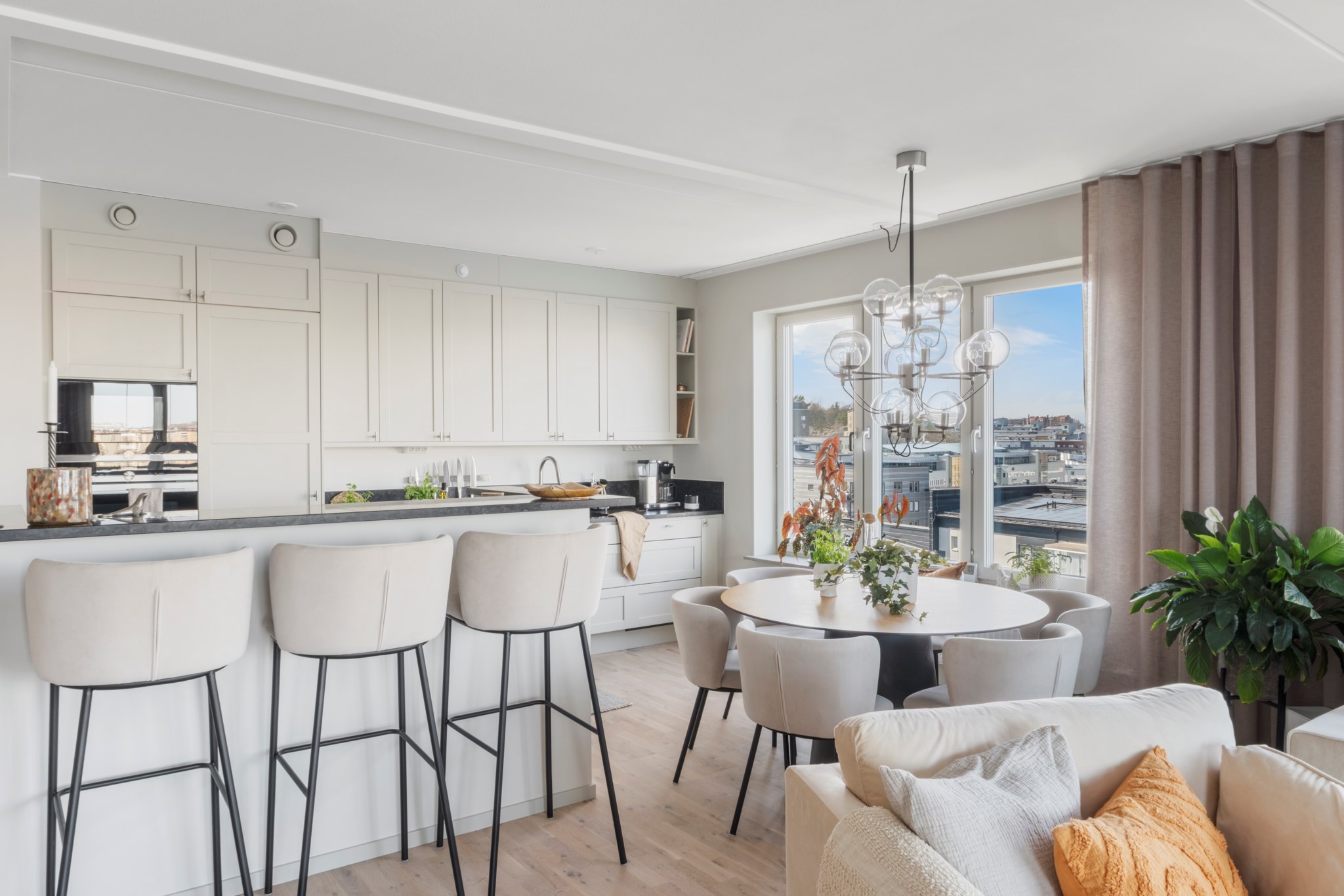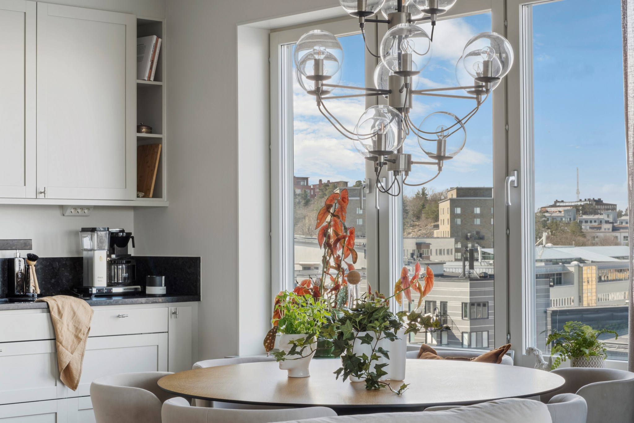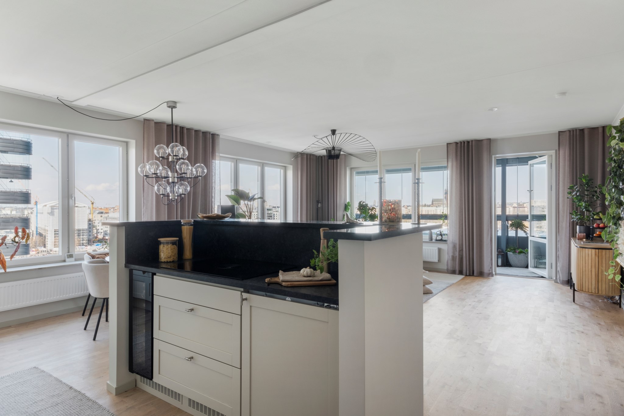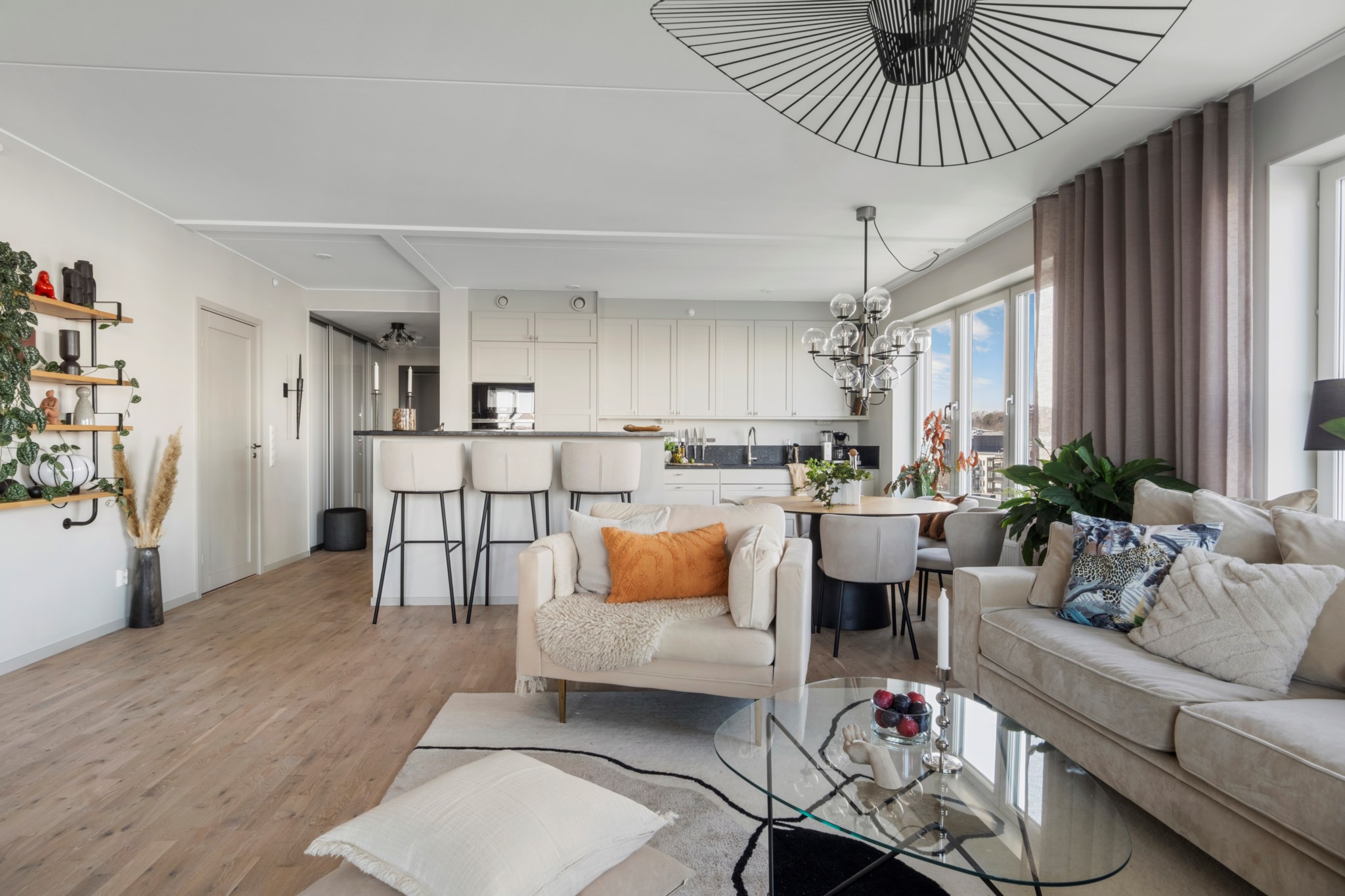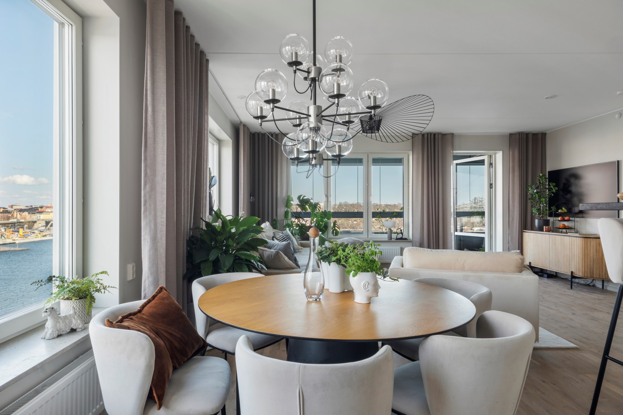 Invändigt möts du av en stilfull och genomtänkt bostad med en öppen, social planlösning där kök och vardagsrum samspelar i en elegant helhet. De stora fönsterpartierna släpper in rikligt med ljus och förstärker känslan av rymd samtidigt som de ramar in den spektakulära utsikten. Materialvalen är noggrant utvalda.