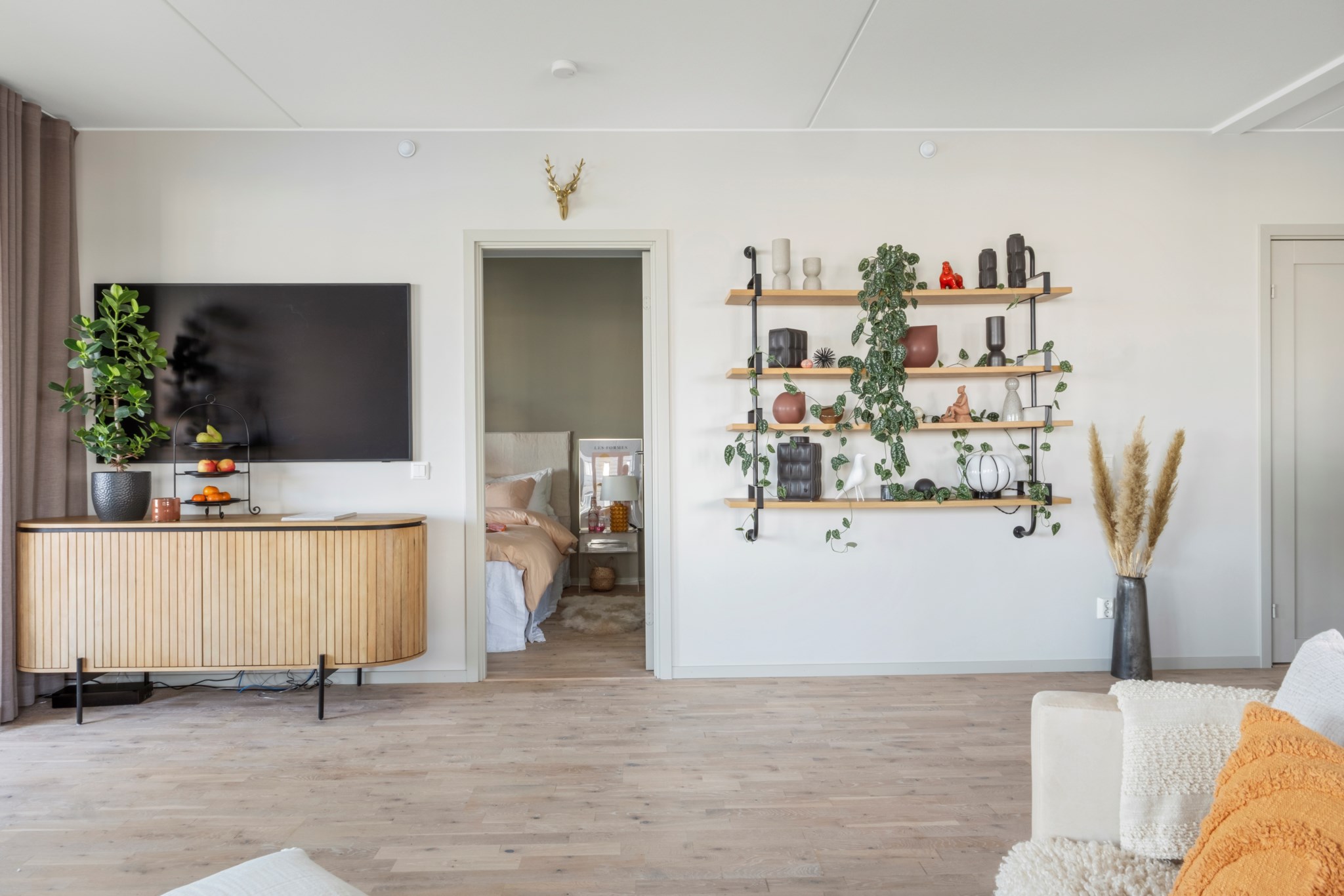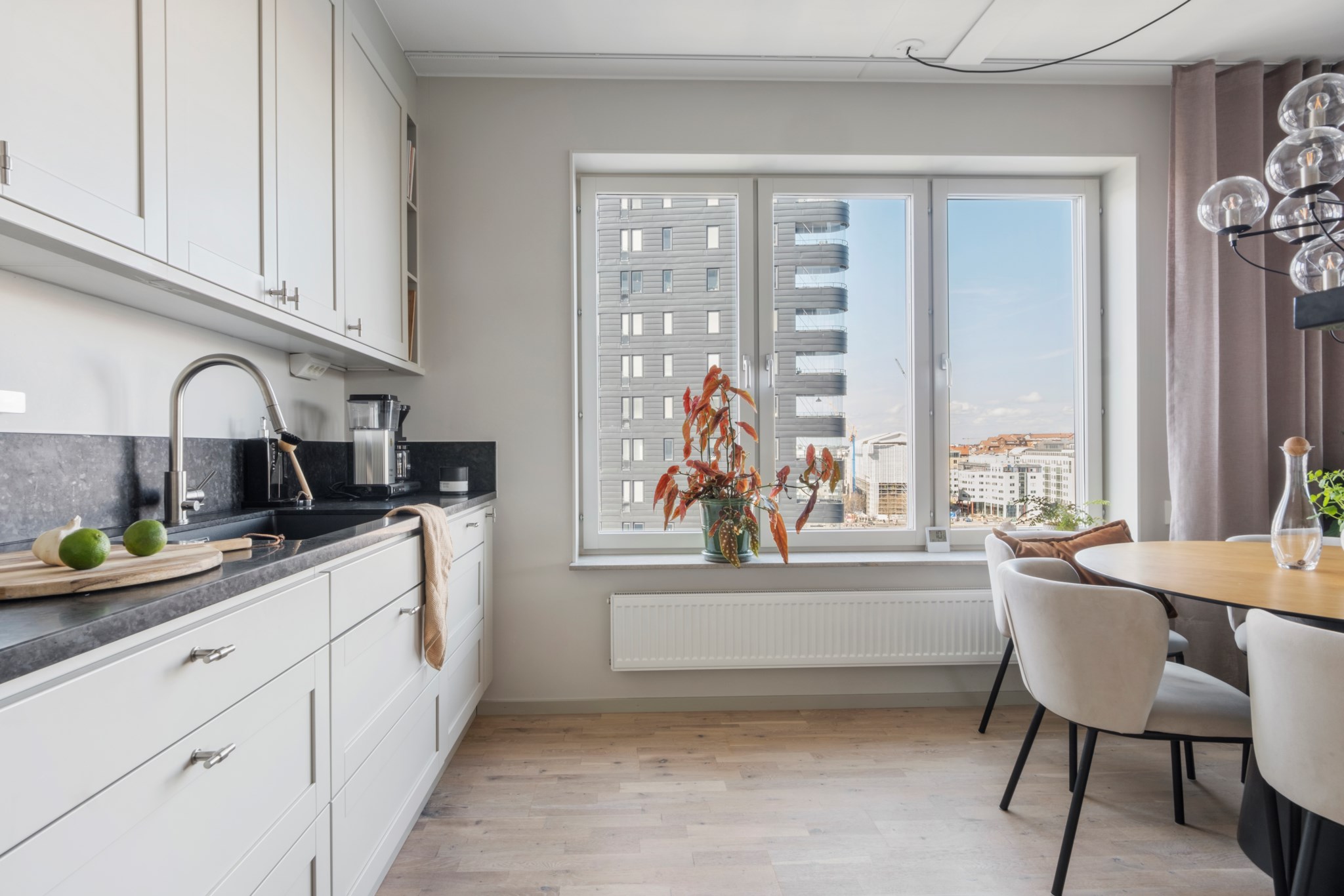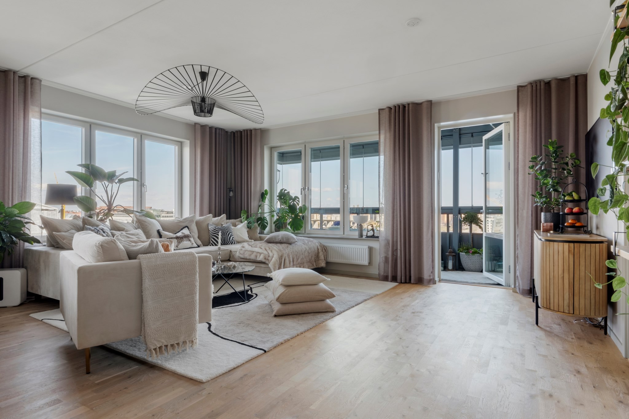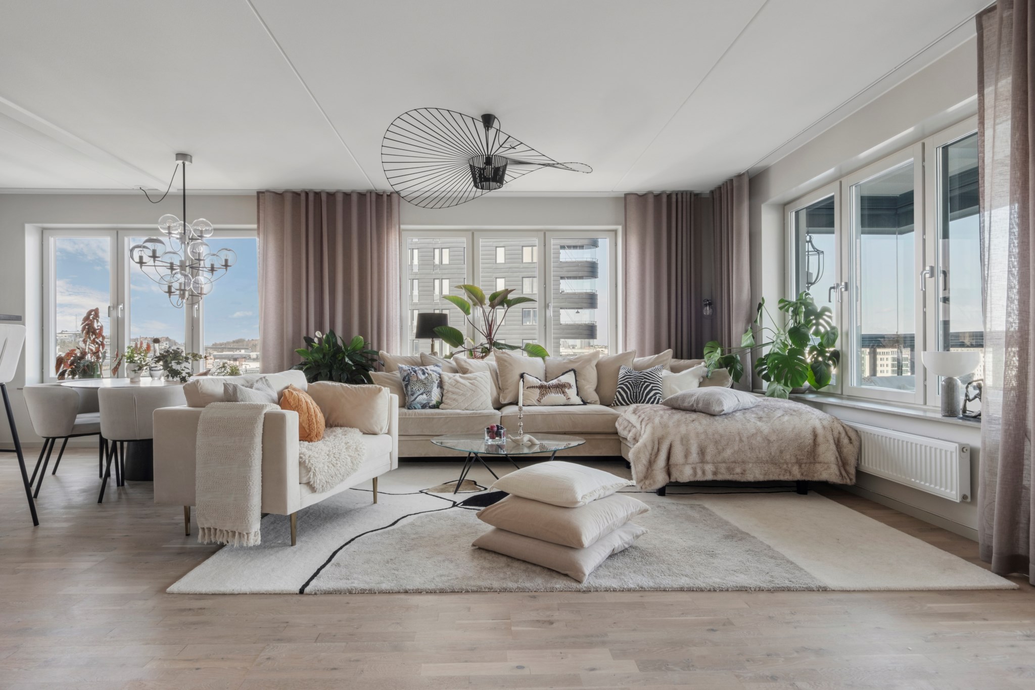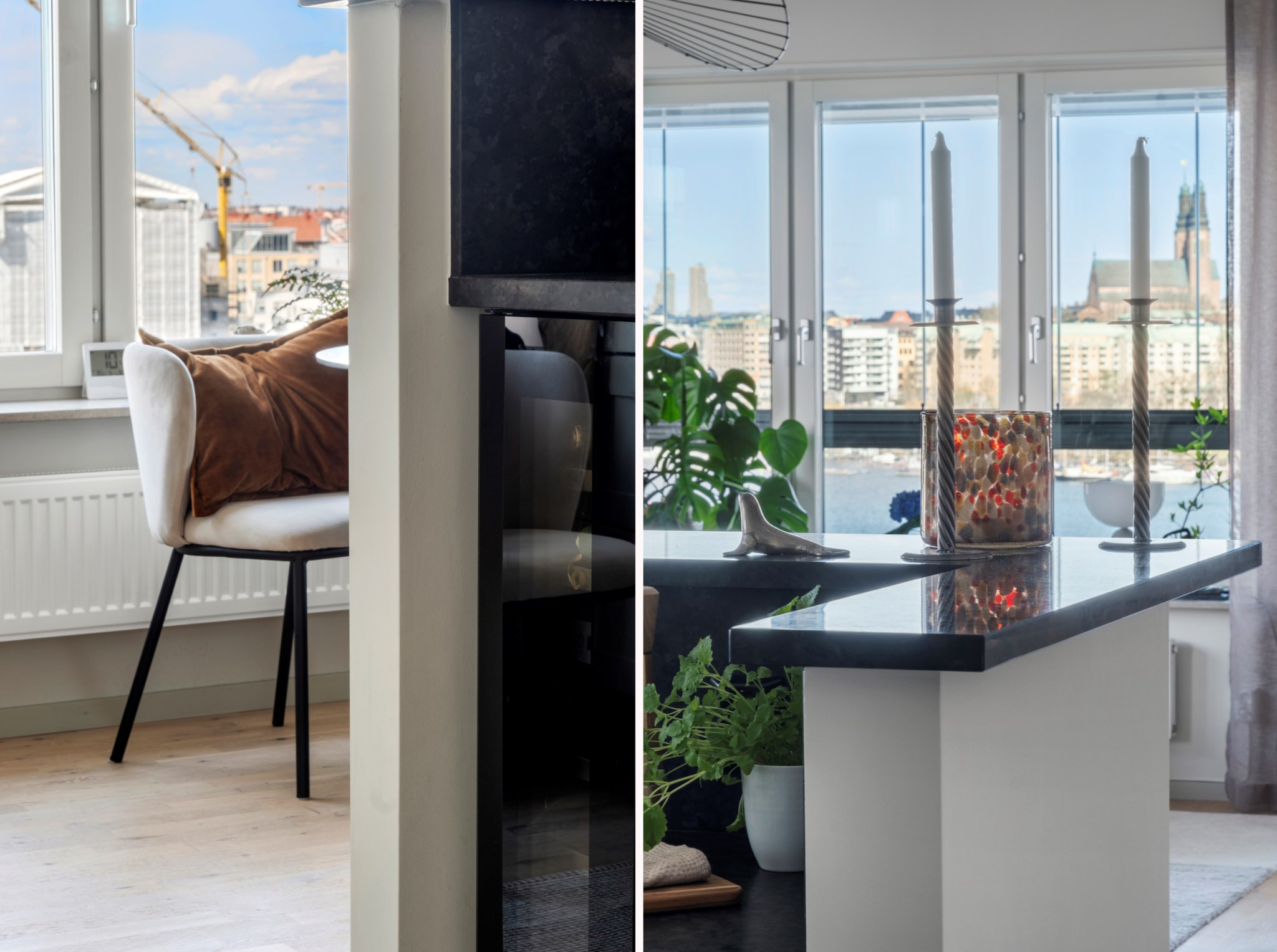 Invändigt möts du av en stilfull och genomtänkt bostad med en öppen, social planlösning där kök och vardagsrum samspelar i en elegant helhet. De stora fönsterpartierna släpper in rikligt med ljus och förstärker känslan av rymd samtidigt som de ramar in den spektakulära utsikten. Materialvalen är noggrant utvalda.