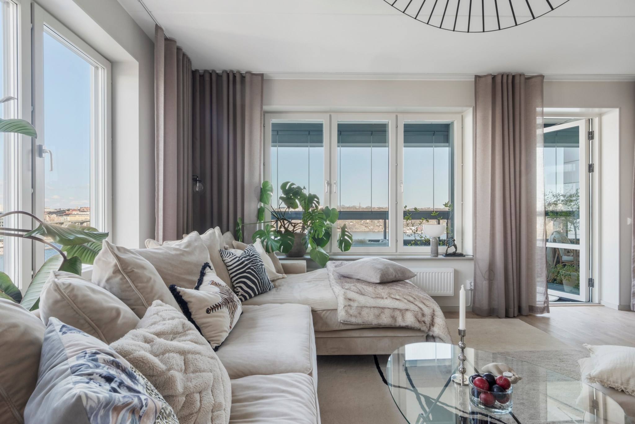 Ljust och luftigt vardagsrum med stora fönsterpartier i attraktivt läge mot vattnet. Här skapas en naturlig samlingspunkt med plats för både soffgrupp och sociala ytor. Direkt access till den stora balkongen förstärker känslan av rymd och exklusivitet. Vacker utsikt över vattnet från vardagsrummet.