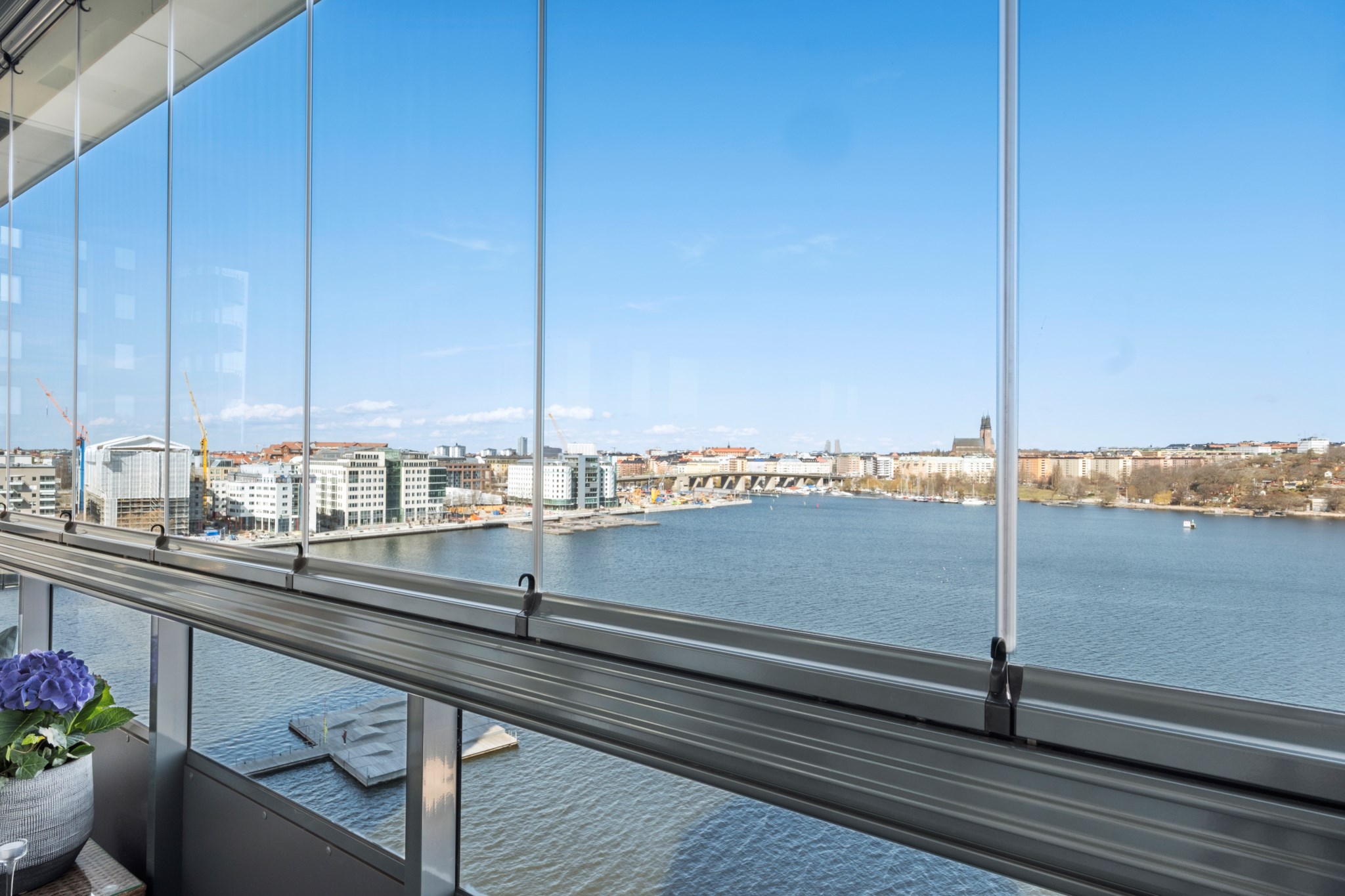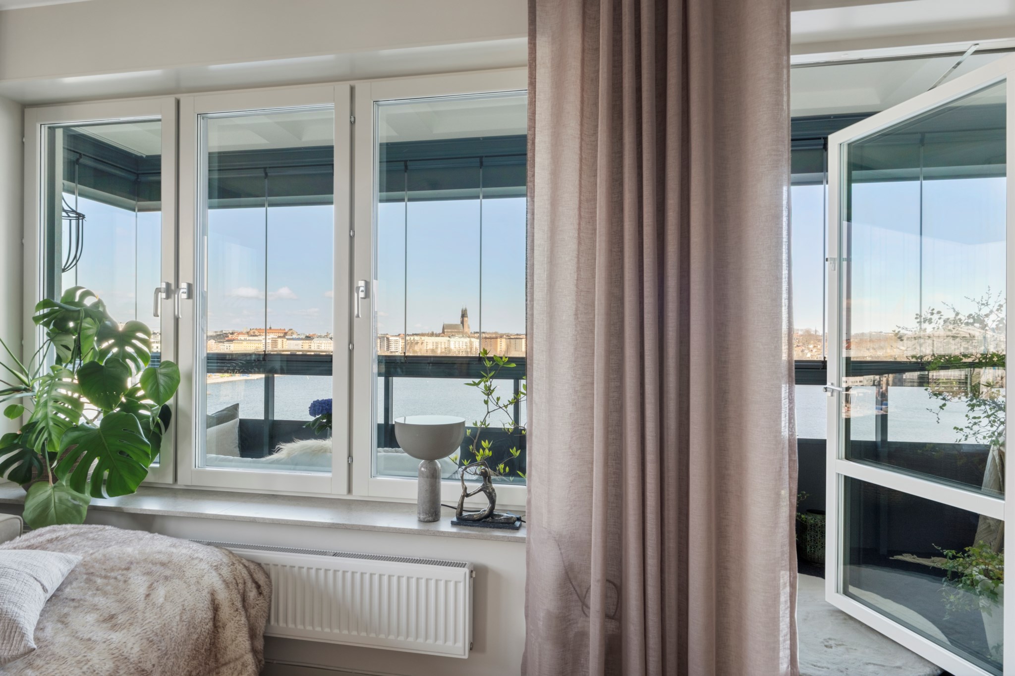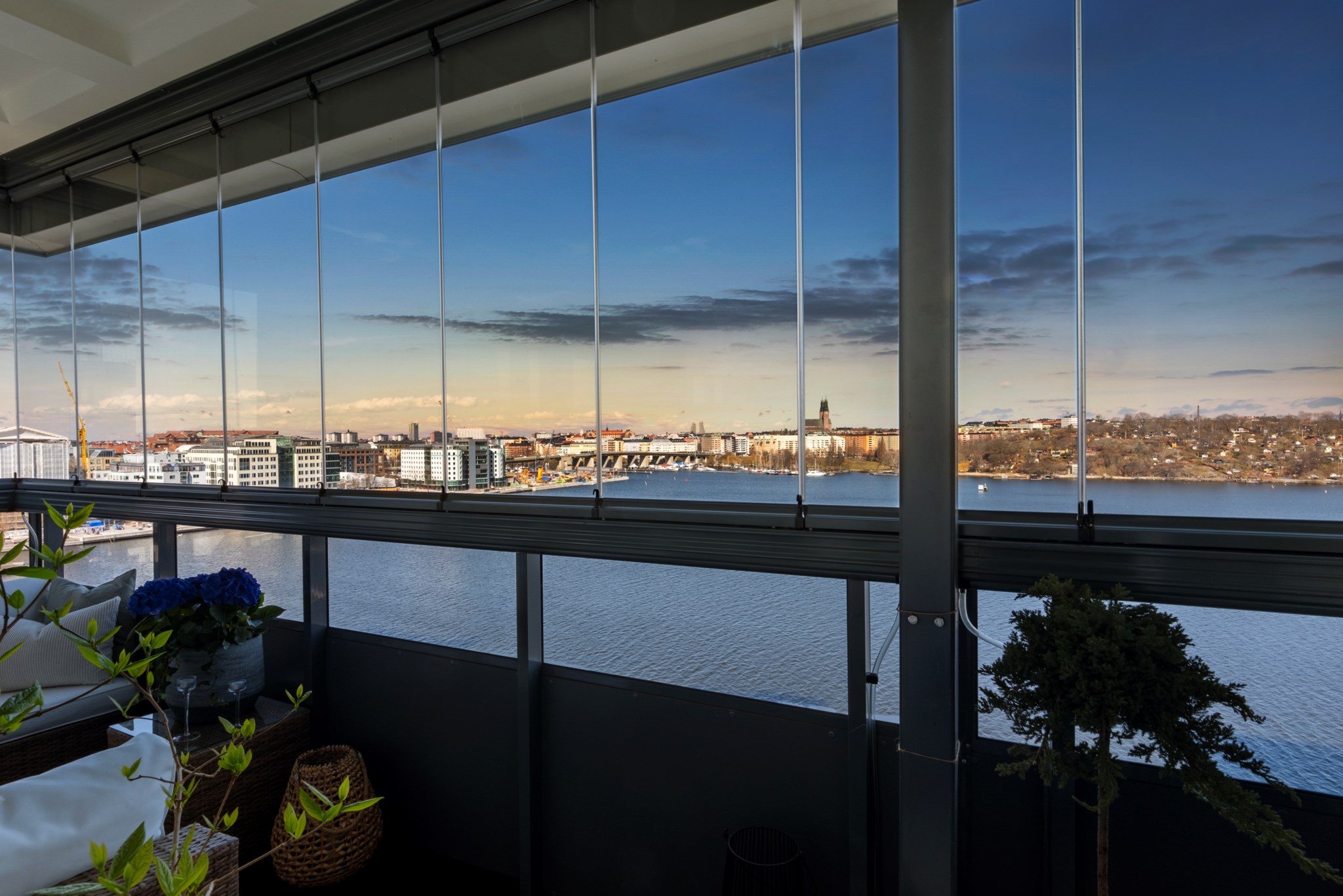Stor och högt belägen inglasad balkong i frontläge mot Årstaviken. Här erbjuds en fri och vidsträckt utsikt över vatten och grönska, med gott om plats för både loungemöbler och matgrupp. En perfekt plats för avkoppling och sociala stunder.
