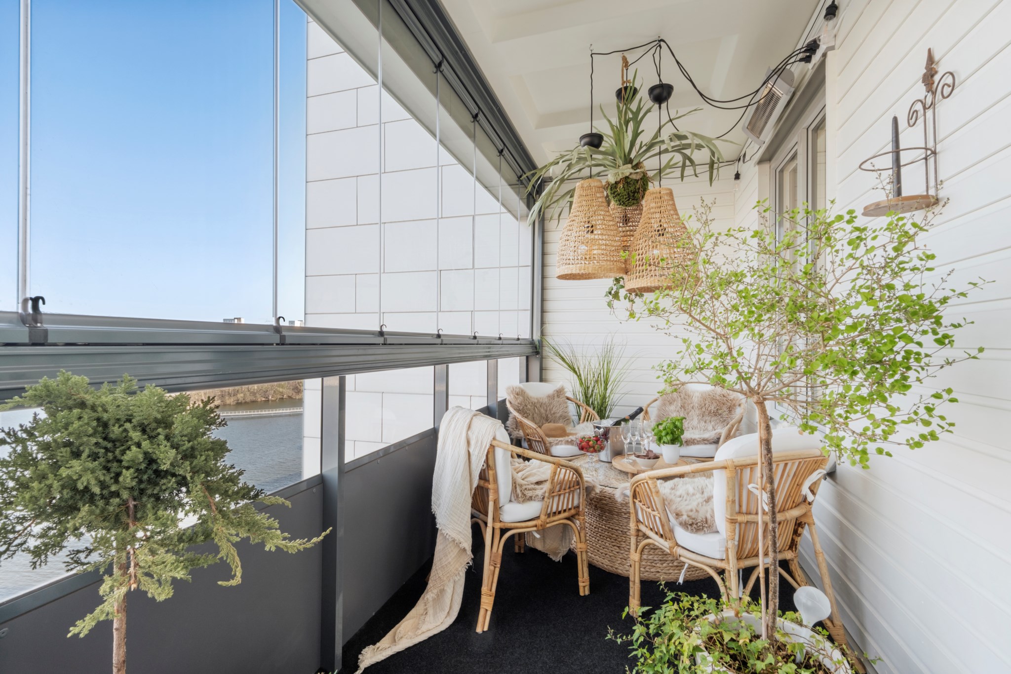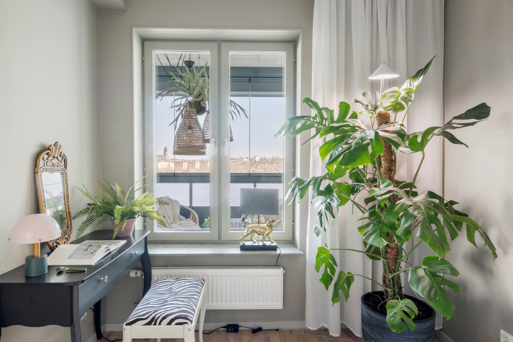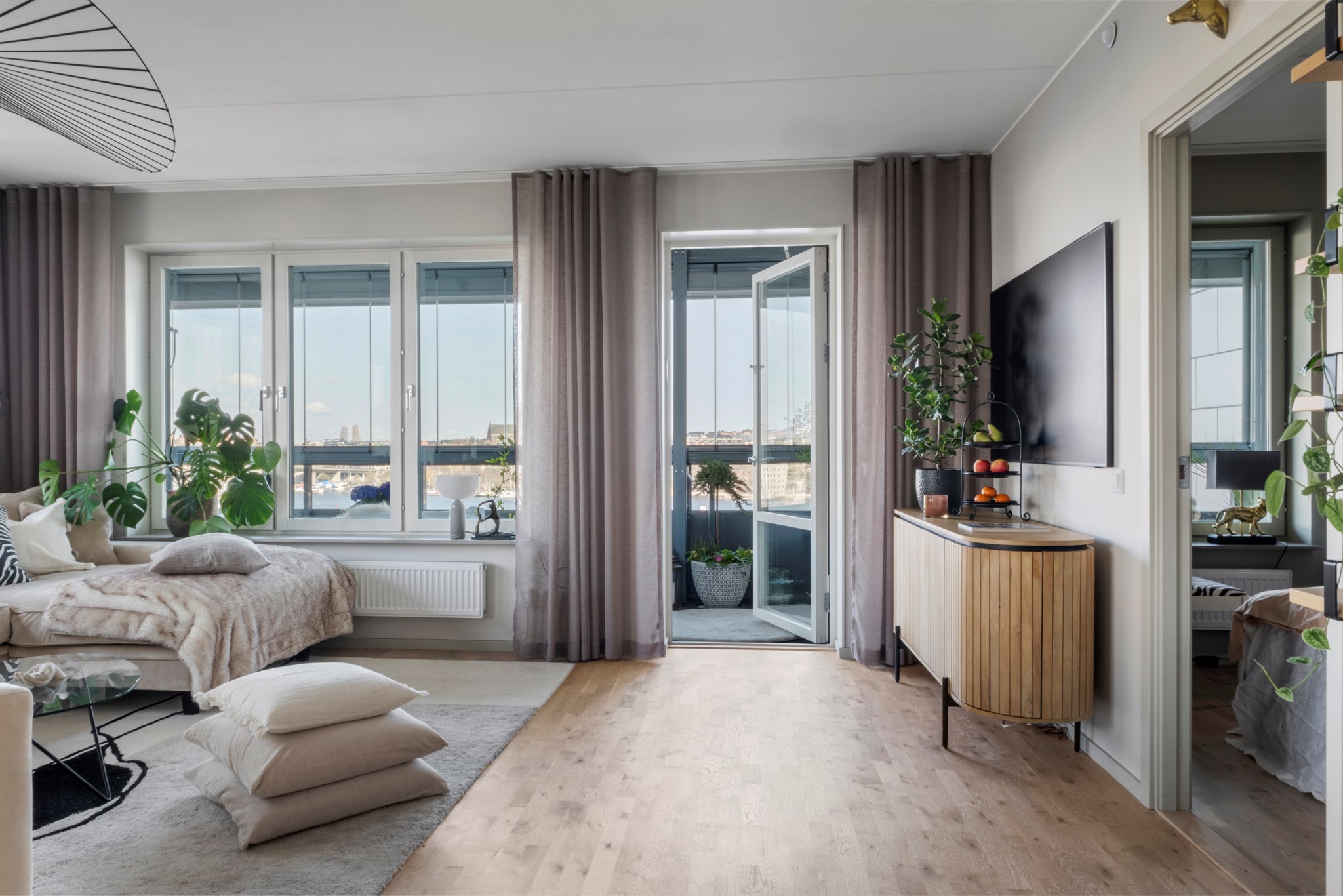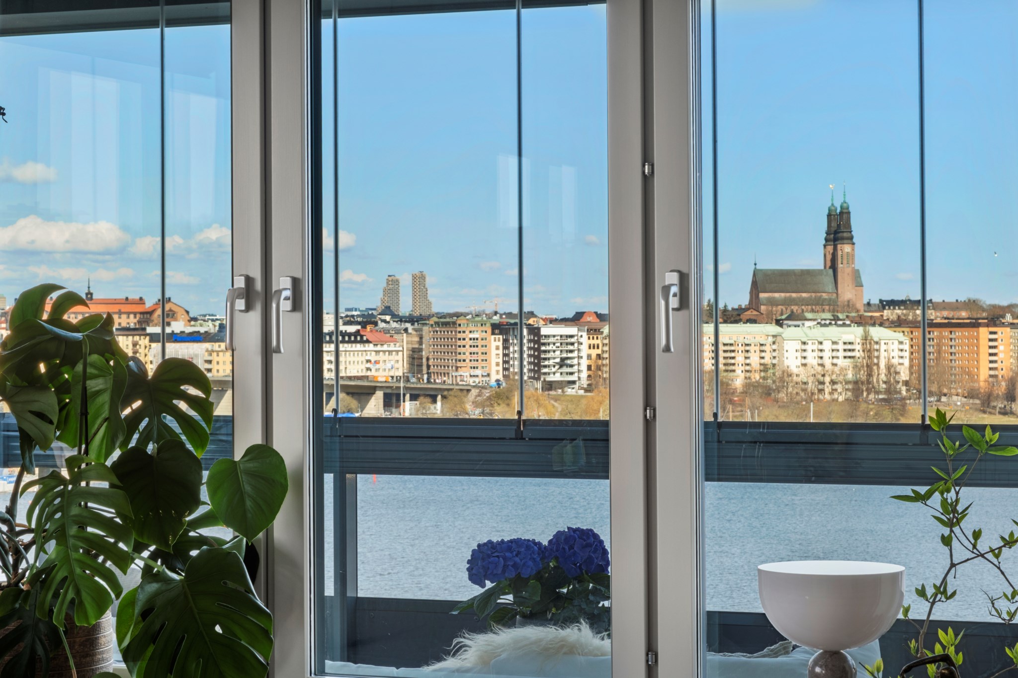 Stor och högt belägen inglasad balkong i frontläge mot Årstaviken. Här erbjuds en fri och vidsträckt utsikt över vatten och grönska, med gott om plats för både loungemöbler och matgrupp. En perfekt plats för avkoppling och sociala stunder.