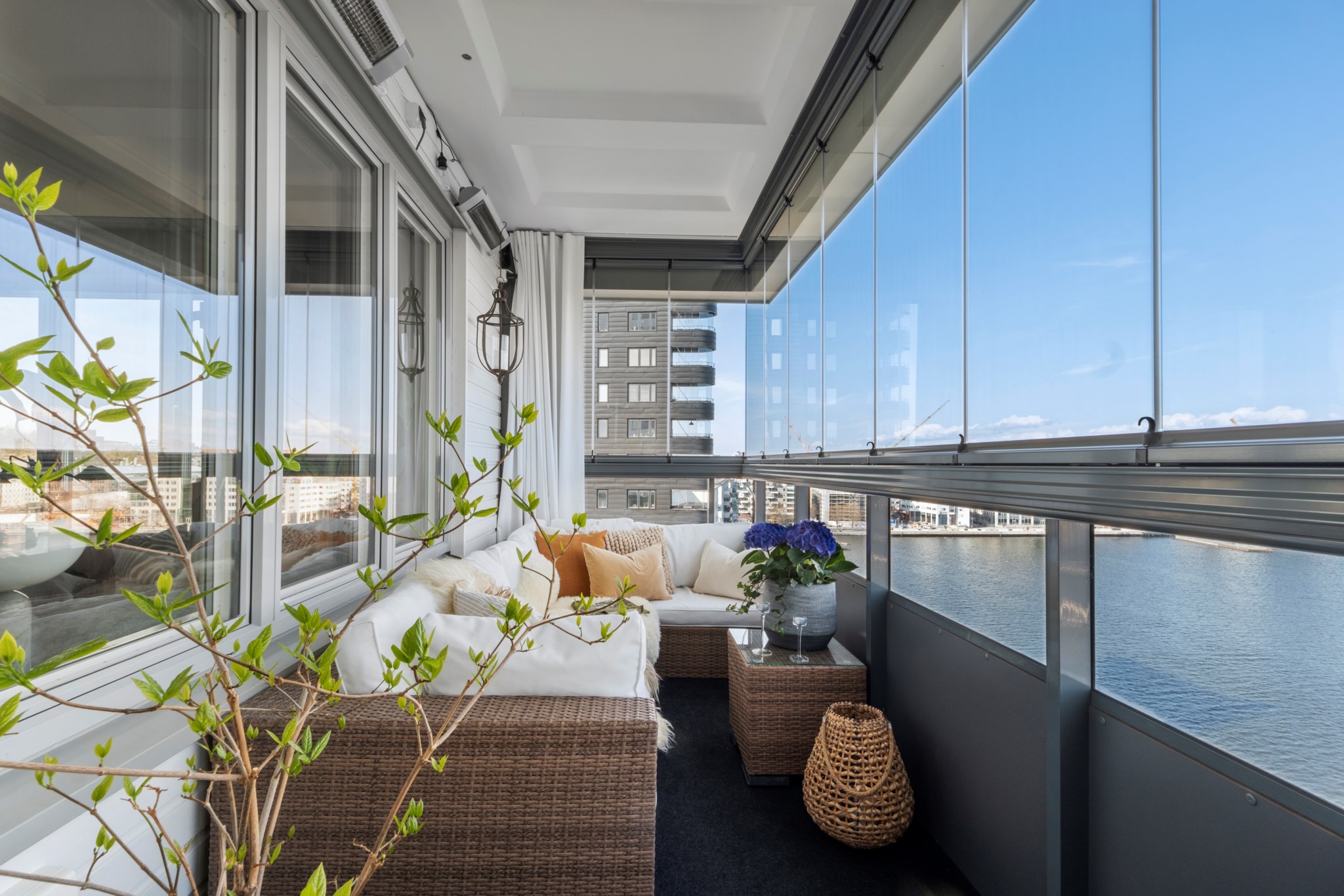 Den generösa inglasade balkongen ligger i perfekt frontposition mot vattnet och fungerar som ett extra vardagsrum under årets varmare månader. Här njuter du av sol, lugnet från vattnet och magiska solnedgångar, en plats som snabbt blir hemmets självklara favorit.