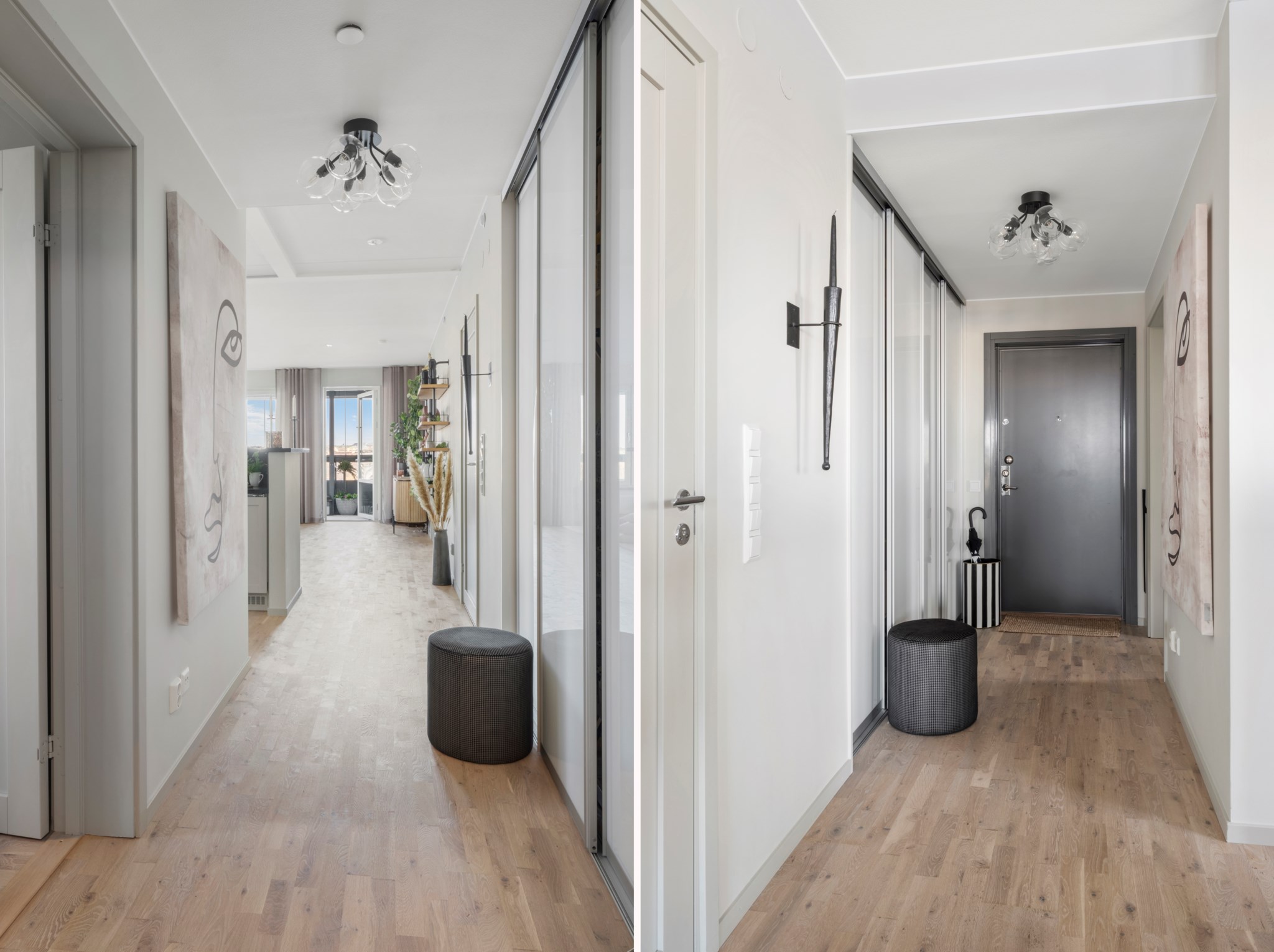 Välkomnande och rymlig hall med goda avhängningsmöjligheter direkt innanför dörren. Här finns praktisk förvaring och en stilren känsla som sätter tonen för resten av bostaden.