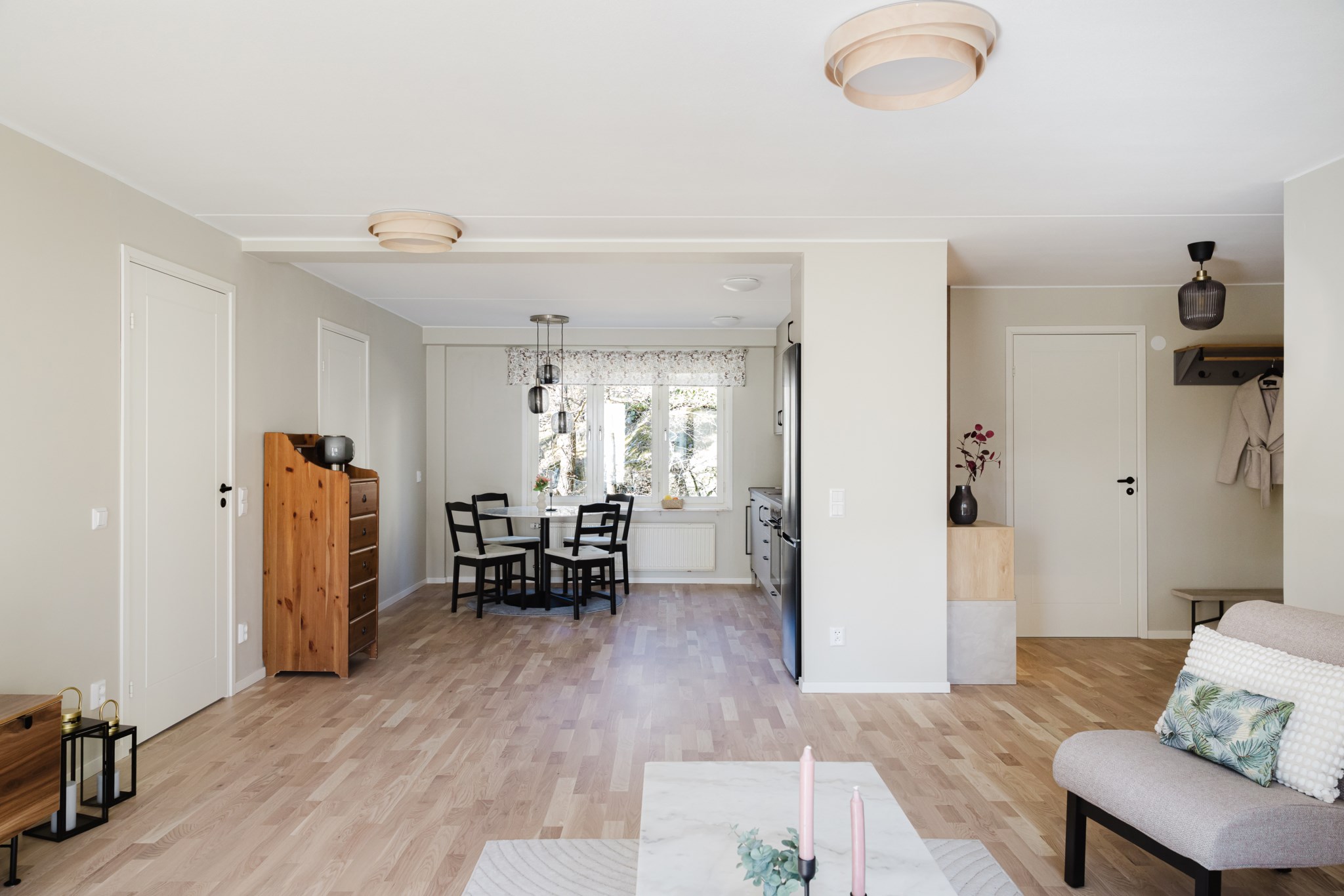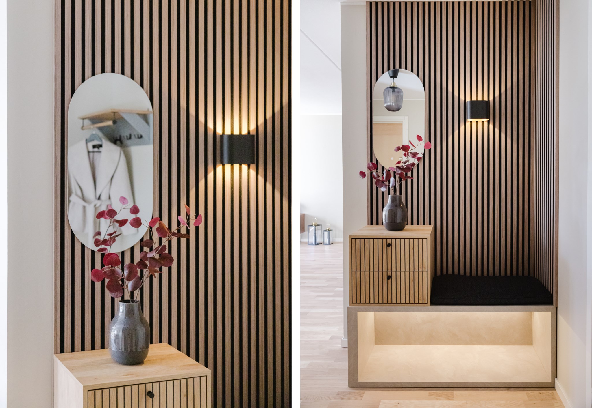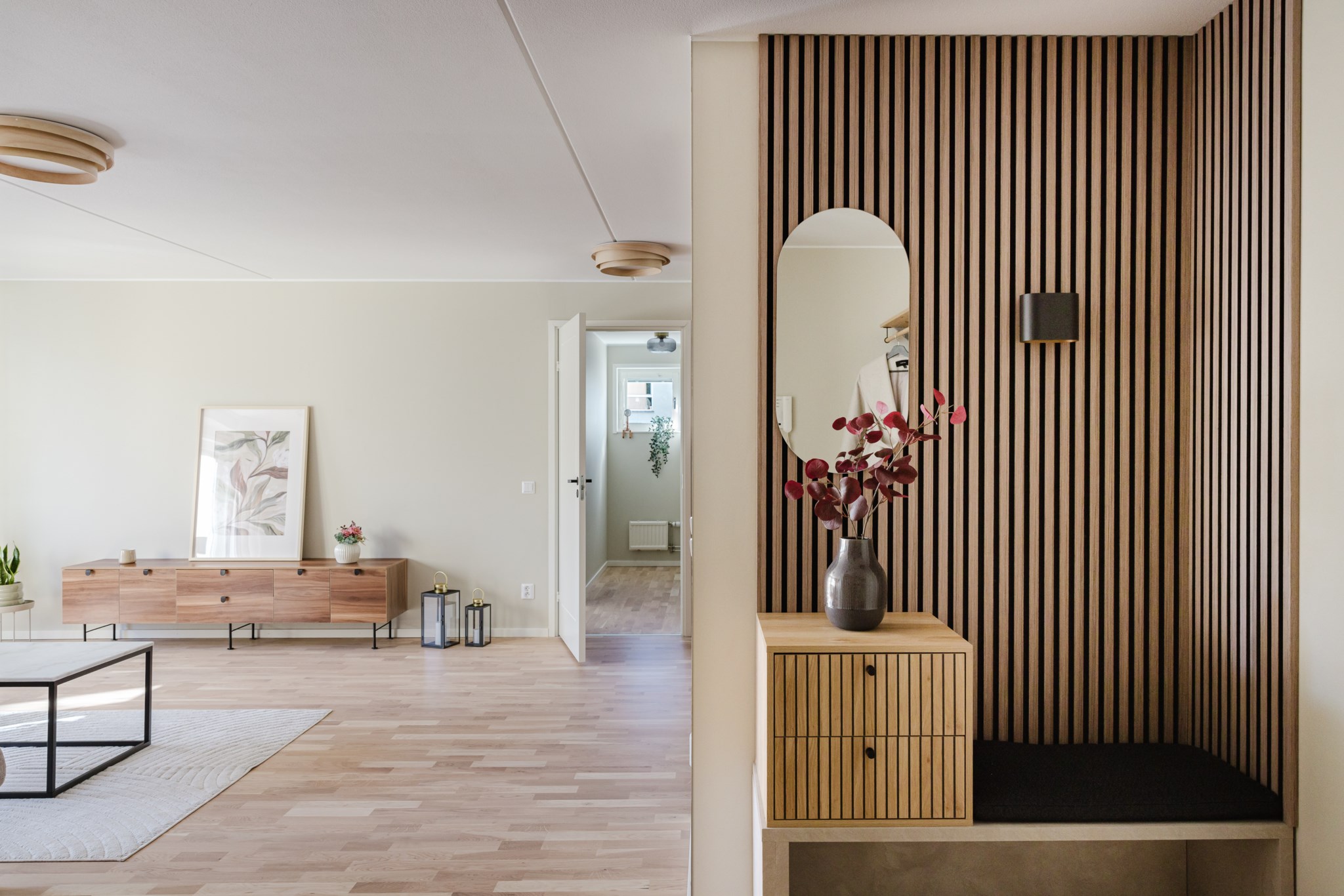 Redan när du kliver in möts du av en varm och modern känsla. Hallen är smart planerad med gott om förvaring och en rymlig klädkammare som gör vardagen enkel. Den platsbyggda sittbänken med belysning ger både funktion och en exklusiv känsla direkt vid entrén. Modern ljus färgsättning och fint parkettgolv löper vidare in i bostaden.