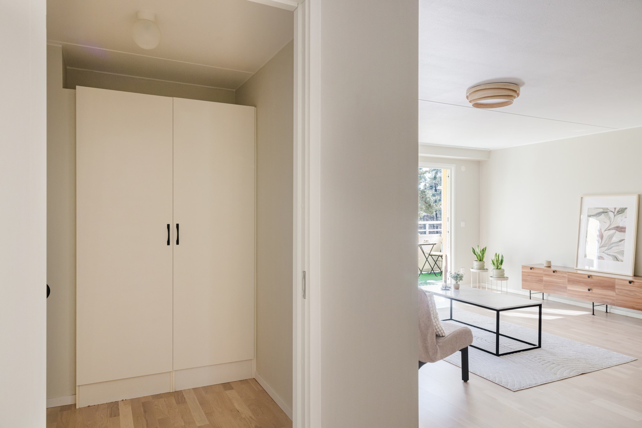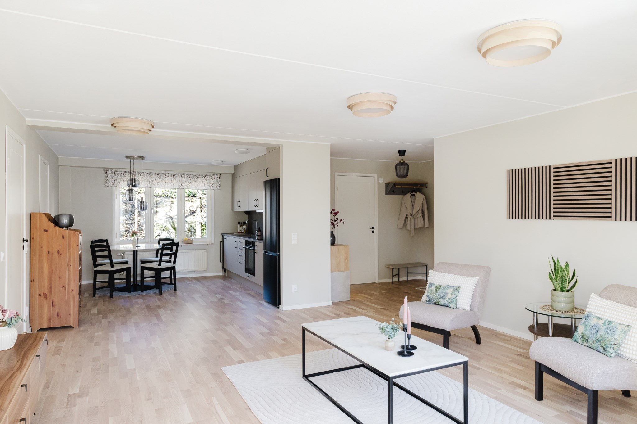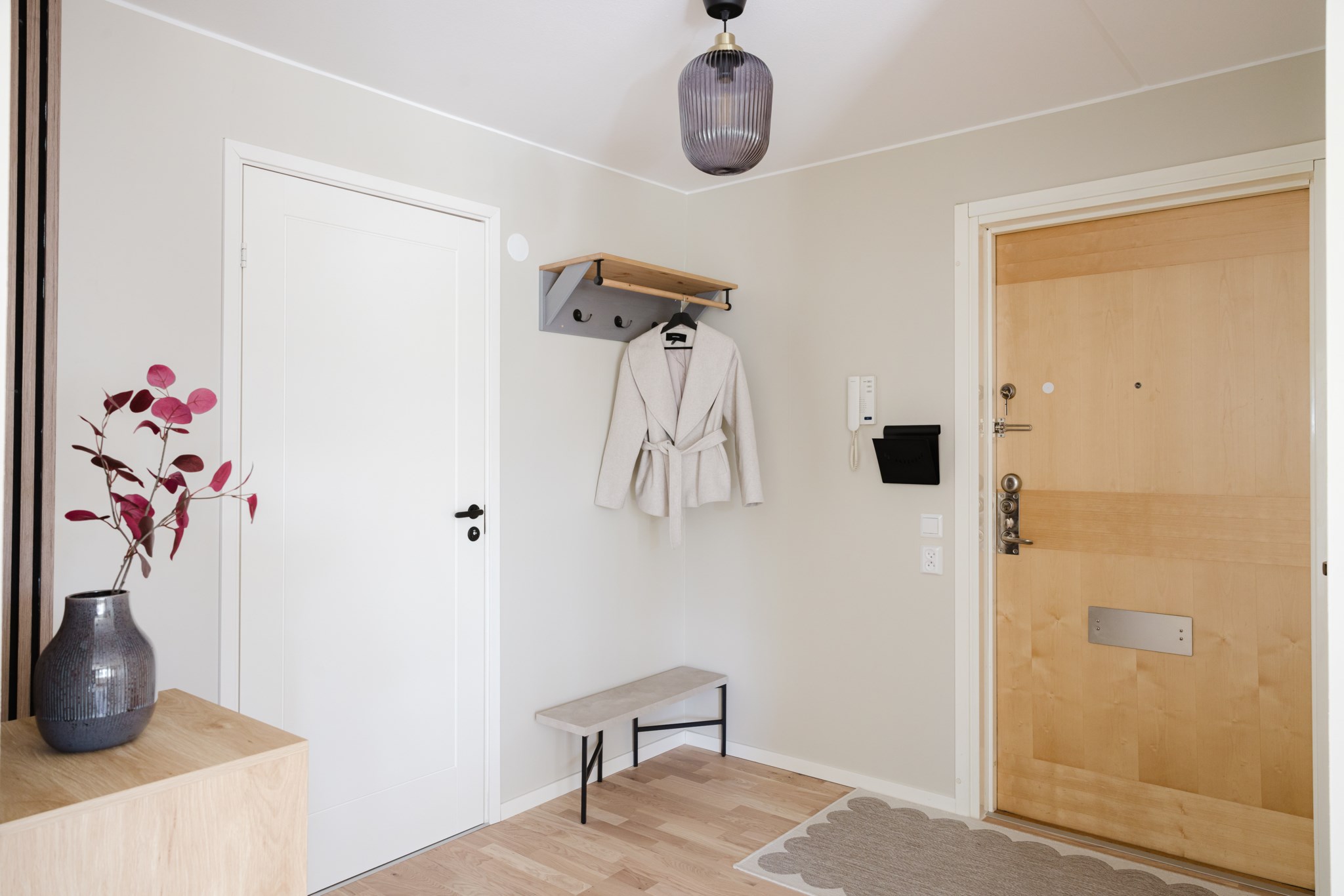 Redan när du kliver in möts du av en varm och modern känsla. Hallen är smart planerad med gott om förvaring och en rymlig klädkammare som gör vardagen enkel. Den platsbyggda sittbänken med belysning ger både funktion och en exklusiv känsla direkt vid entrén. Modern ljus färgsättning och fint parkettgolv löper vidare in i bostaden.