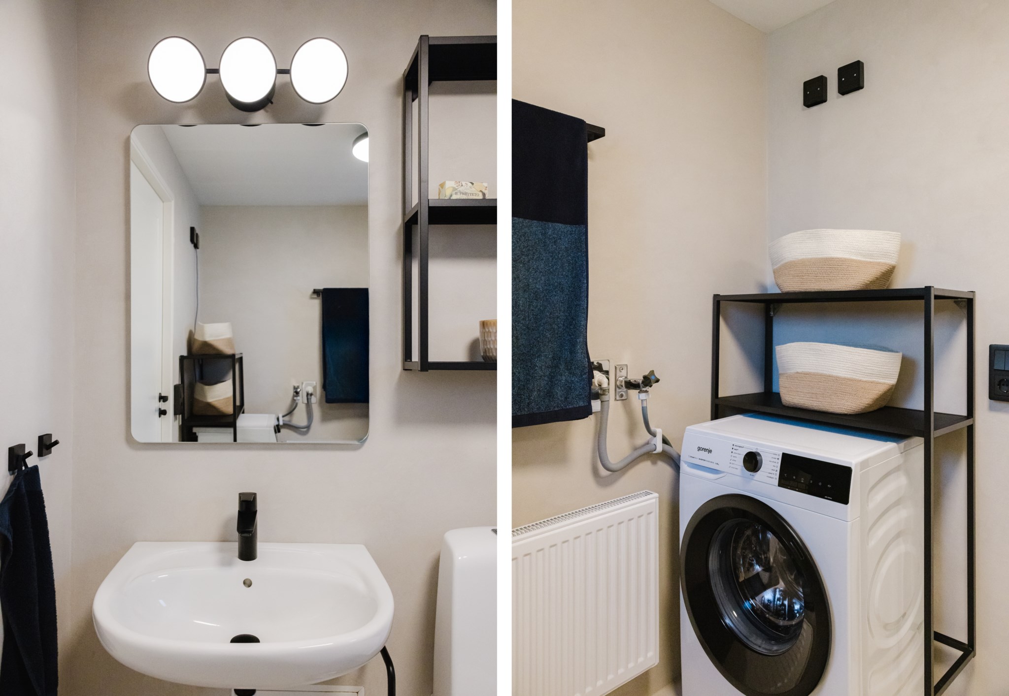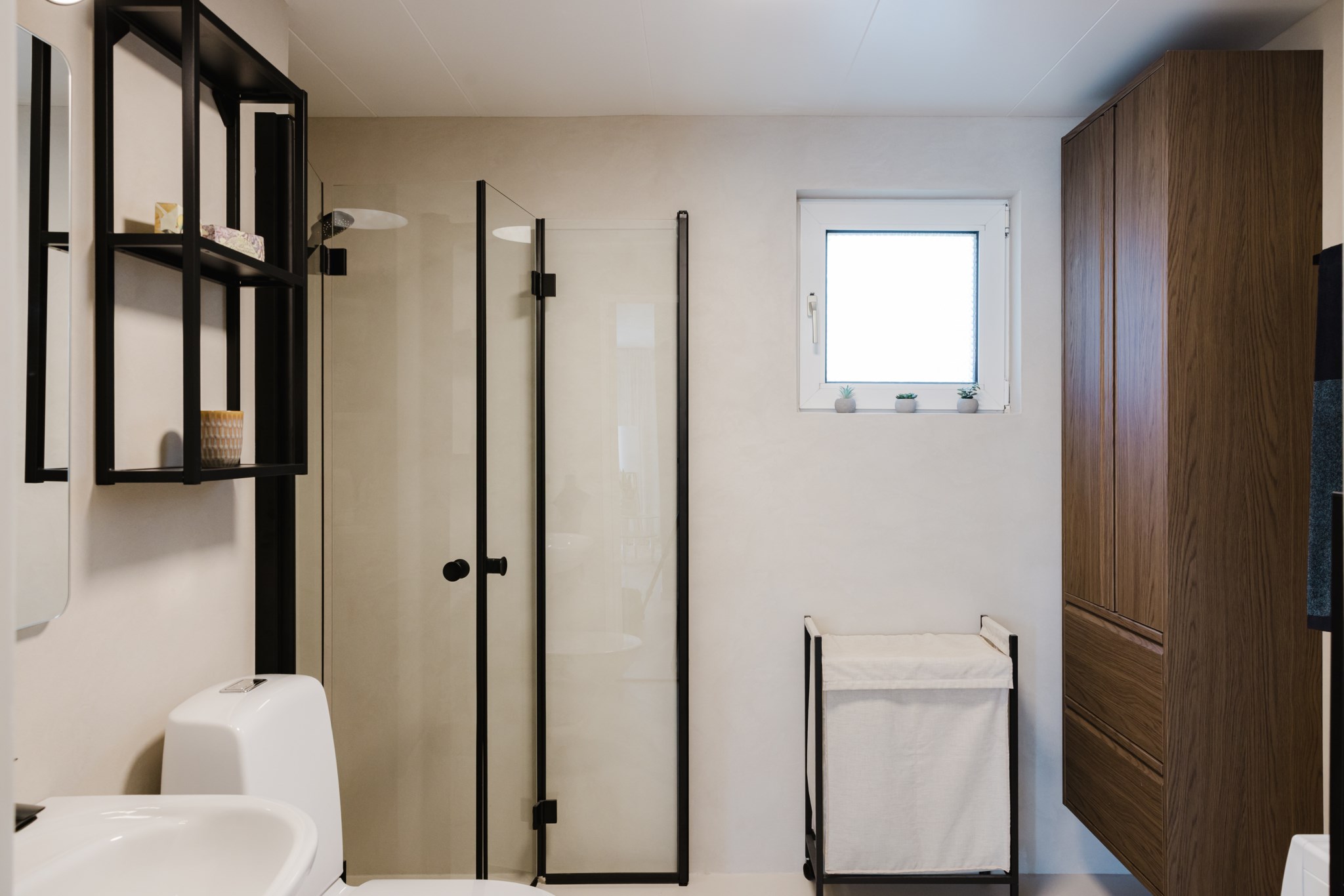 Exklusivt och modernt badrum med elegant färgsättning. Här finns plats för tvättmaskin, wc, handfat och snyggt spegelskåp. Stilrena materialval som ger en lyxig känsla i vardagen.