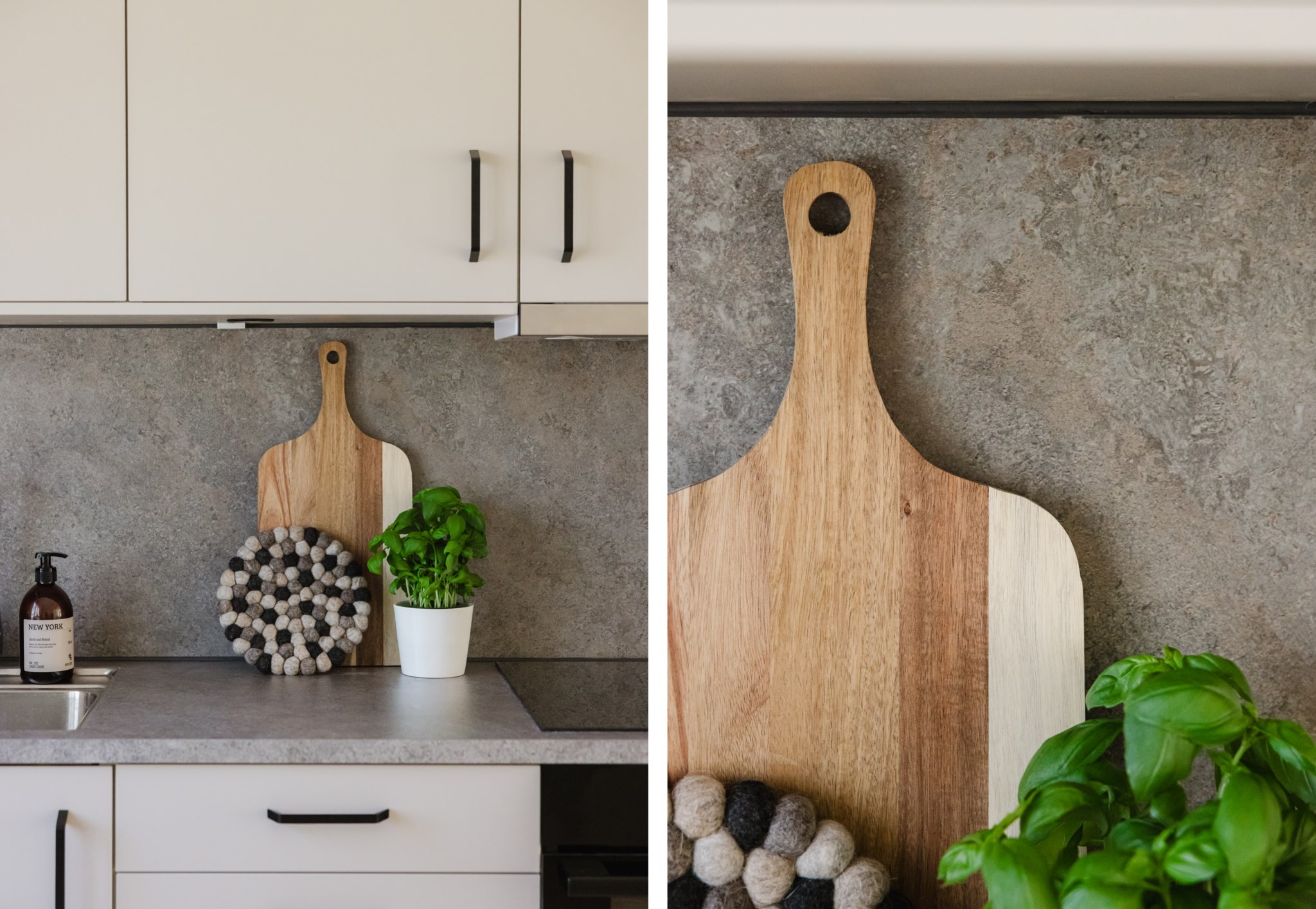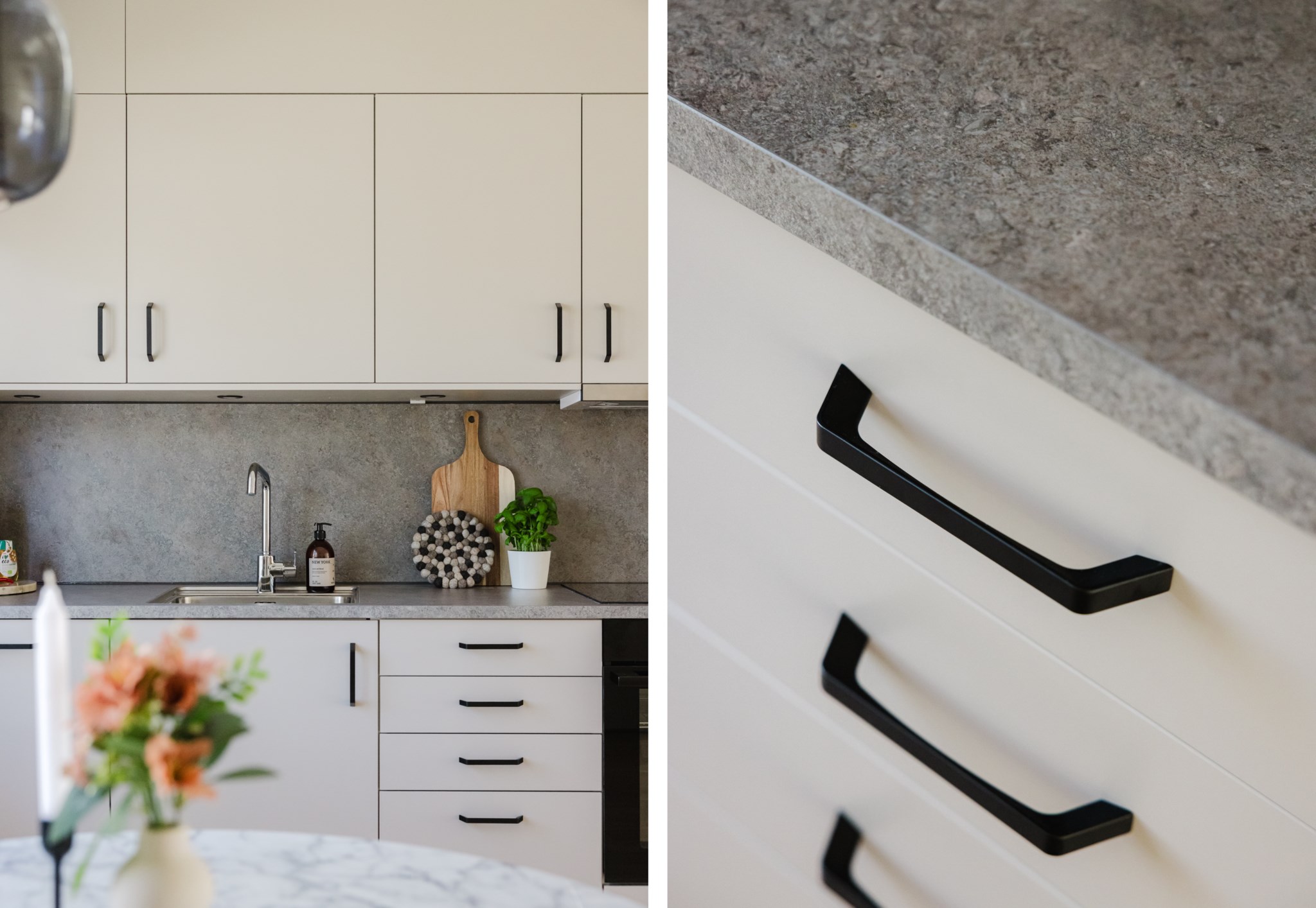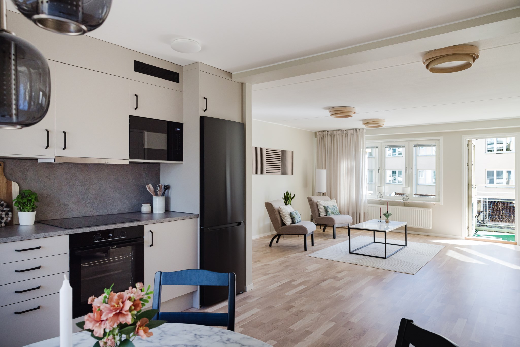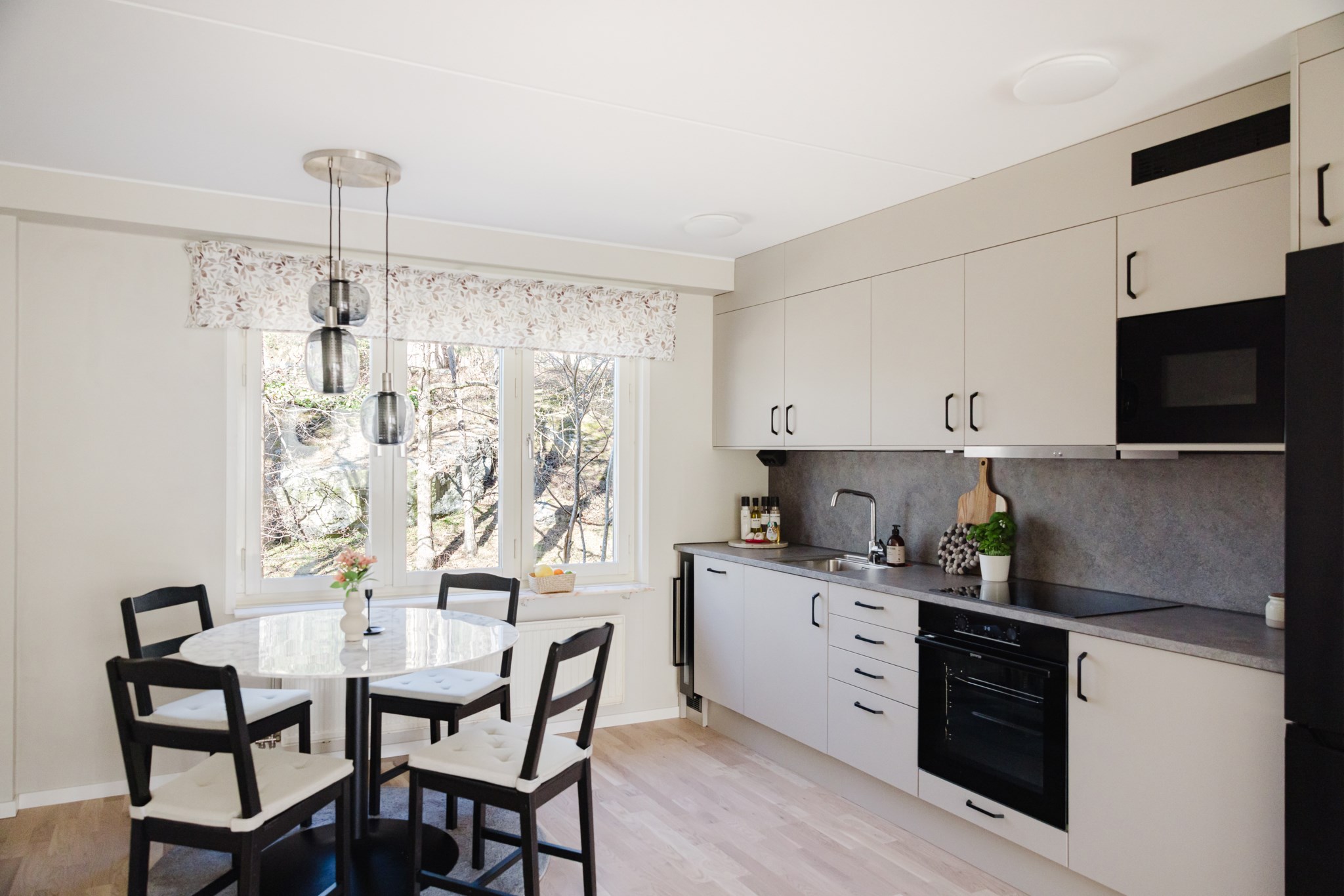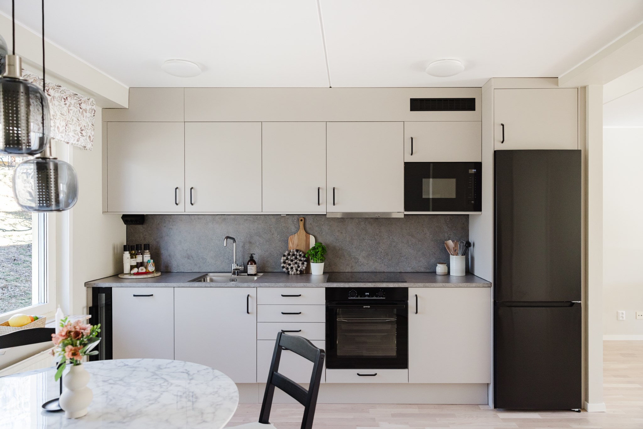 Det nyrenoverade köket från Epoq är stilrent, modernt och fullt utrustat. med bra arbetsytor och bra förvaring bakom grå skåpsluckor. Varje kvadratmeter är väl genomtänkt med flera smarta lösningar, snygg design möter smart funktionalitet. Den maskinella utrustningen består av induktionshäll, ugn, fläkt, kyl/frys, mikrovågsugn, diskmaskin och vinkyl.