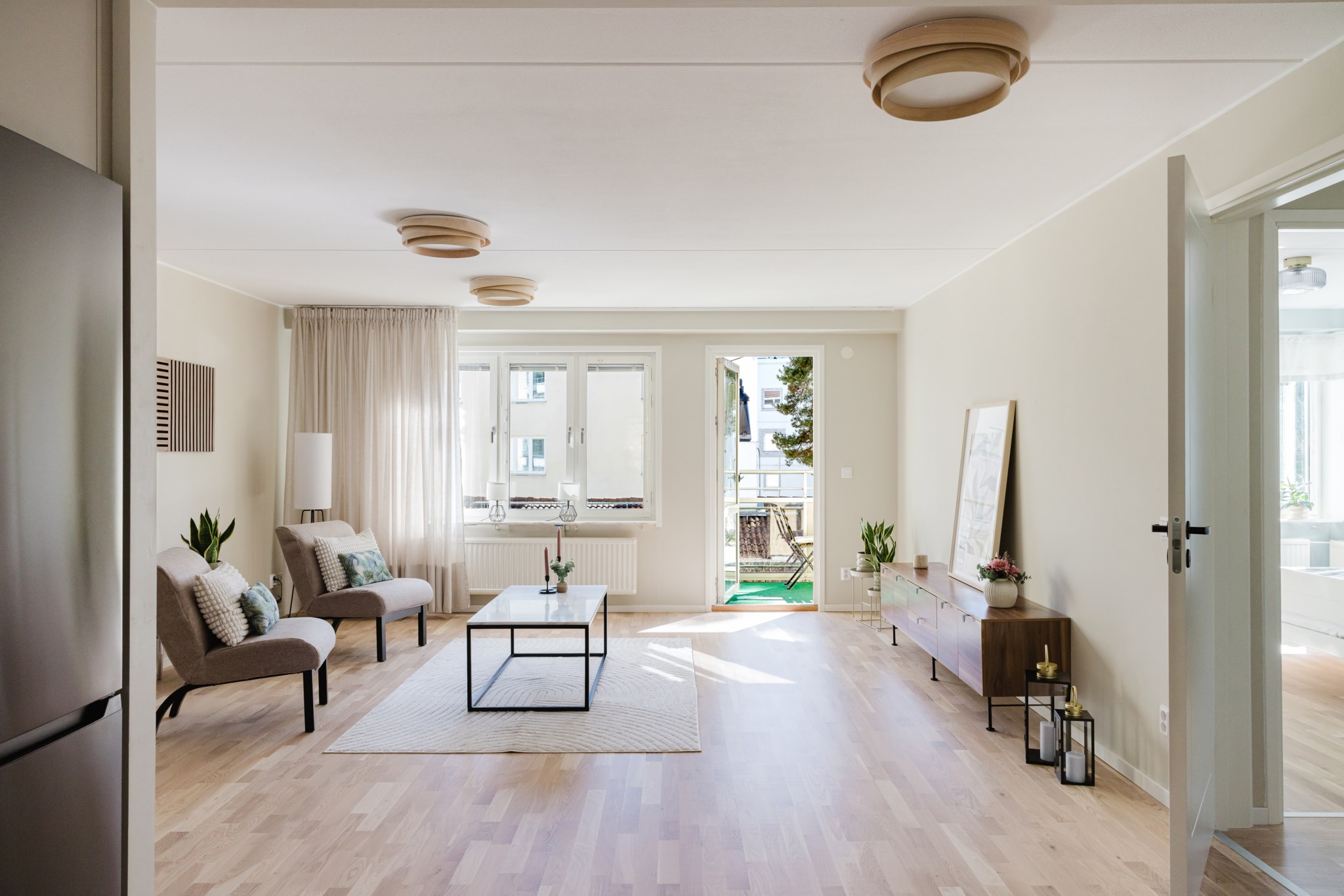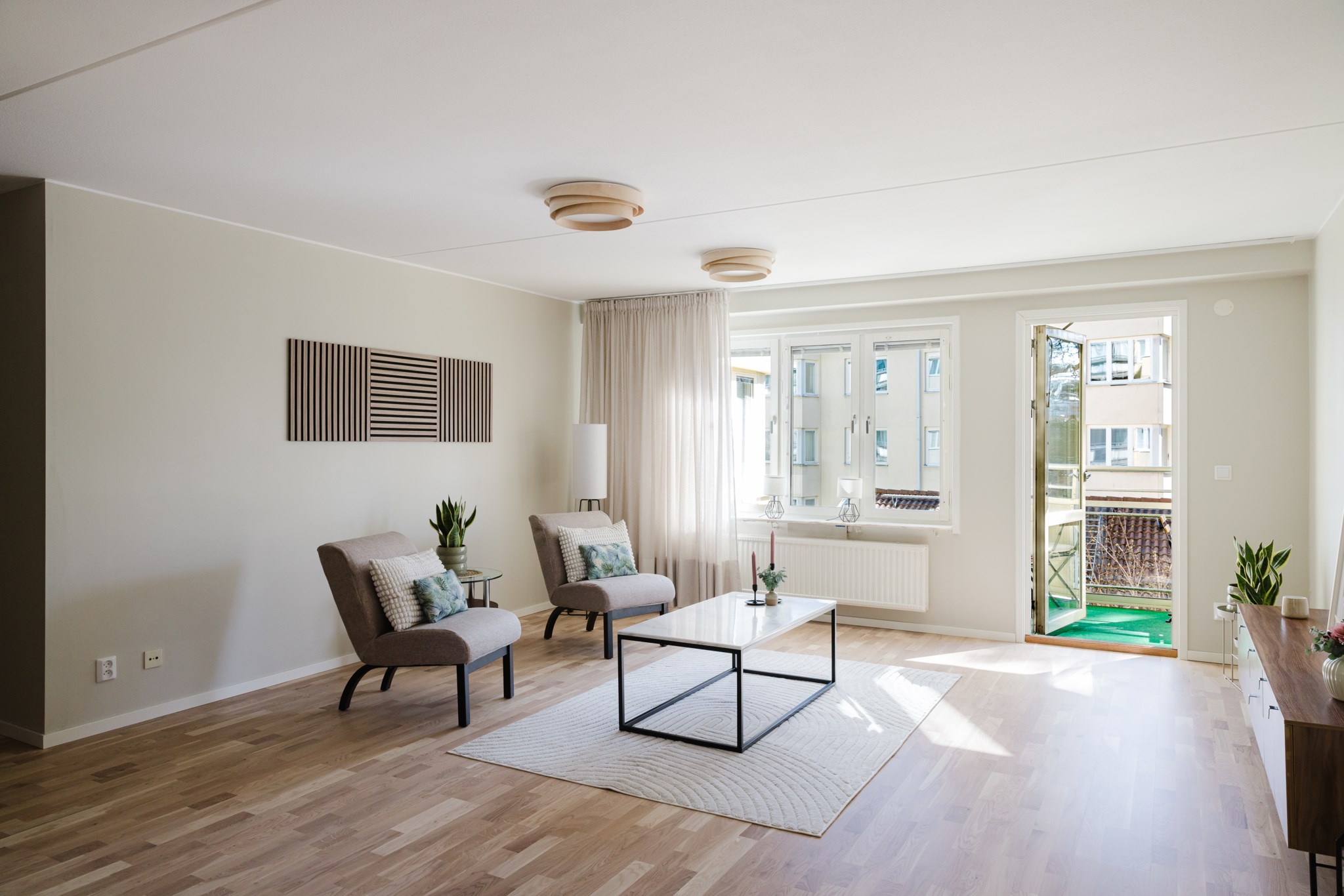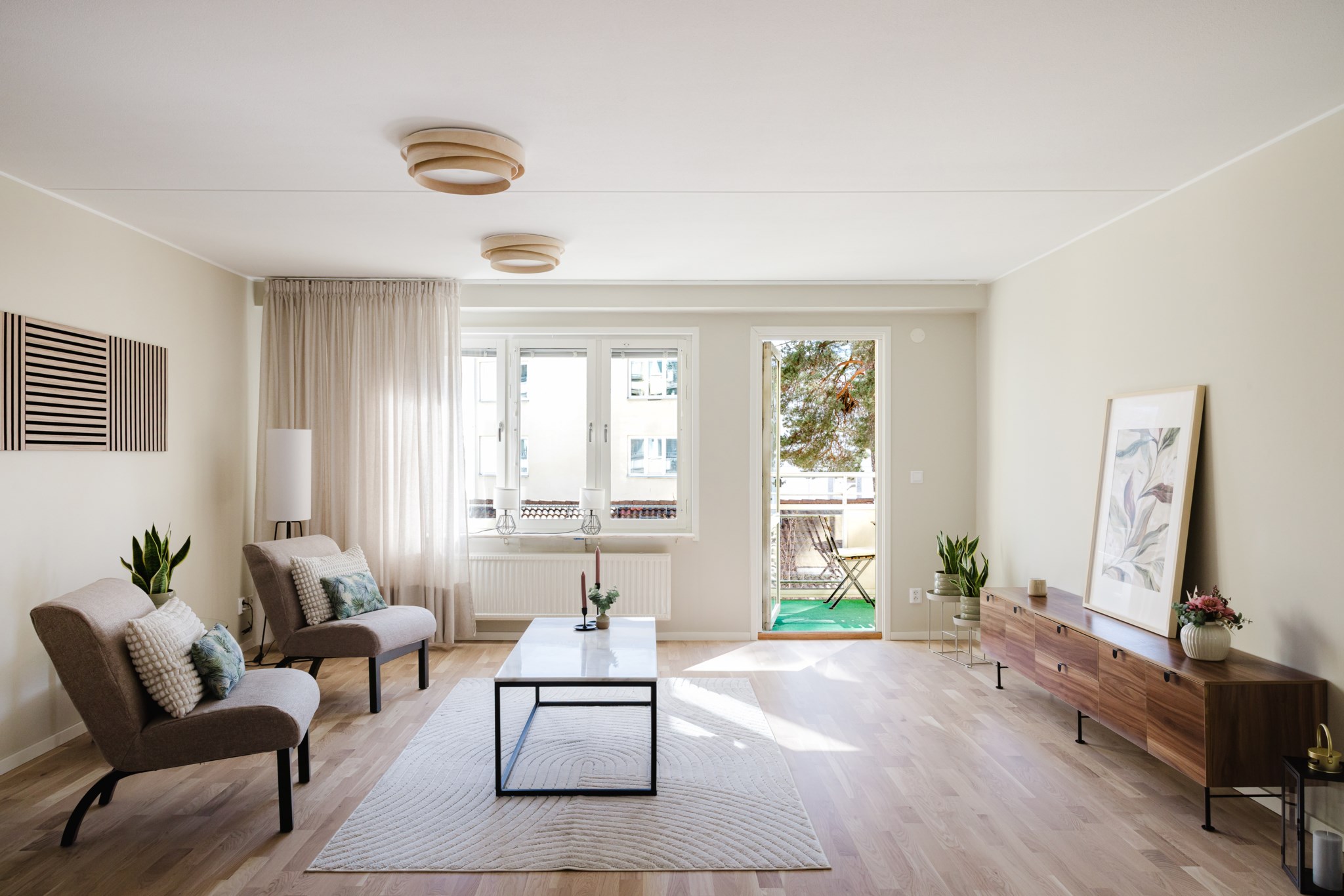 Vardagsrummet är hemmets hjärta – ljust, luftigt och inbjudande. Ljuset flödar in i den genomgående planlösningen och bjuder in till avkoppling. Utgång till en solig balkong i söderläge, där du kan njuta av kaffet i solen större delen av dagen. Här finns det gott om plats att möblera med bokhylla, tv möbel och soffgrupp. Den öppna planlösningen mot köket gör att det blir en naturlig social umgängesyta och här kan man bjuda in vänner och bekanta.