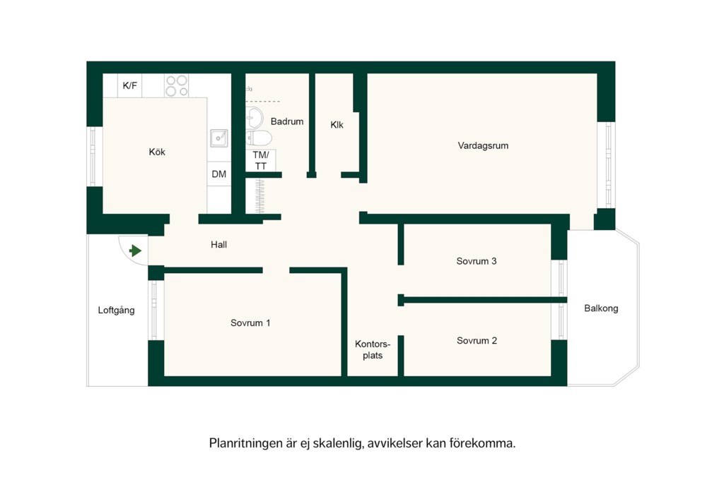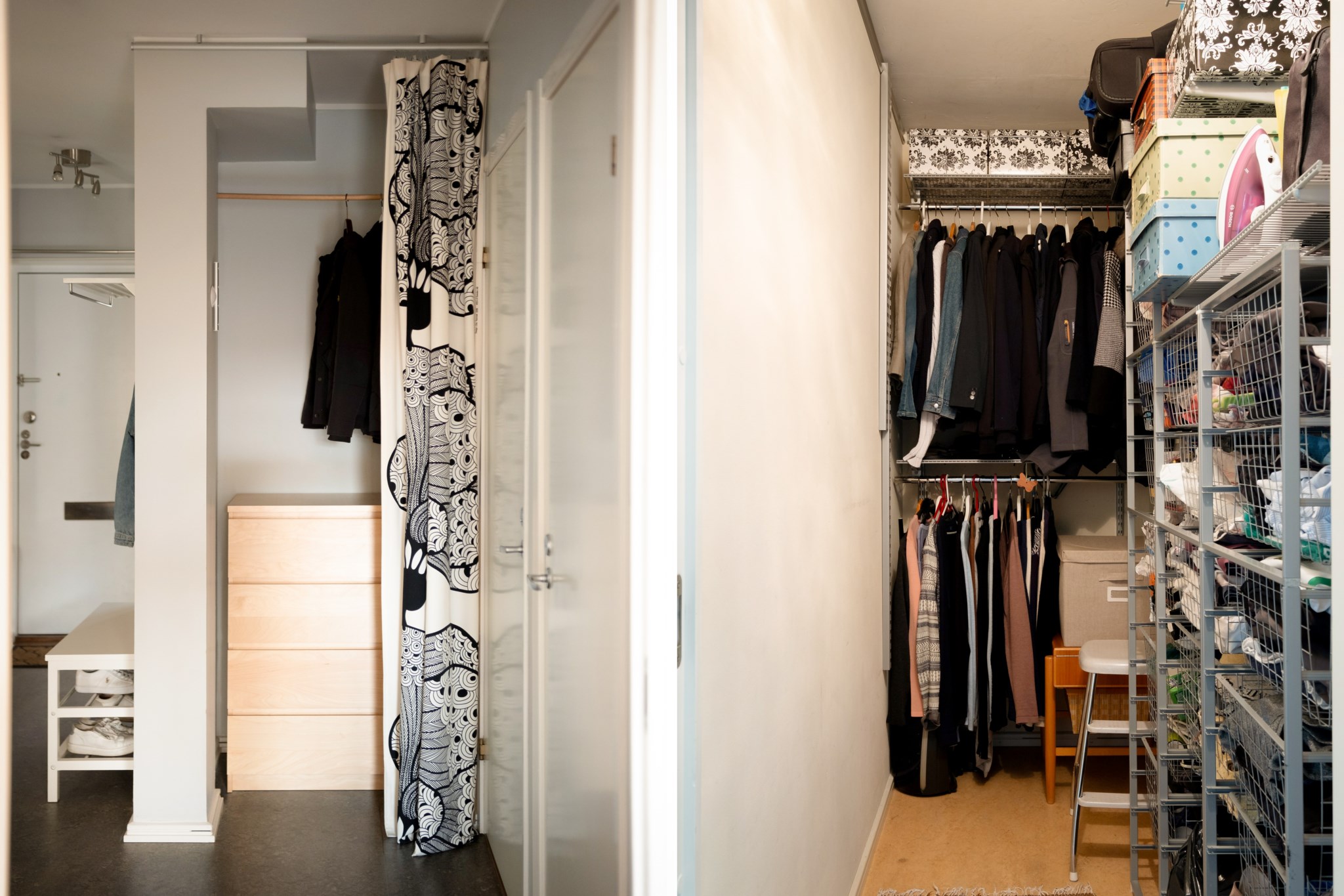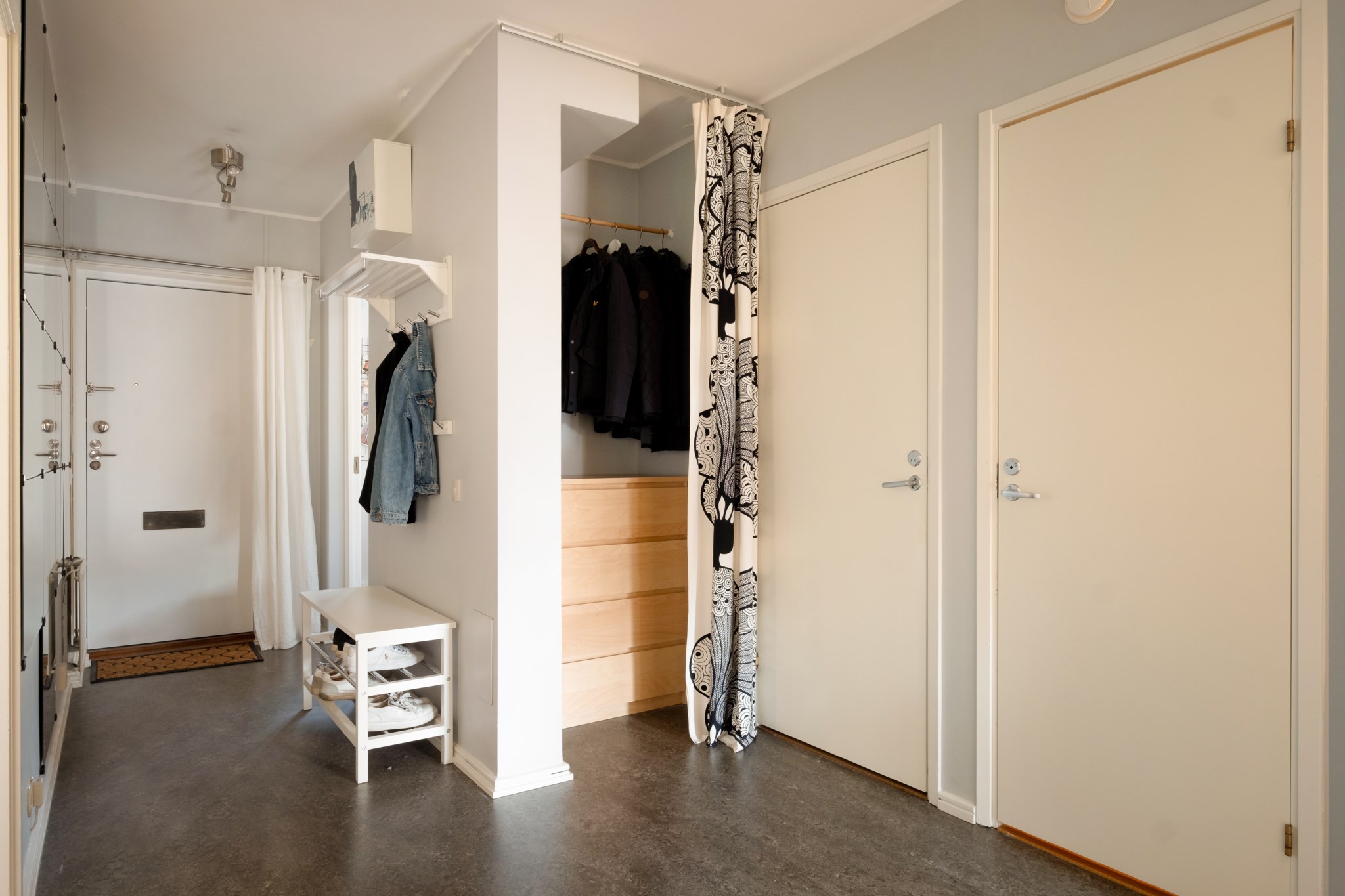 Ingång sker från loftgång, belägen som sista bostad i ena änden - inga förbipasserande. Ni välkomnas in i en ljus hall med plats för avhängning av ytterkläder samt gott om utrymme för mer förvaring finns vidare in i den inre hallen.