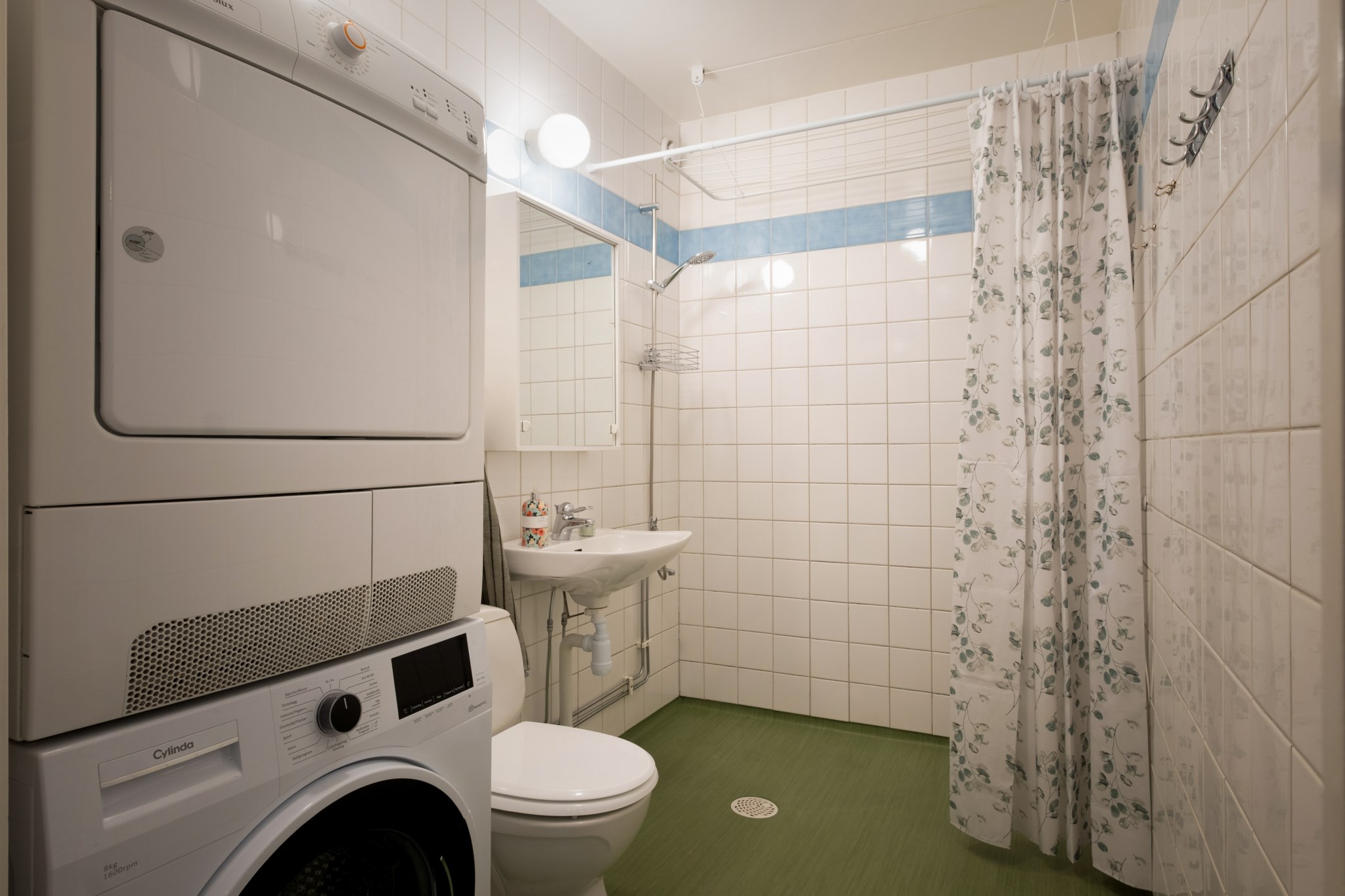 Badrummet har vitt kakel på väggarna och våtrumsmatta på golv. Utrustningen består av dusch, wc, handfat, spegel samt tvättmaskin och torktumlare.