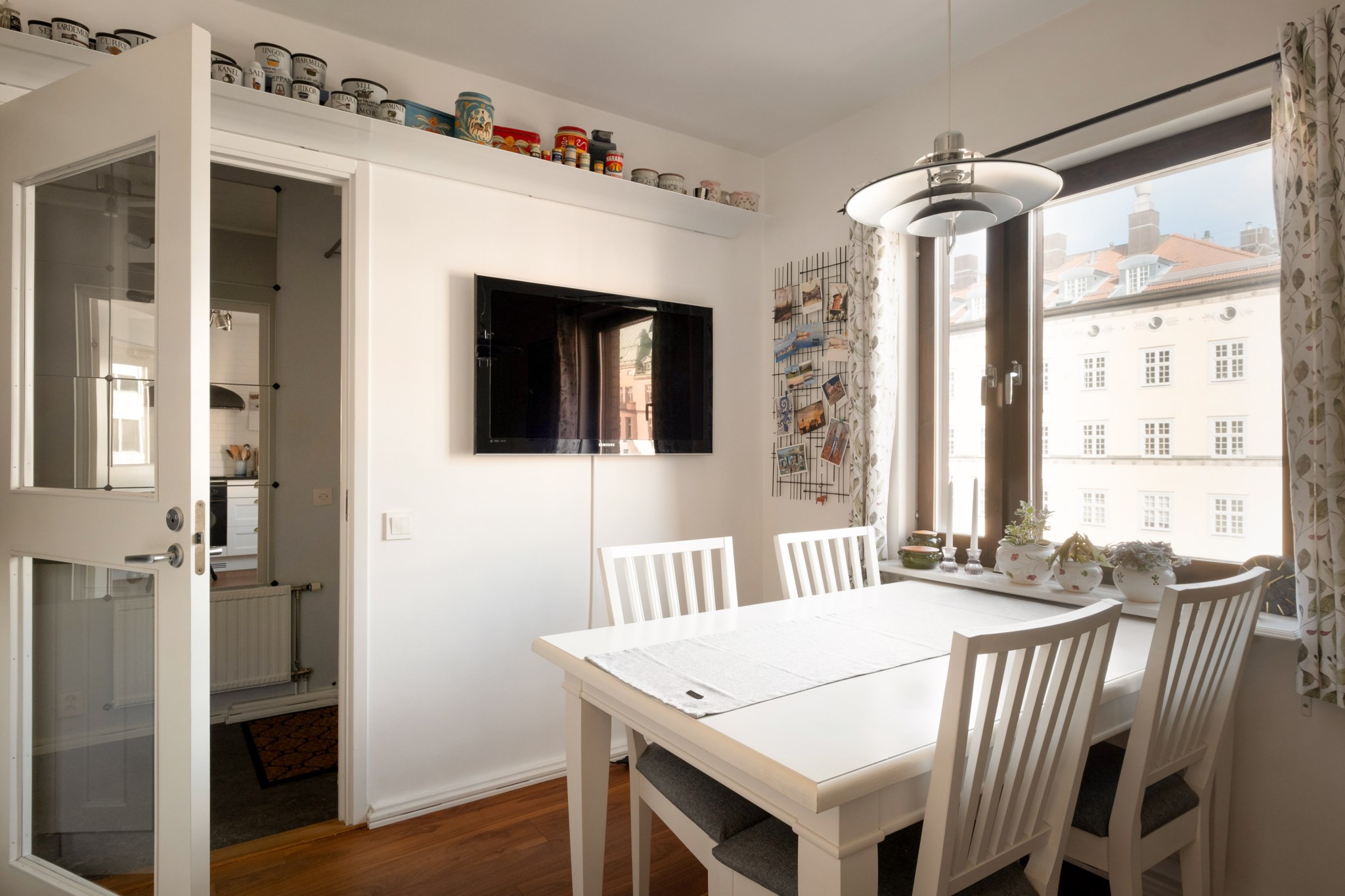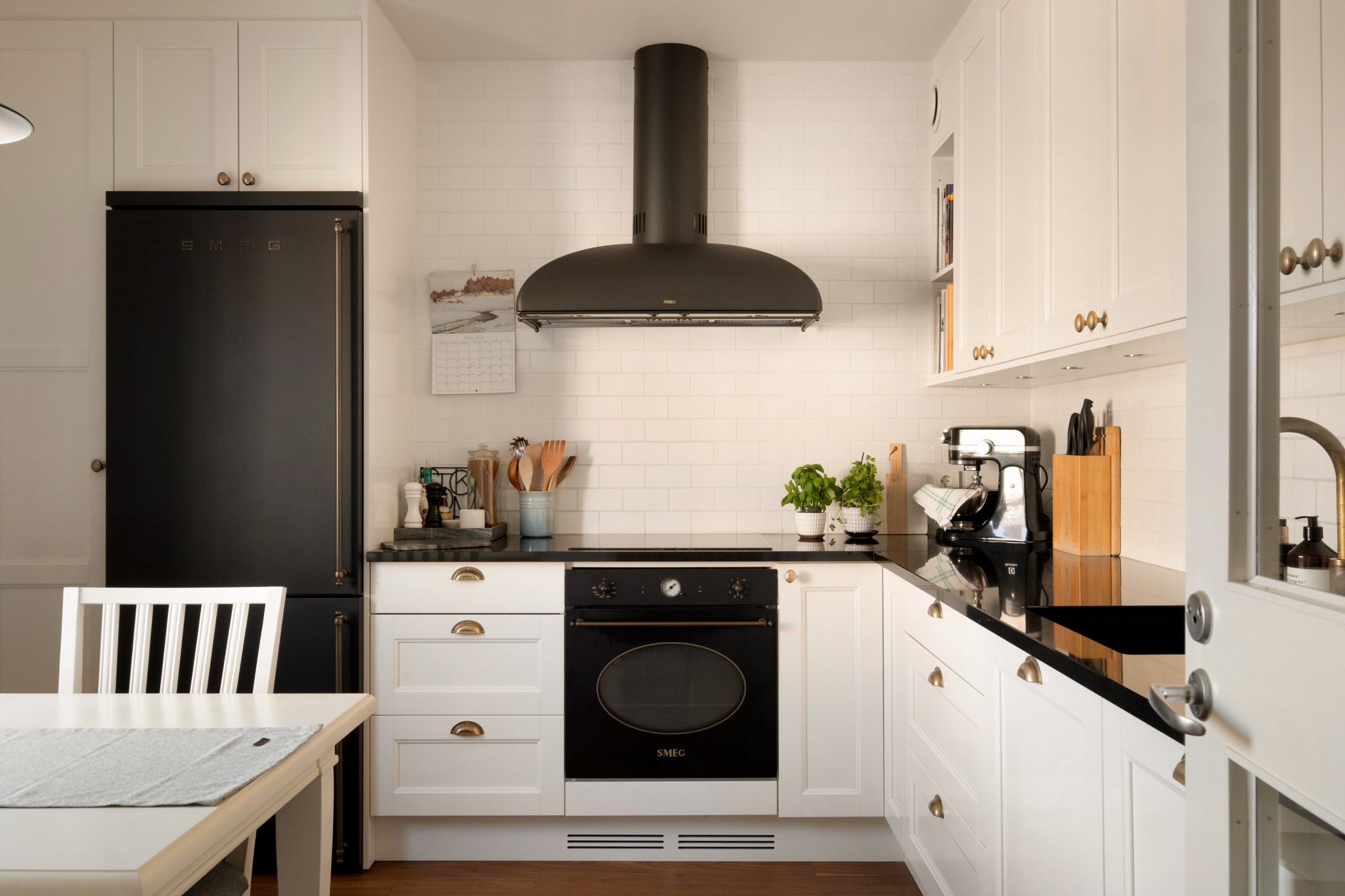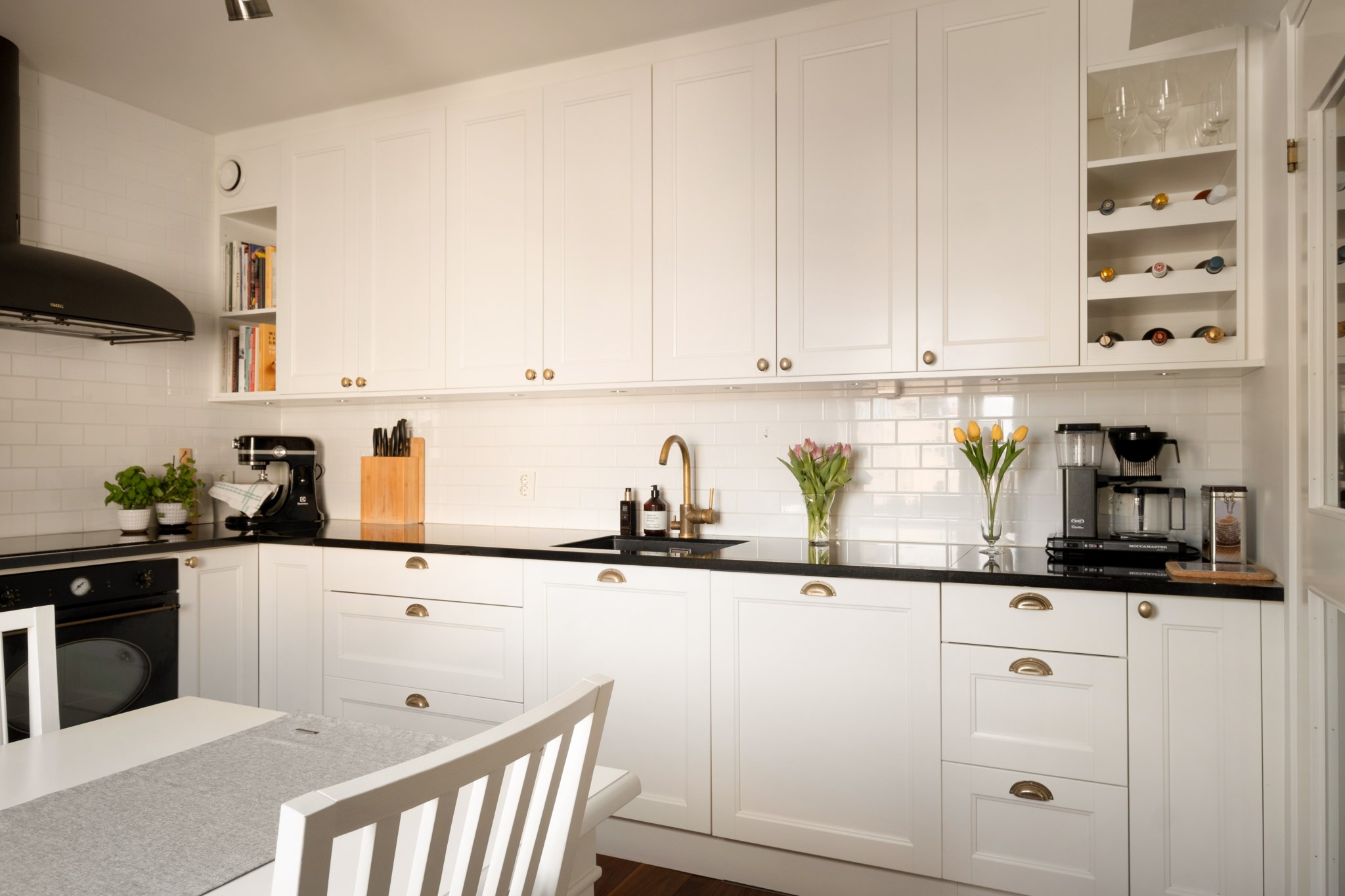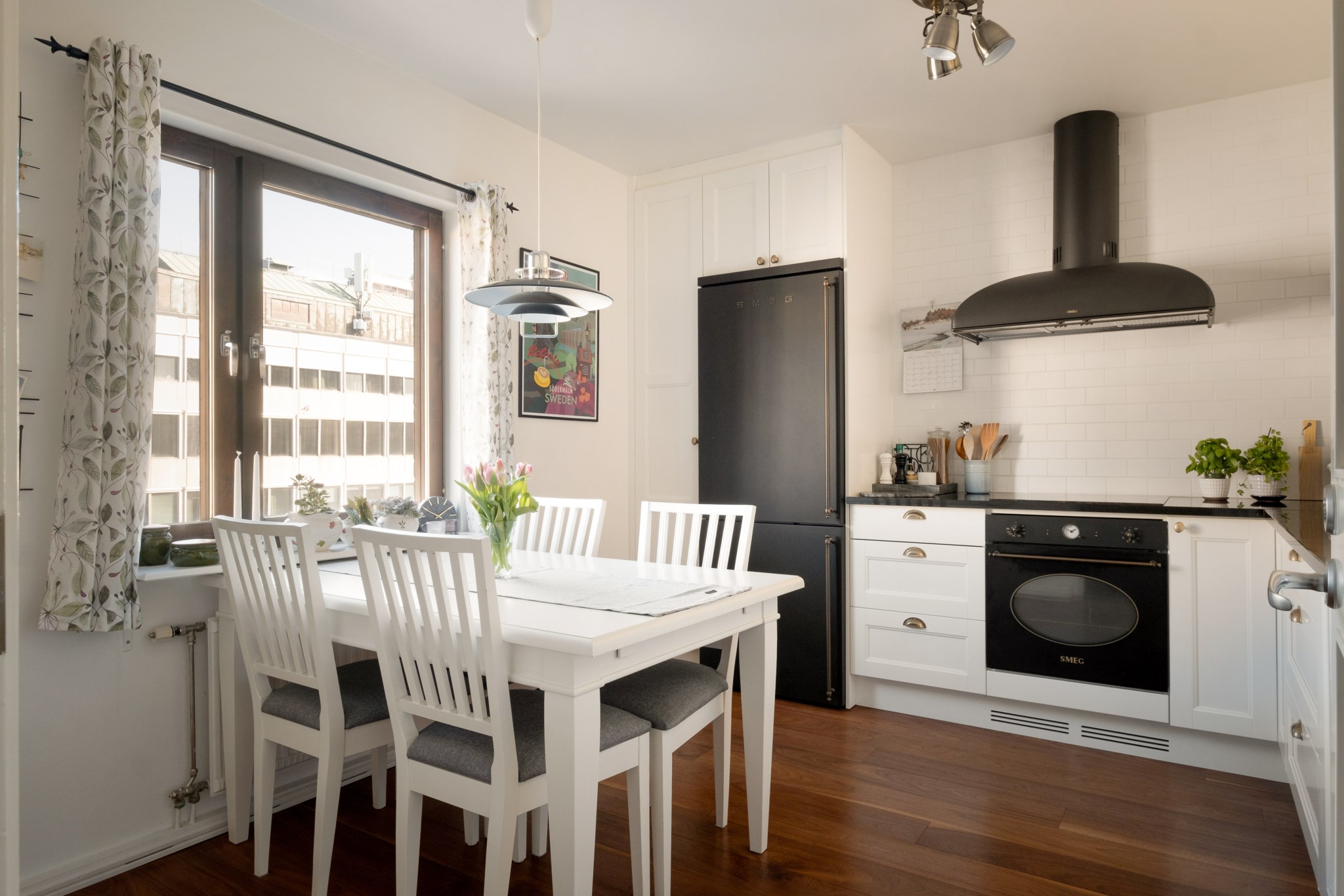 Fräscht och stilrent kök med gott om utrymme bakom flertalet ljusa luckor och lådor. Stort generöst fönster som bjuder på ett fantastiskt ljusinsläpp och en trevlig matplats invid fönster för de härliga sociala middagarna! Den maskinella utrustningen består av ugn med spishäll och fläkt, diskmaskin samt kyl/frys från SMEG.
