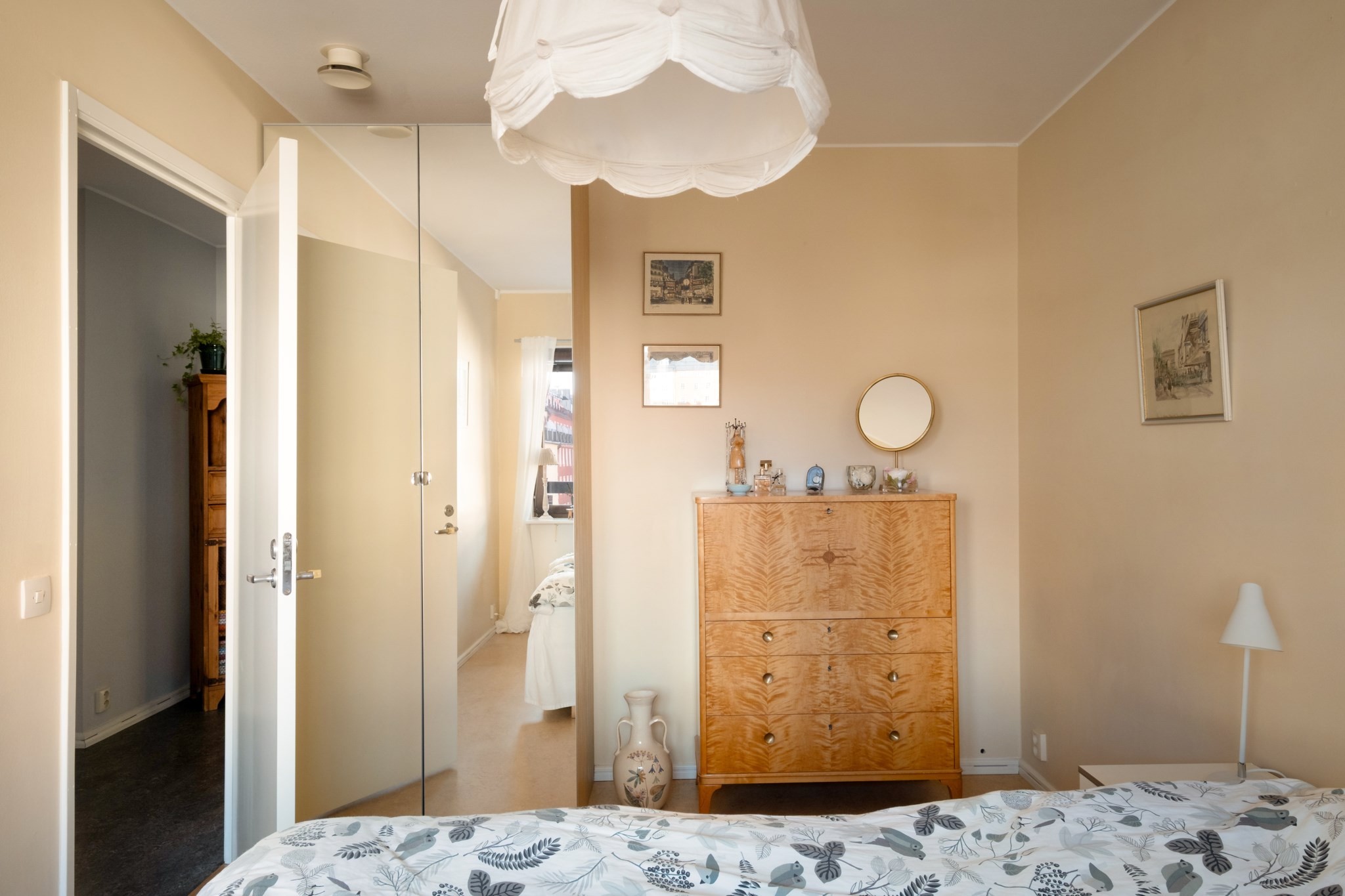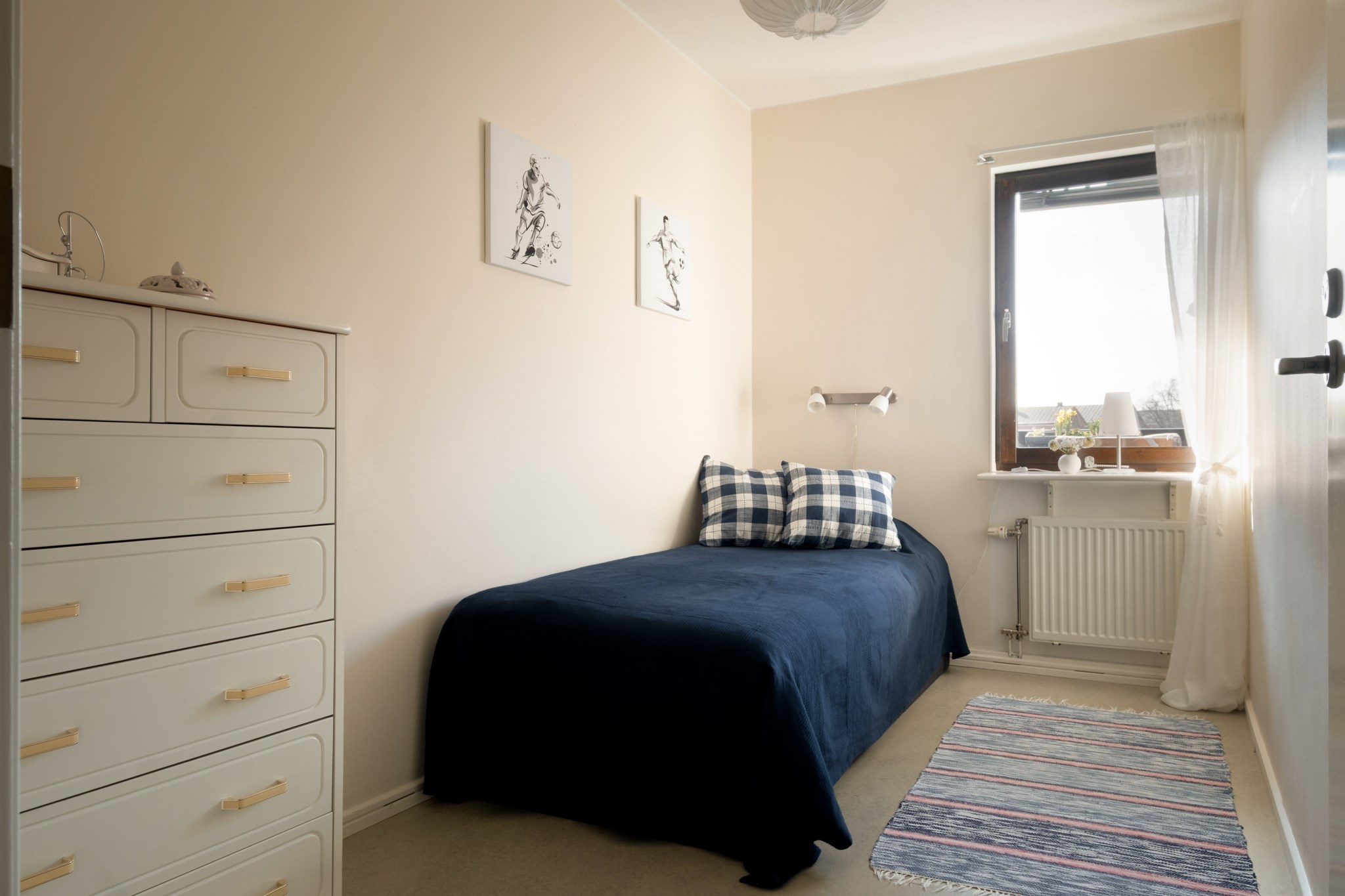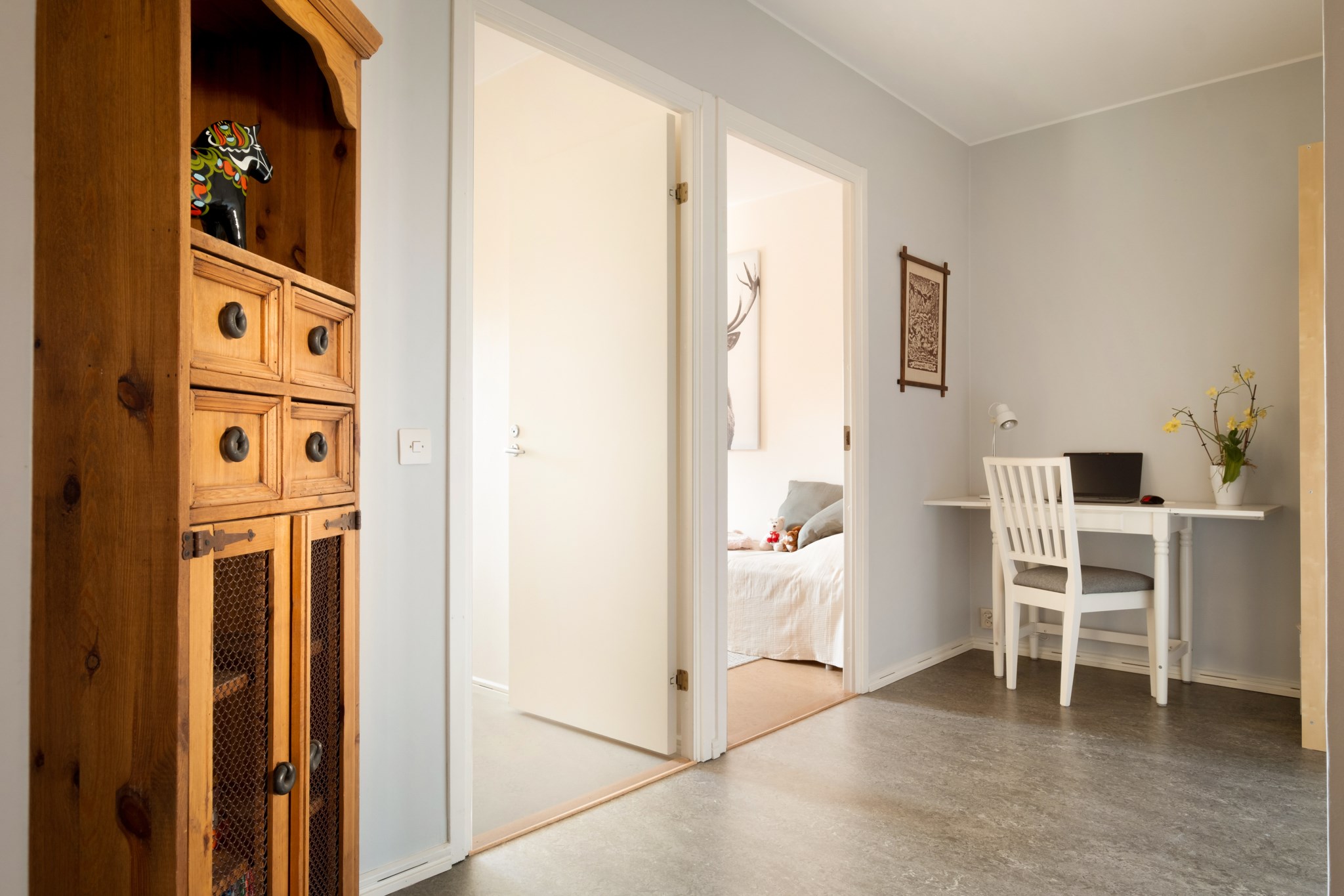 Två mysiga sovrum av mindre storlek som rymmer säng och annan förvaringsmöblemang. Perfekta som barnrum eller kanske kontor.