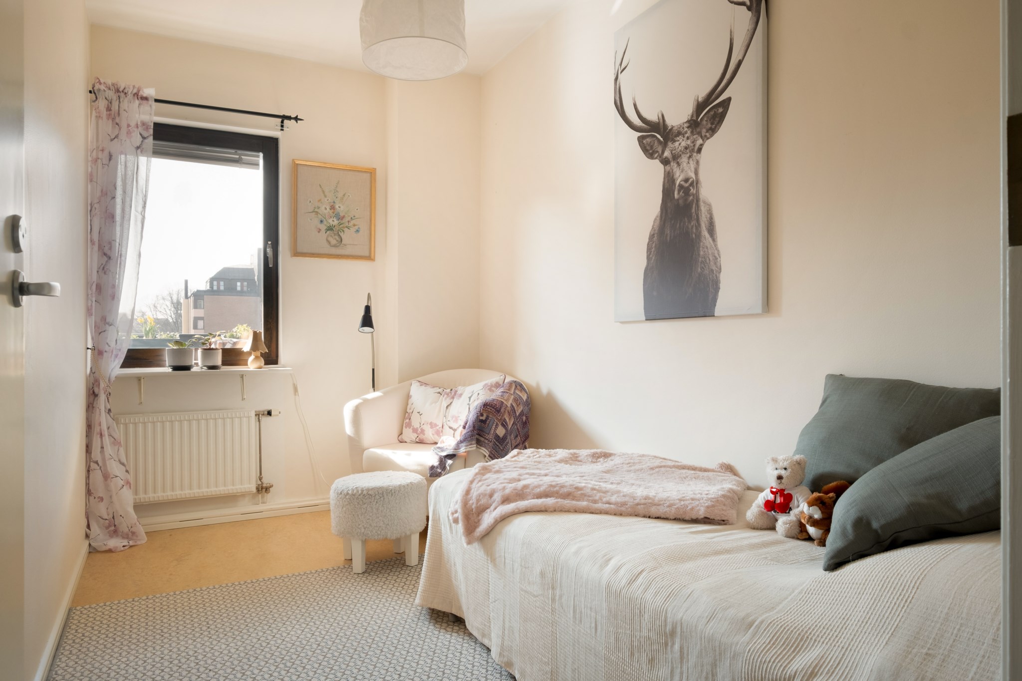 Rymligt sovrum med stort fönster som tillsammans med ljusa väggar skapar en härlig atmosfär och harmoni i rummet. Här ryms det utan problem en stor dubbelsäng samt tillhörande möblemang. Gott om plats för förvaringsmöblemang finns längs med väggen.