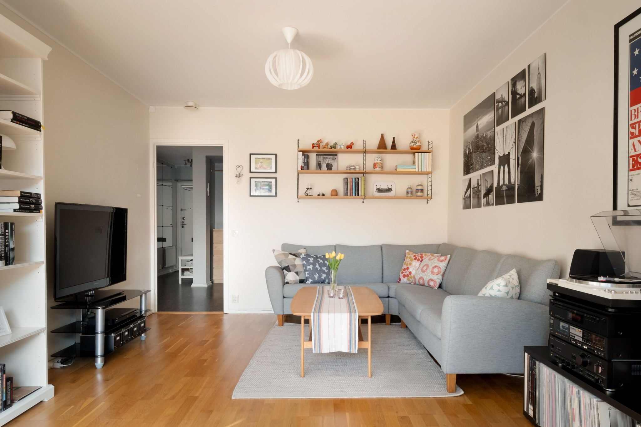 Väldisponerad vardagsrum med ett härligt ljusflöde från det stora fönsterpartiet. Här rymmer man utan problem en större soffa, bord, matplats i den andra delen av vardagsrummet. Från vardagsrummet hittar ni även bostadens balkong i bästa söderläge där man kan njuta av solen större delen av dagen - perfekt plats att spendera många härliga sommarkvällar!