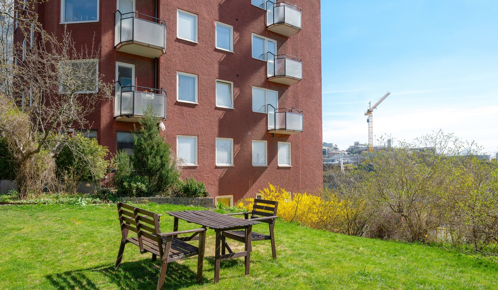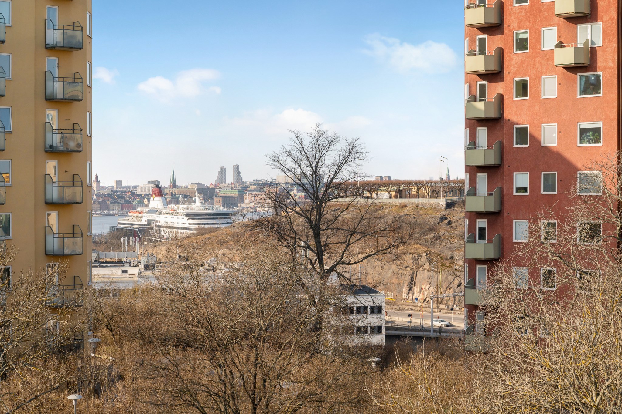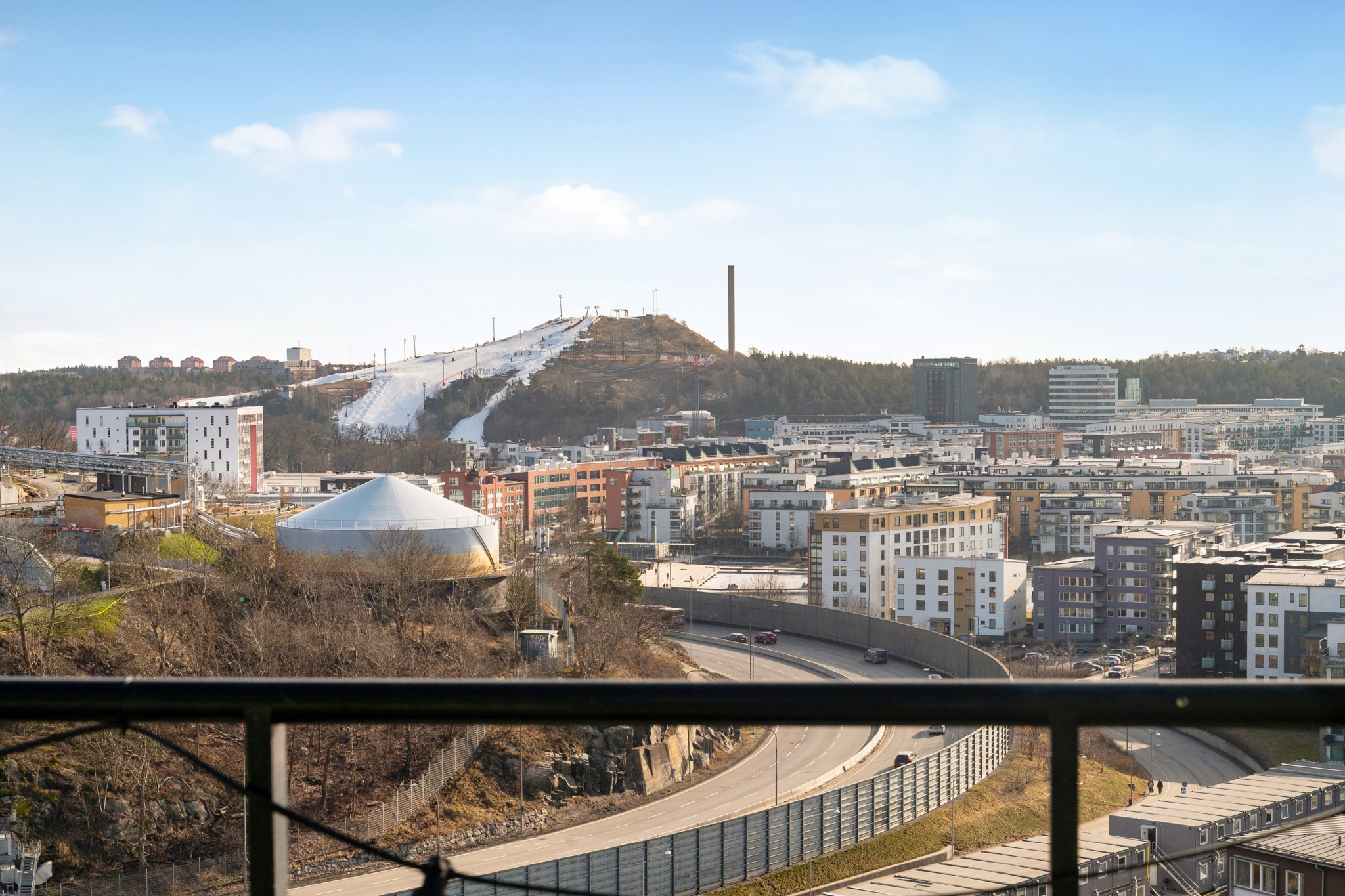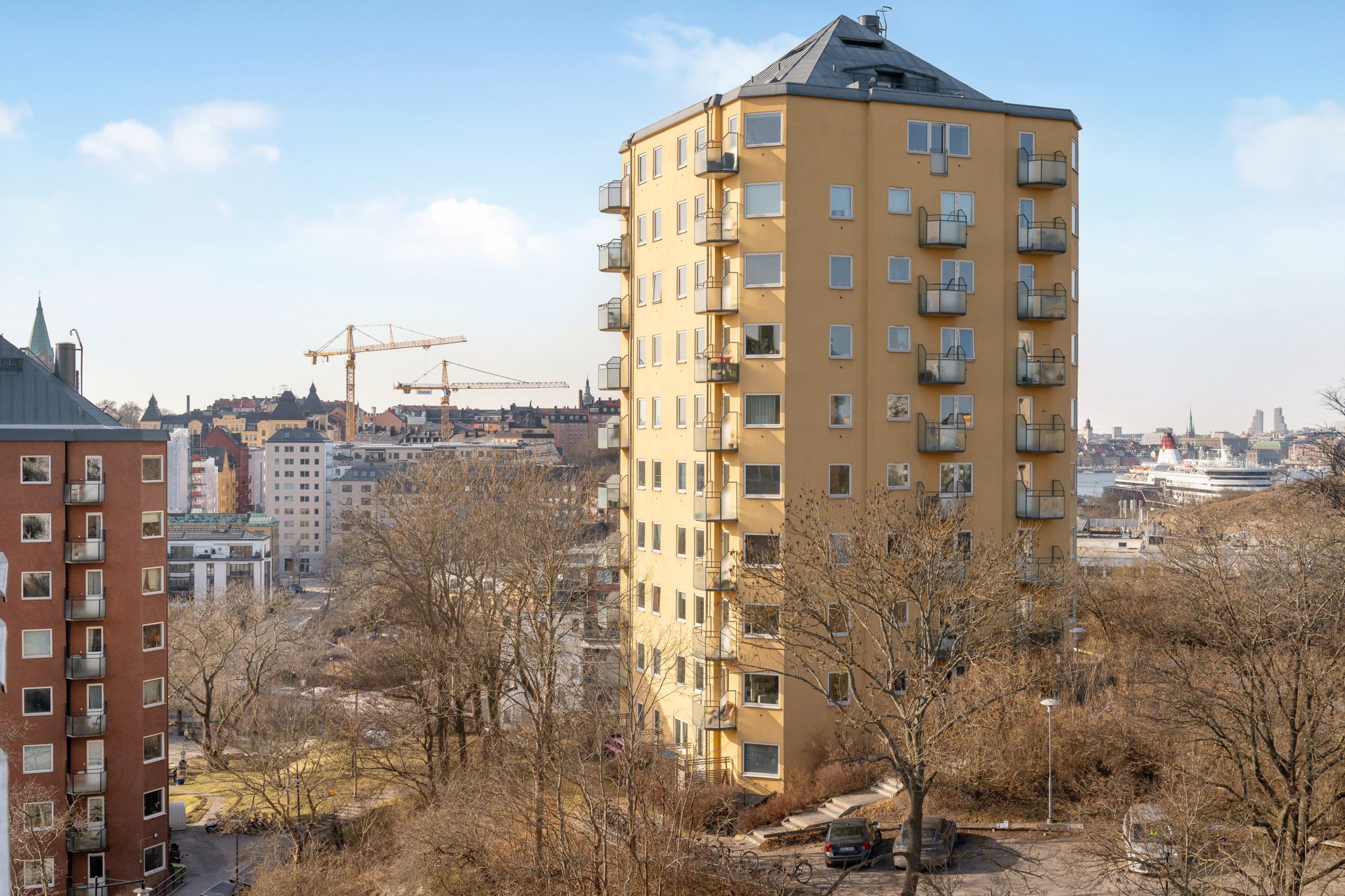 Från balkongen och bostadens alla fönster bjuds du på en levande tavla med vacker stadssiluett och magisk solnedgång på somrarna. Ett hem i en ekonomiskt mycket trygg förening med väldigt låg belåning, friköpt mark och låga månadsavgifter.