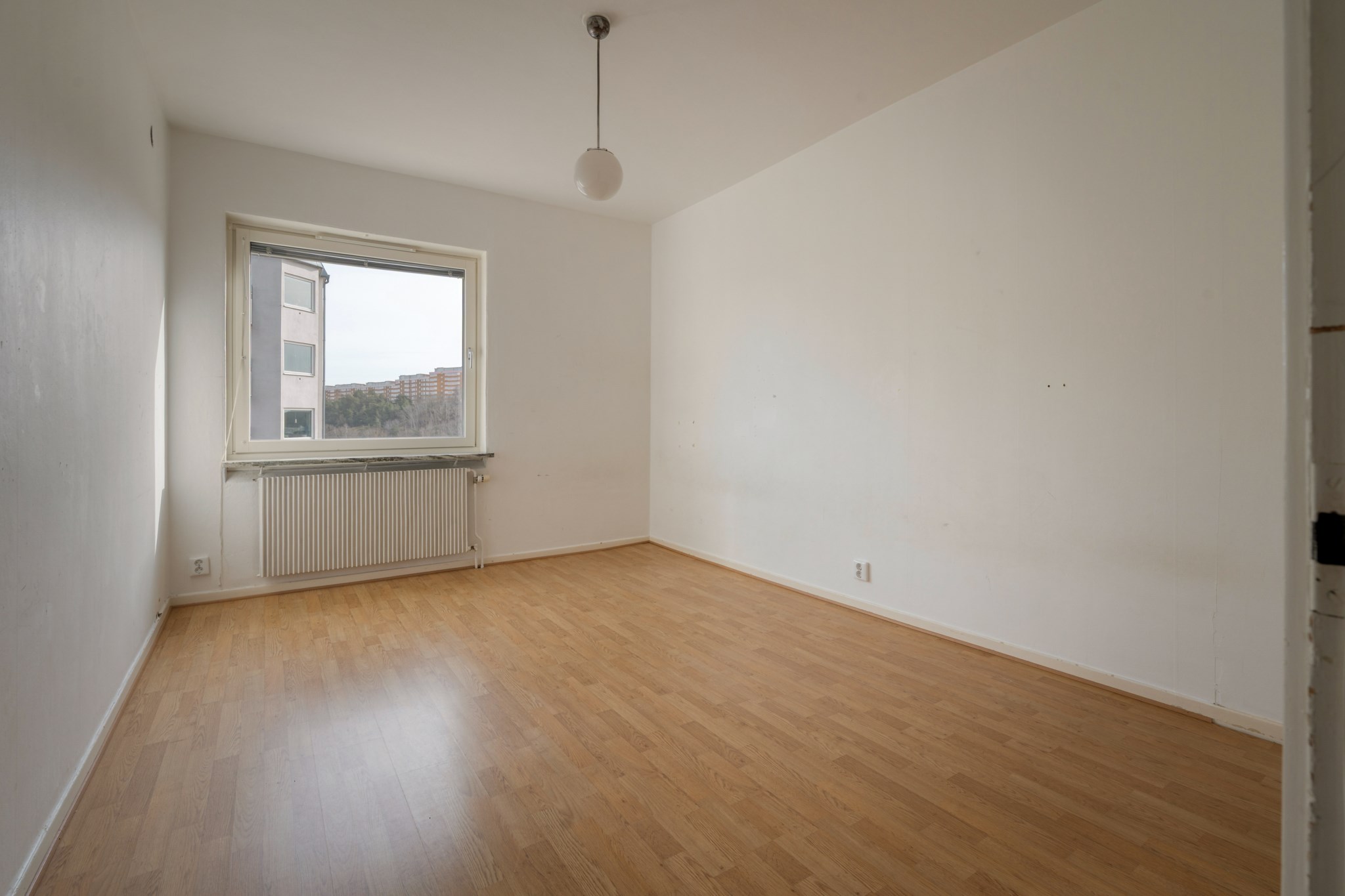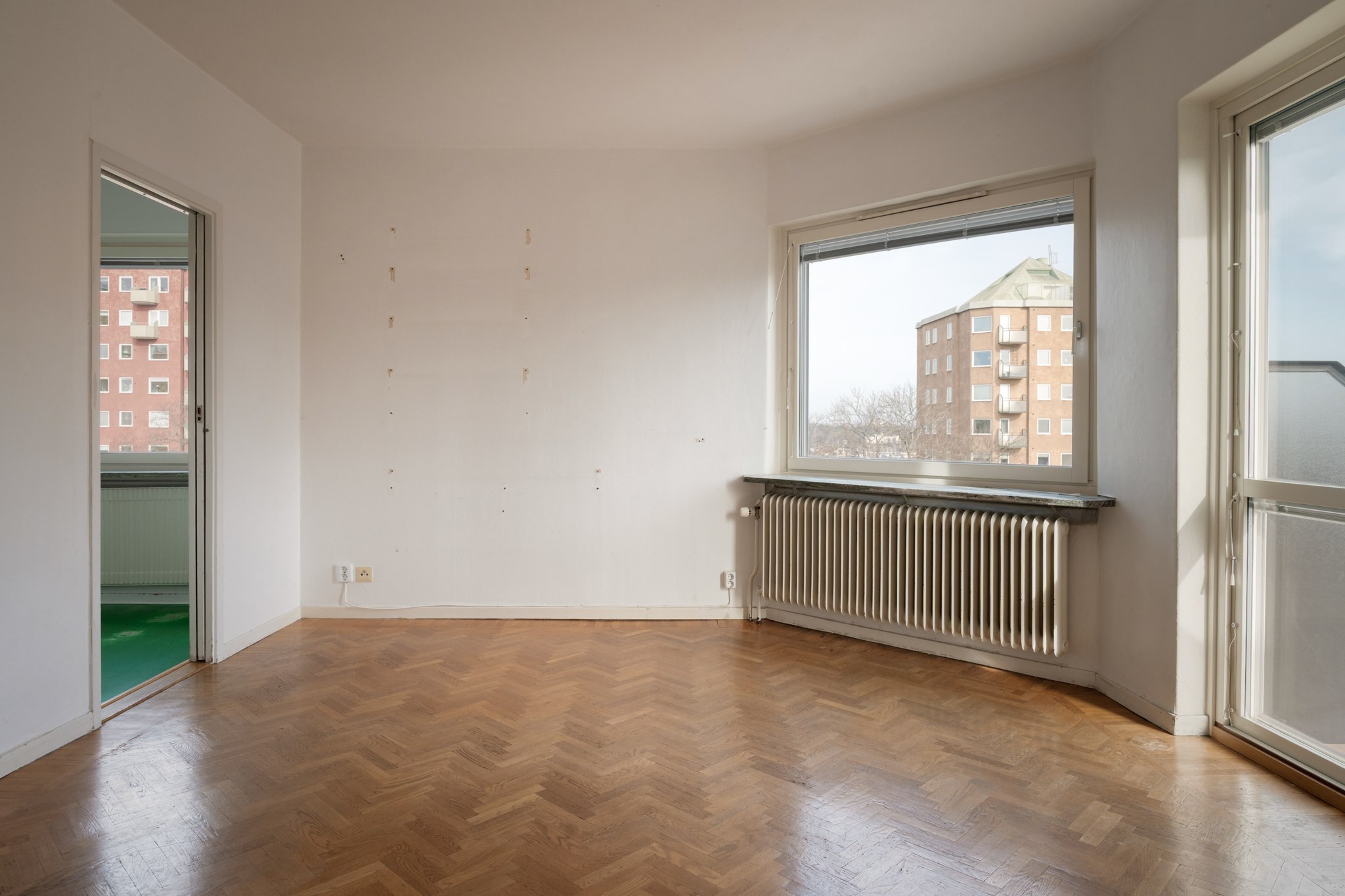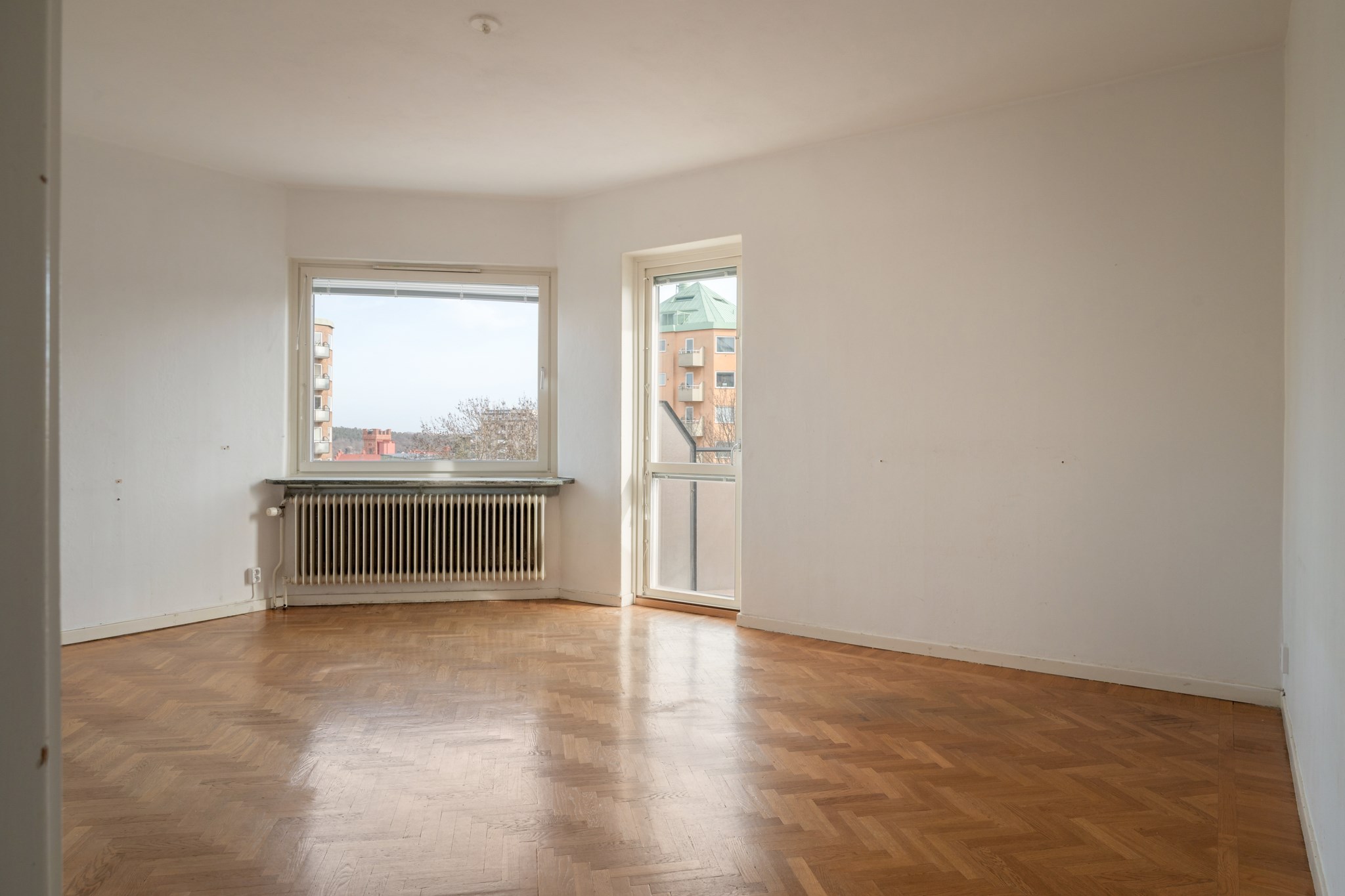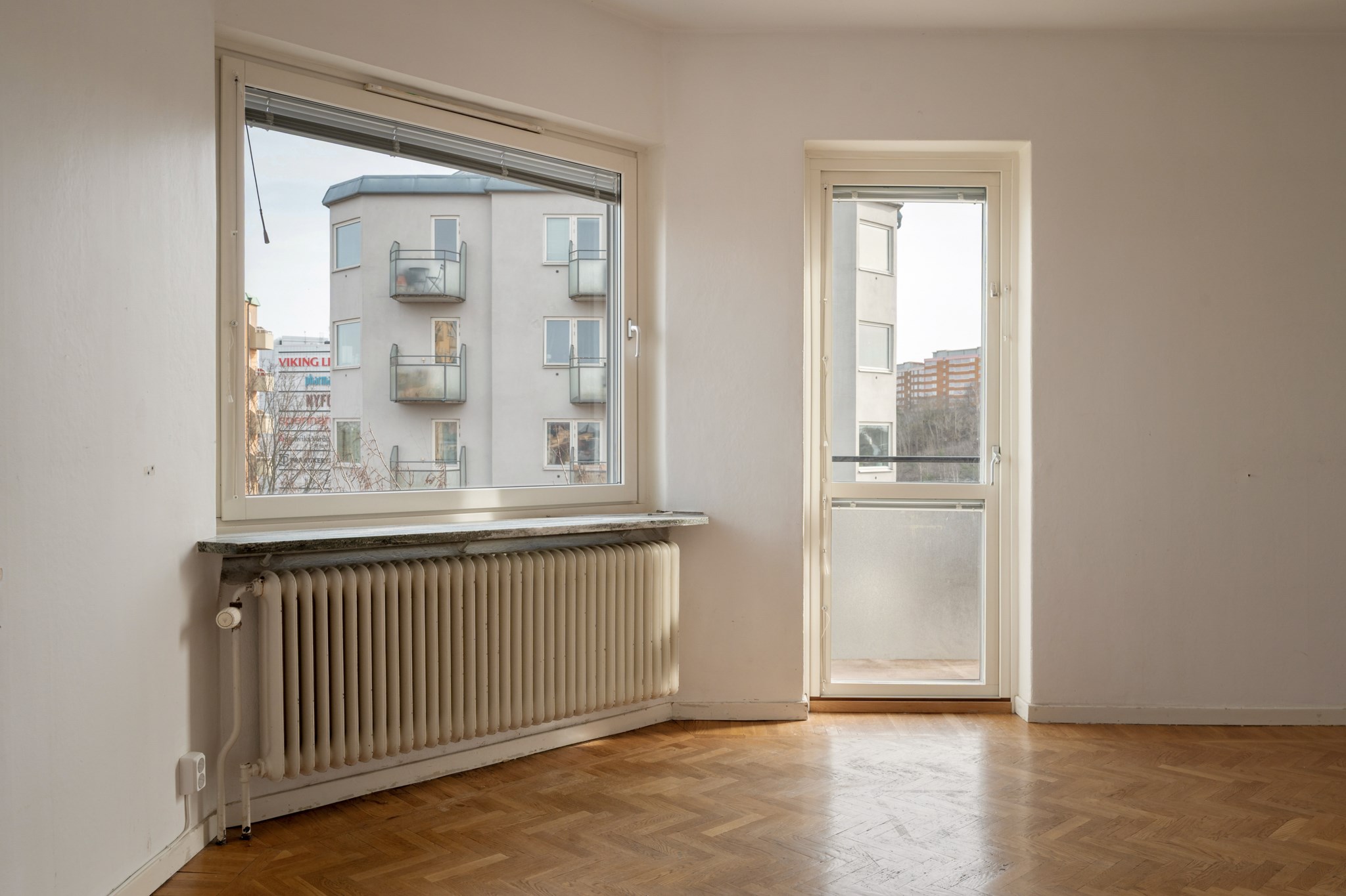 Ljust och inbjudande vardagsrum i attraktivt gavelläge med charmig karaktär och lättmöblerad planlösning. Här finns gott om plats för både soffgrupp och matbord. Från rummet nås balkongen med förmiddagssol och utsikt mot bland annat Hammarbybacken. Balkongdörren och det stora fönstret är placerade i vinkel, vilket ger ett generöst ljusinsläpp.