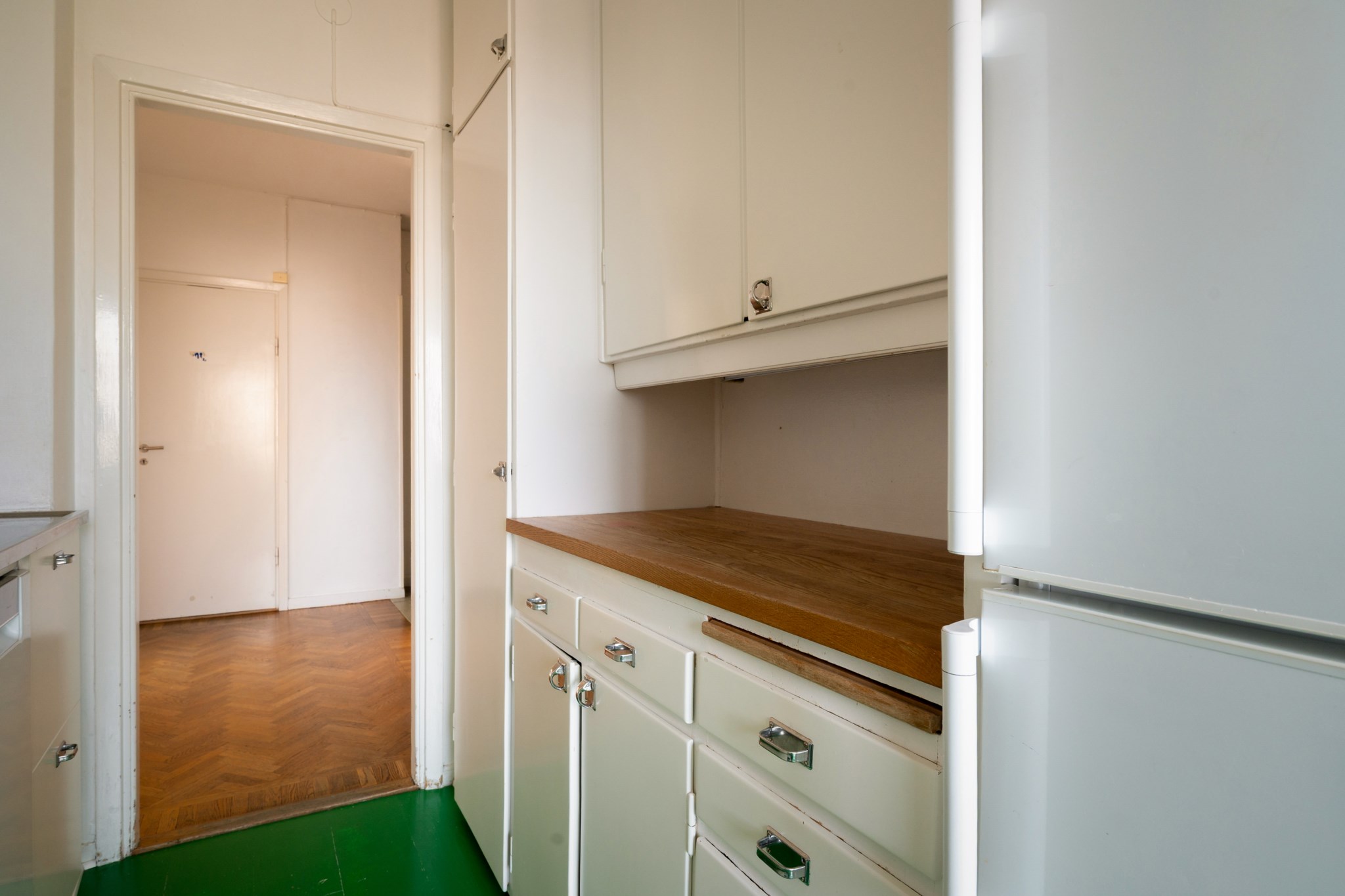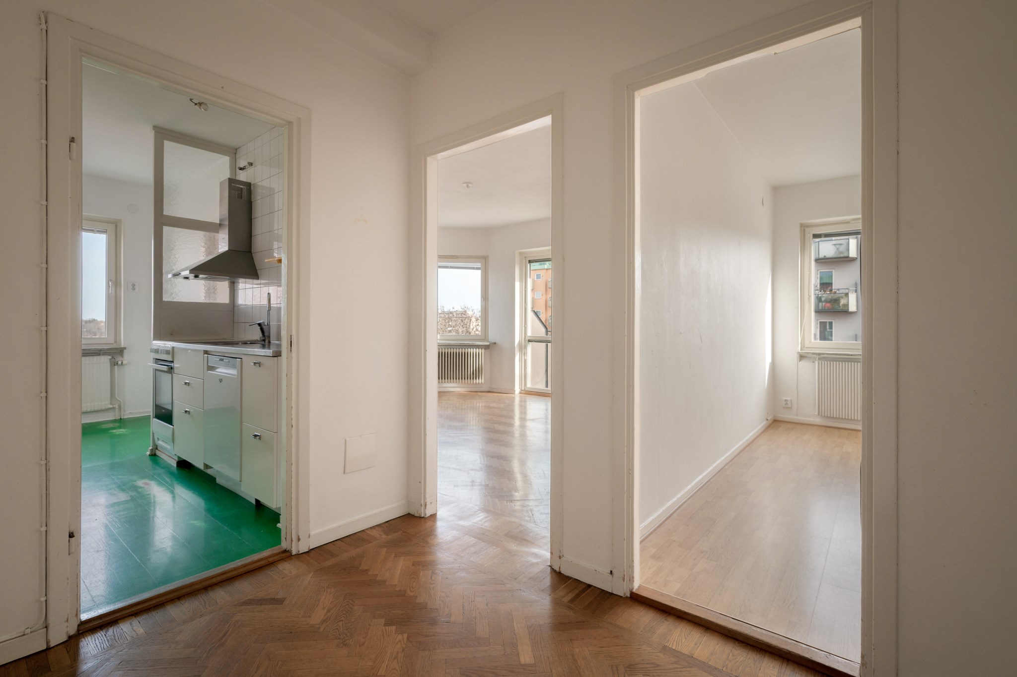 Den rymliga och möblerbara inre hallen ansluter till lägenhetens samtliga rum på ett harmoniskt sätt. Väggarna är ljusa och golvet pryds av klassisk fiskbensparkett.