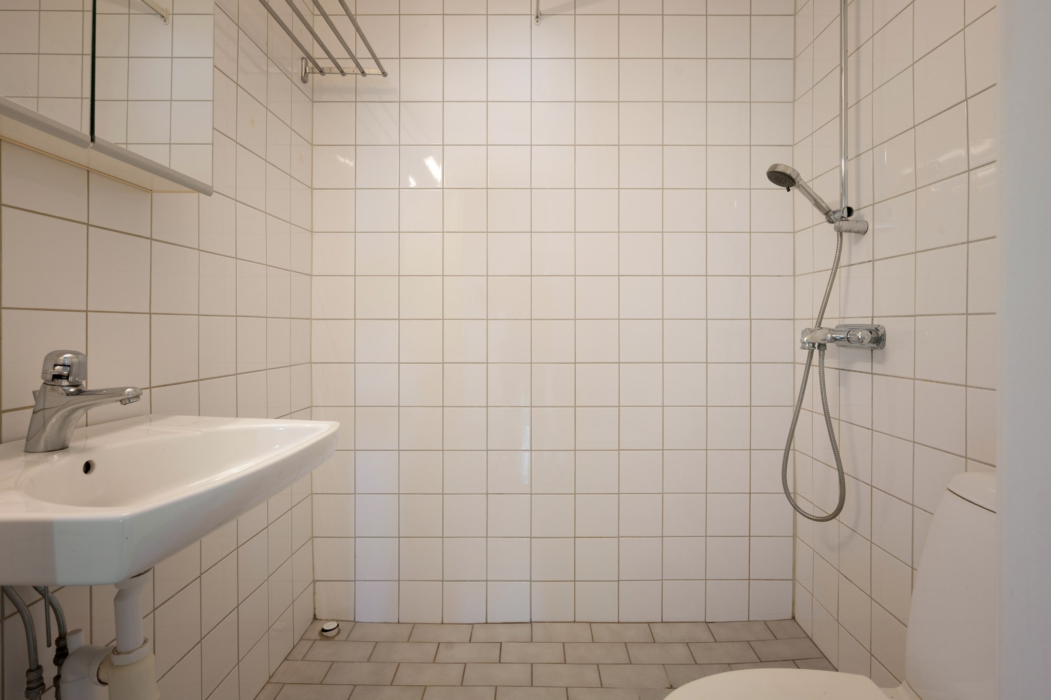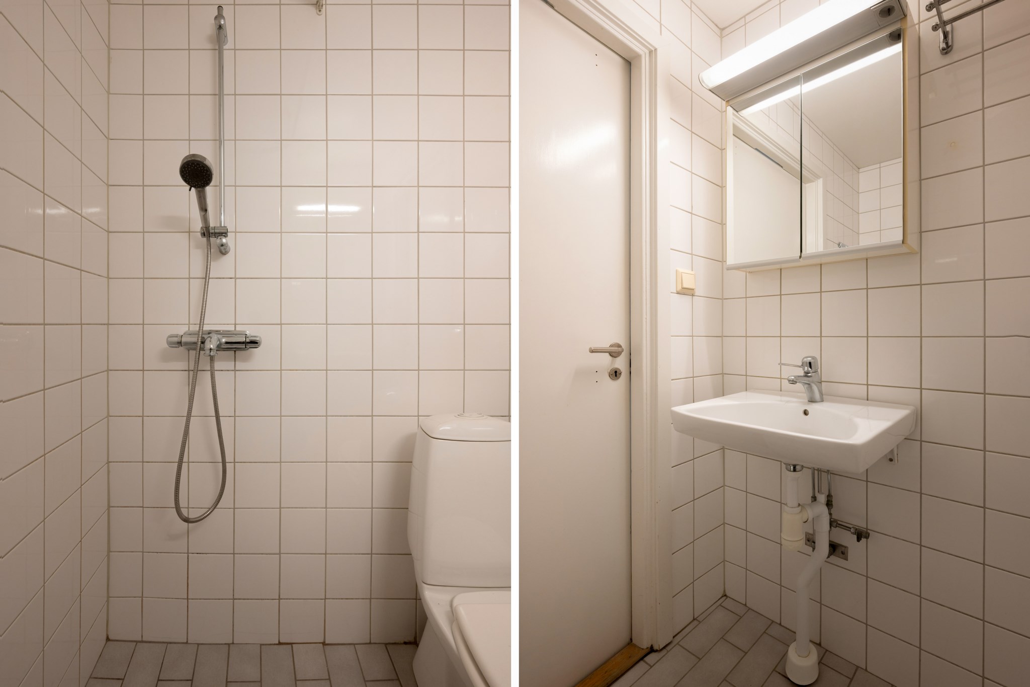 Stambytt och helkaklat badrum med klinkergolv. Badrummet är utrustat med duschhörna, handfat med överskåp samt wc.