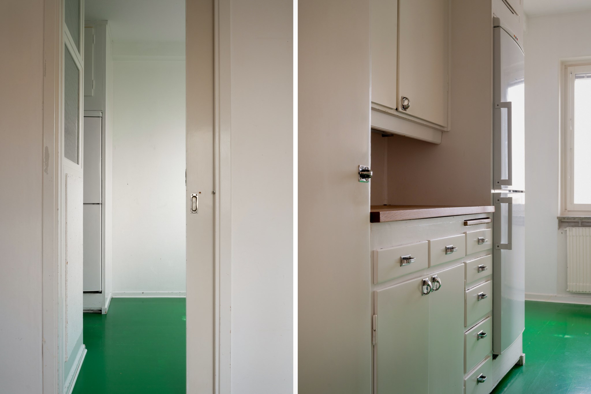 Välkomnande entré med gott om plats för avhängning av ytterkläder. Förvaringsmöjligheterna är utmärkta tack vare flera inbyggda garderober. Väggarna är ljusa och på golvet ligger ett vackert originalgolv i marmor som ger entrén en elegant karaktär.