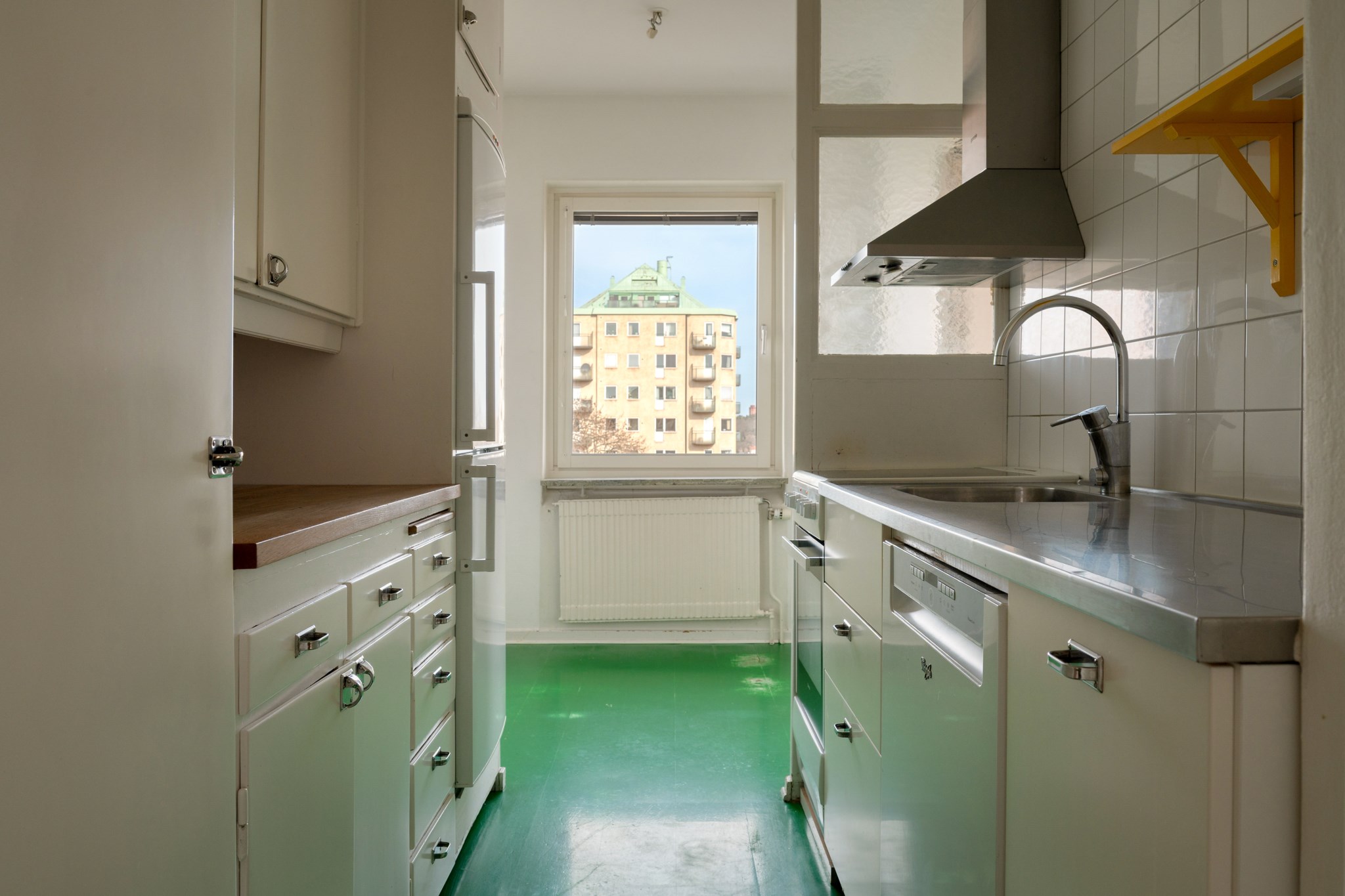 Trivsamt kök med en ljus och inbjudande matplats vid fönstret intill öppningen mot vardagsrummet, där den ursprungliga skjutdörren finns bevarad. Delar av köket är i originalutförande vilket bidrar till bostadens charm och karaktär. Den maskinella utrustningen består av kombinerad kyl och frys, spis med ugn (fungerar ej), diskmaskin samt köksfläkt (fungerar ej).