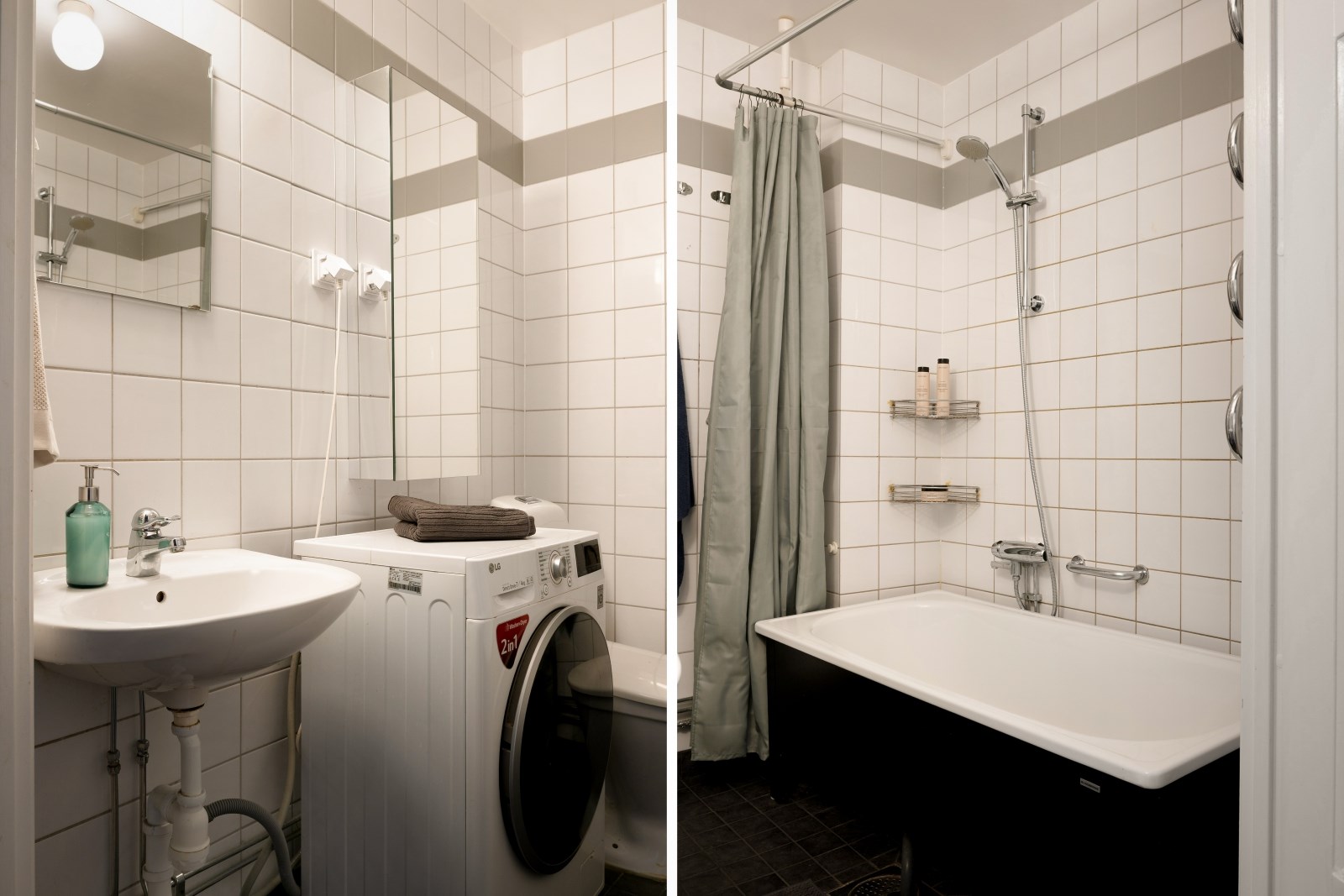 Stilrent badrum med helkaklade väggar och klinkergolv. Badrummet är utrustat med badkar, wc och handfat med kommod. Här finns även tvättmaskin som underlättar vardagen.