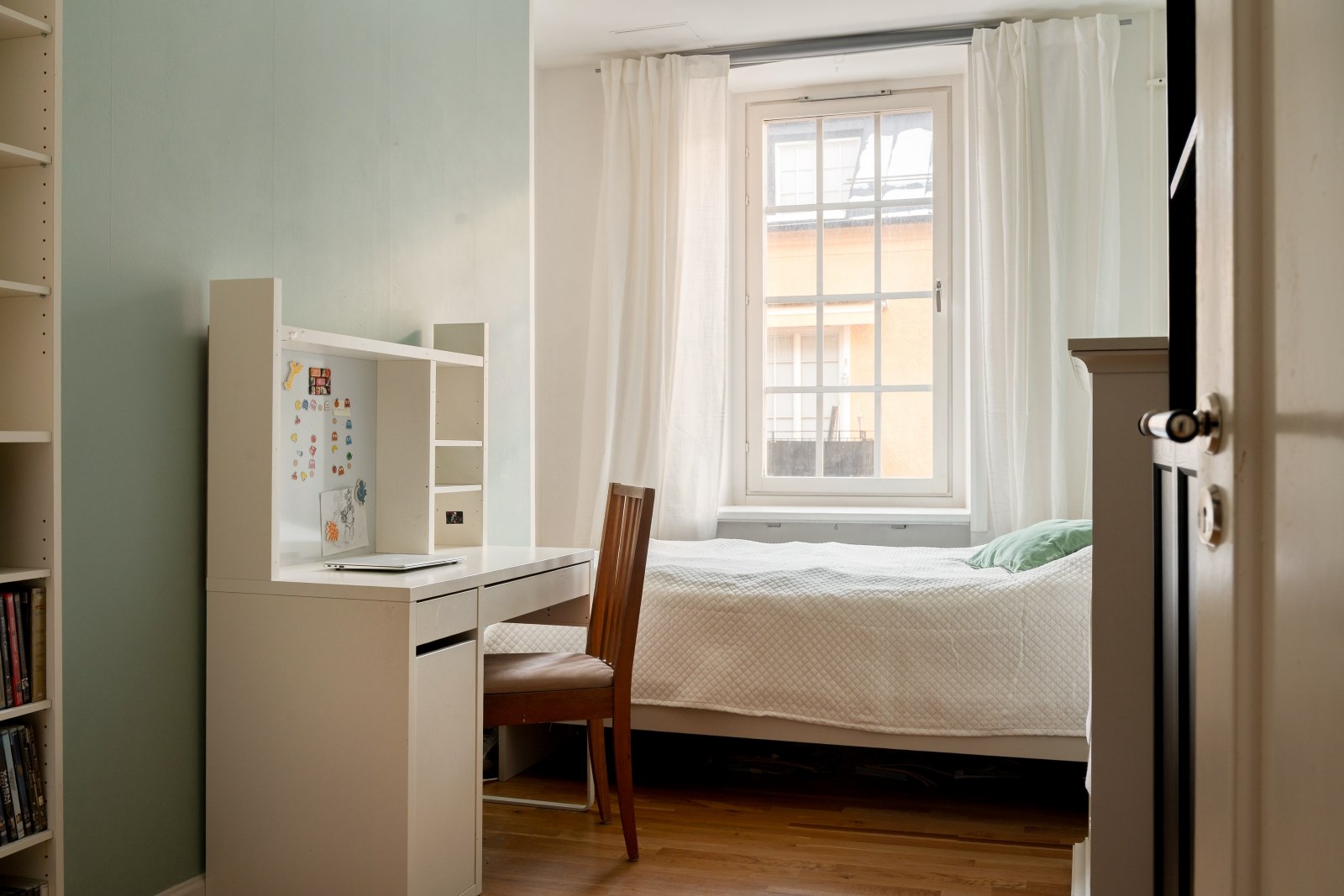 Även detta sovrum är väl tilltaget med plats för säng, skrivbord och förvaringslösningar. Ekparkett på golv och ljusa väggar.
