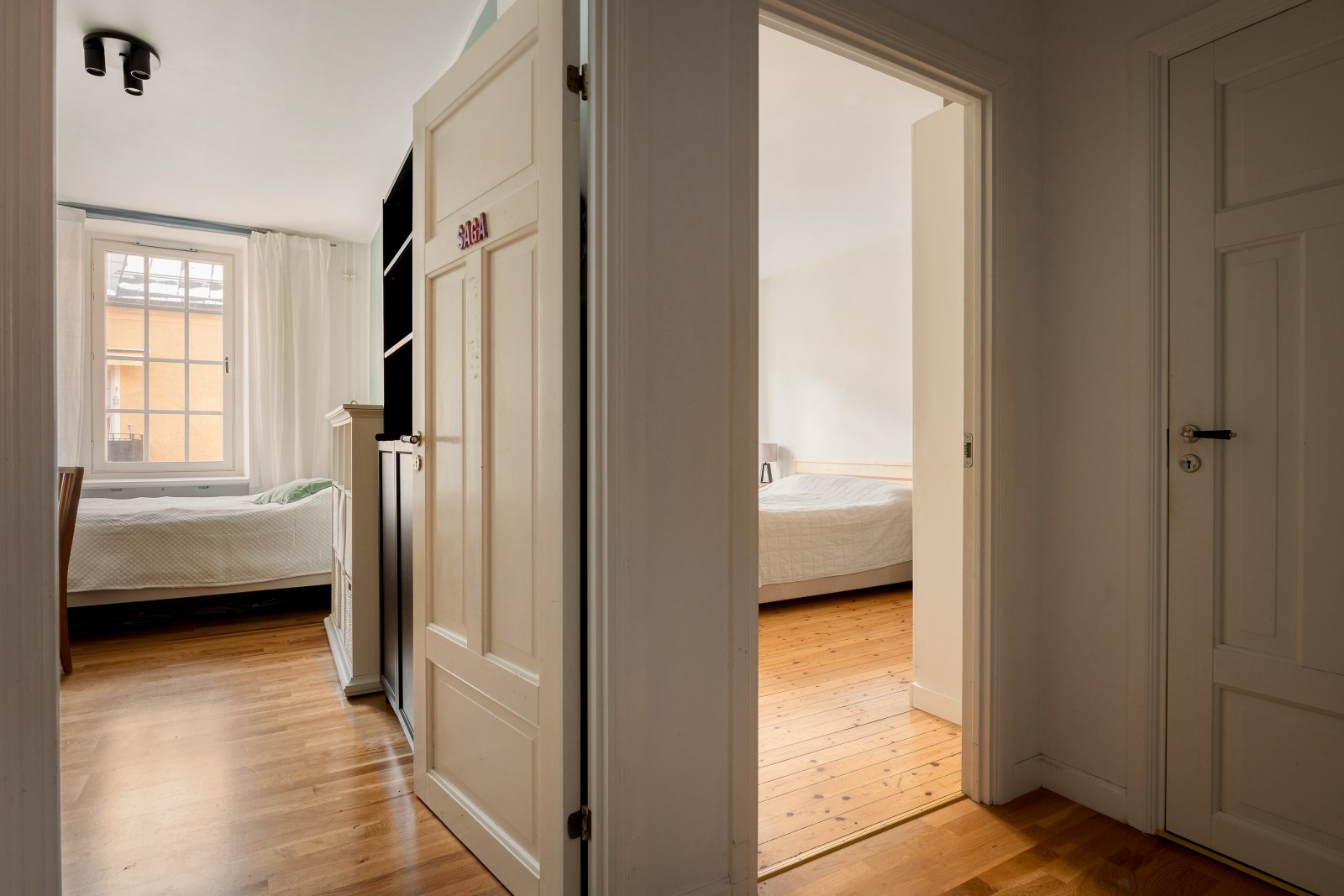 Rymligt sovrum med tillhörande klädkammare. Här finns gott om plats för säng, skrivbord och övrigt möblemang. Ekparkett på golv och ljusa väggar.