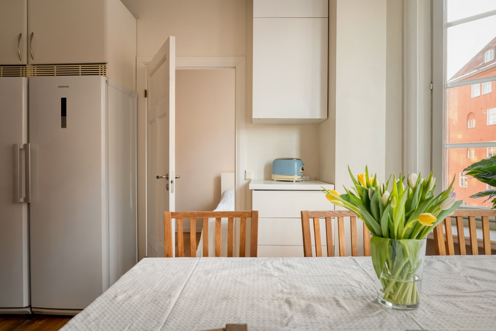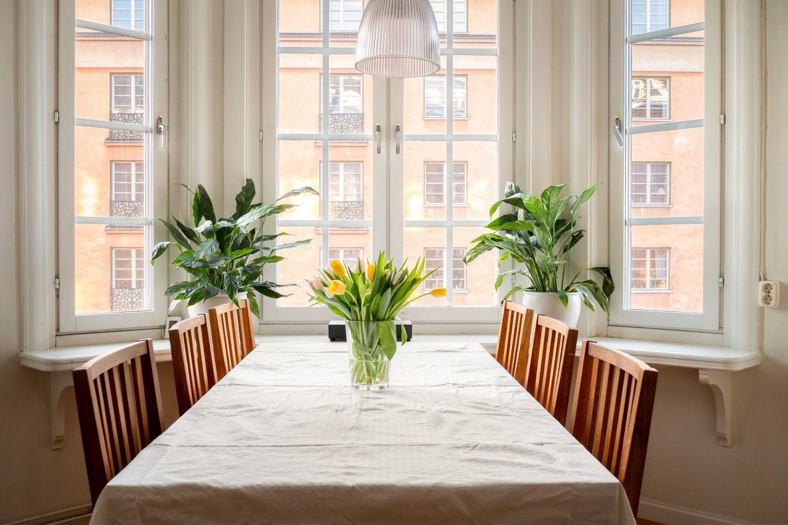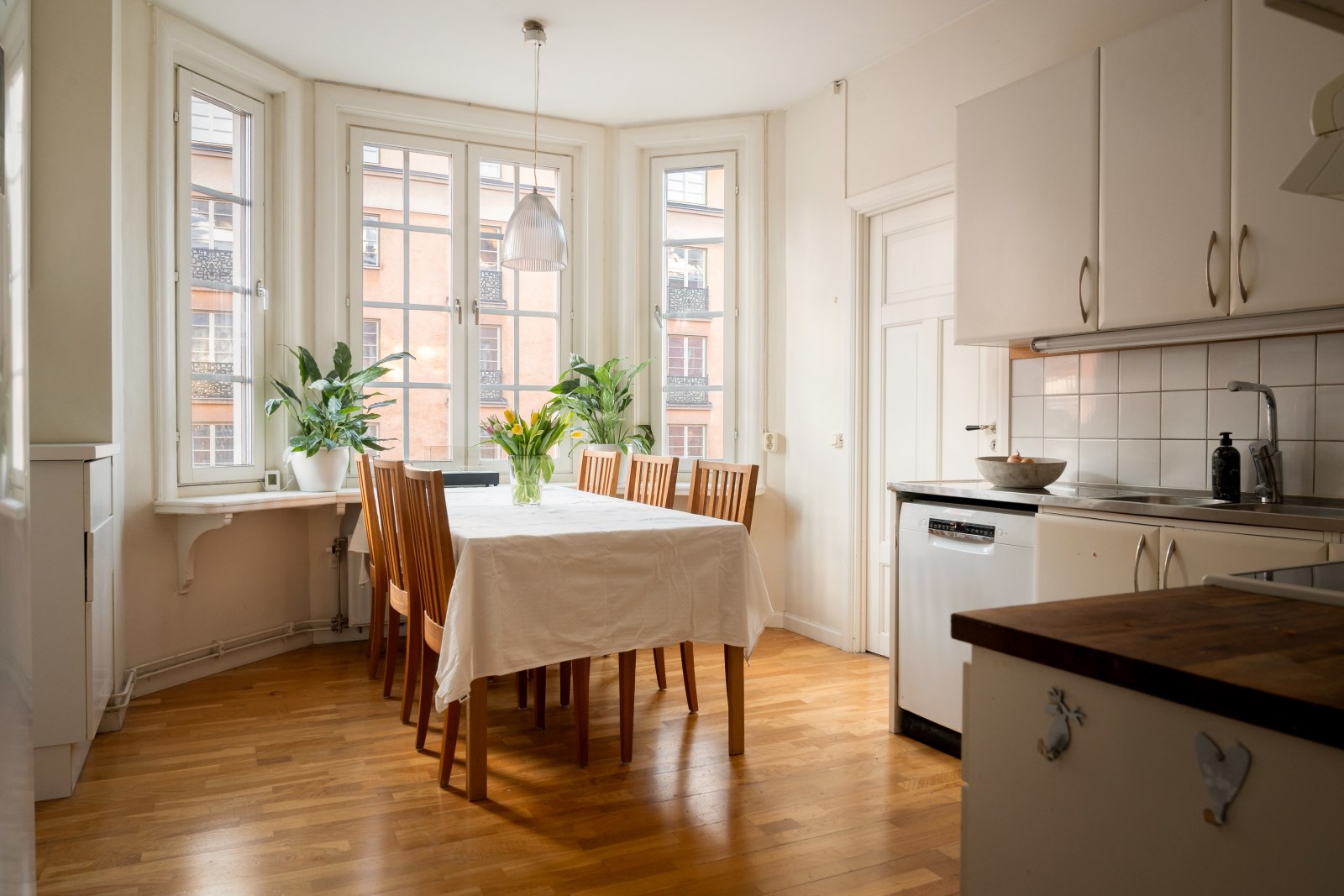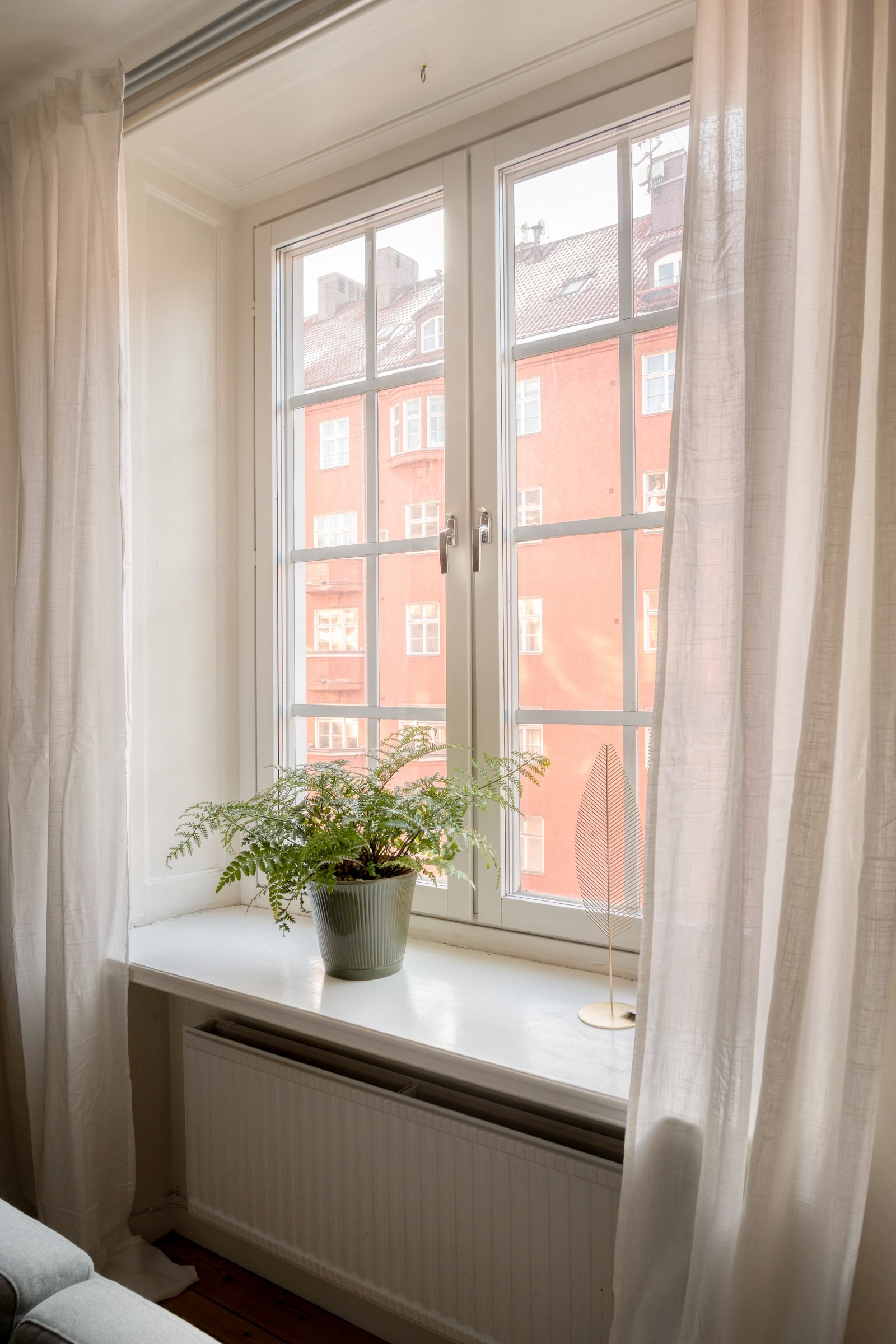 De stora spröjsade fönstren släpper in rikligt med dagsljus och förstärker känslan av rymd och trivsel.