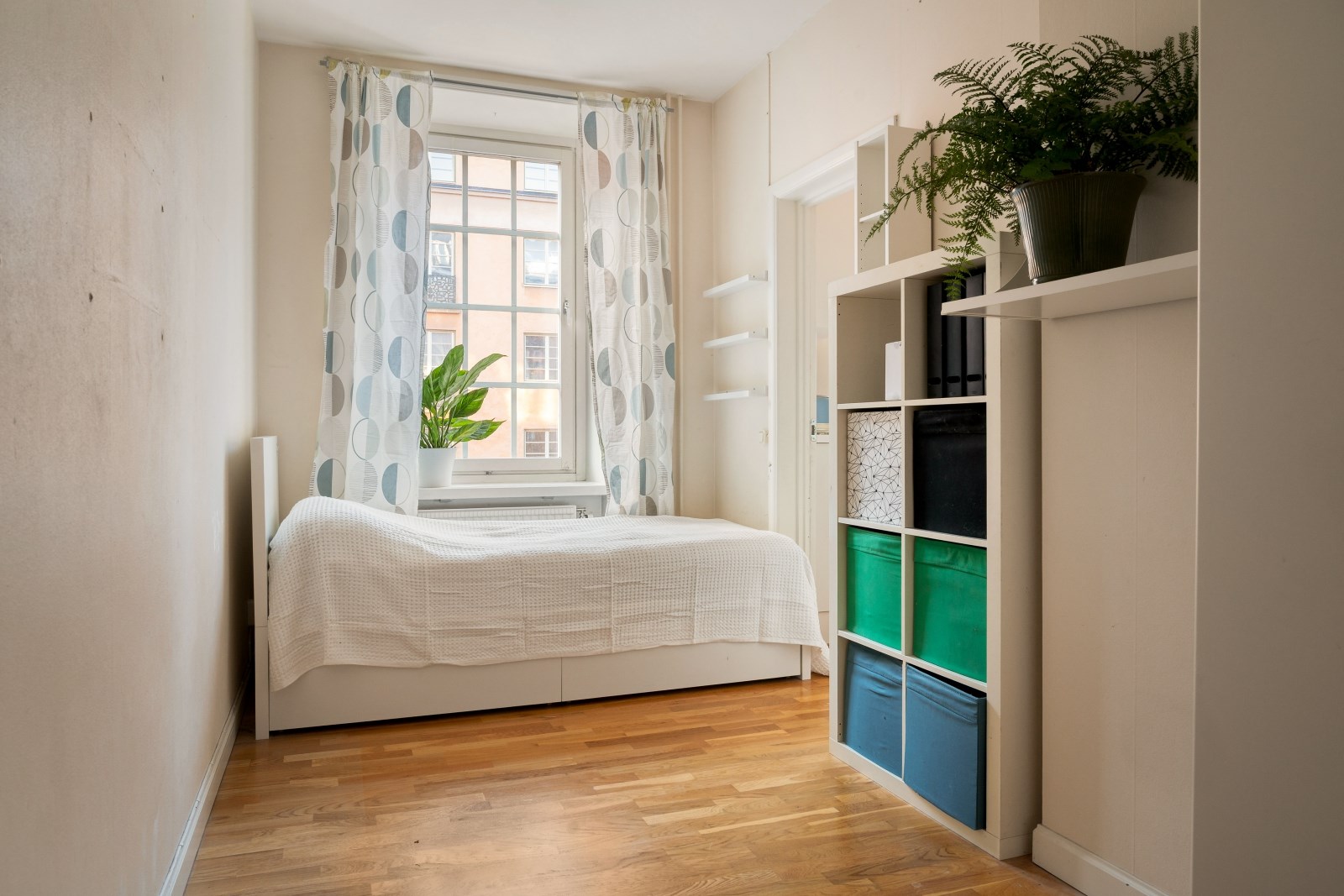 Rymligt sovrum med plats för säng och skrivbord. Ekparkett på golv och ljusa väggar.