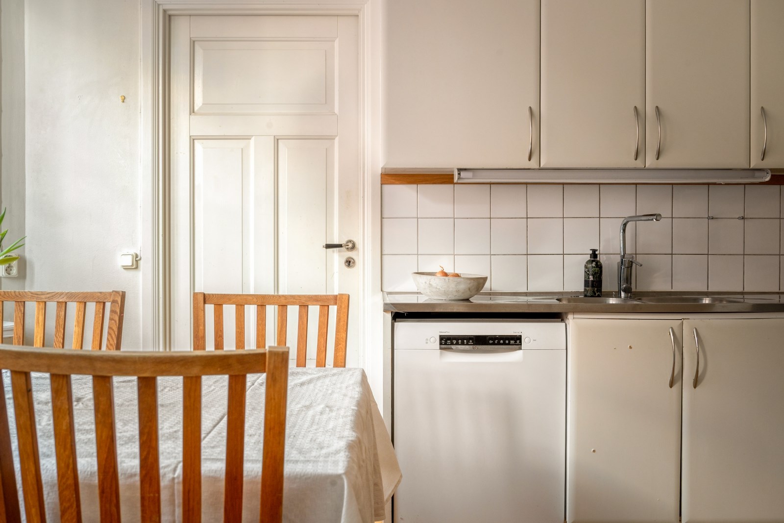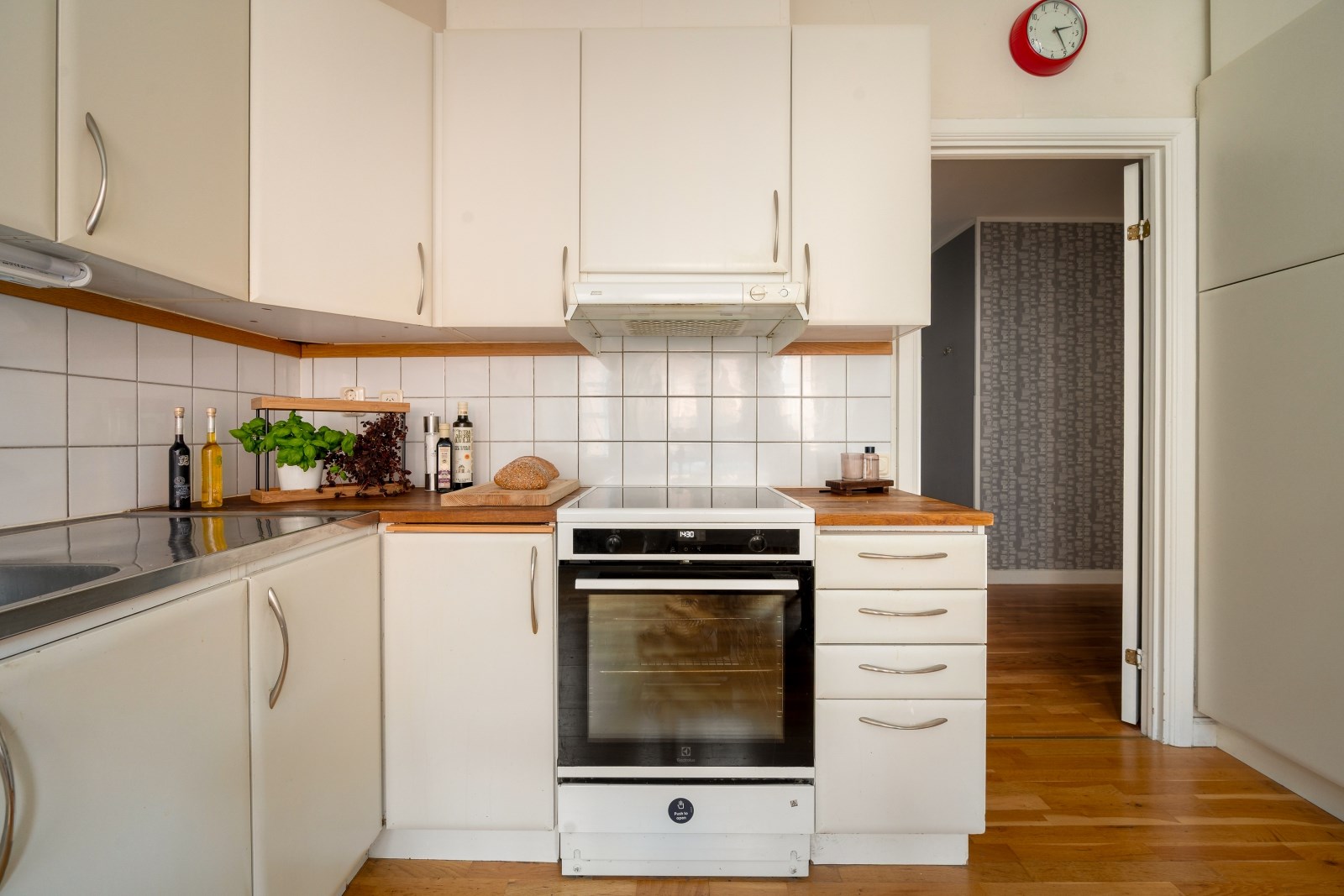 Stort och inbjudande kök med generösa arbetsytor och god förvaring bakom ljusa skåpsluckor. Här finns gott om plats för större matgrupp intill burspråk, perfekt för både vardag och middagar i socialt sällskap. Fint ljusinsläpp bidrar till en trivsam atmosfär. Köket är utrustat med diskmaskin, kyl, frys, ugn, spis och köksfläkt. Härifrån nås två av bostadens sovrum.