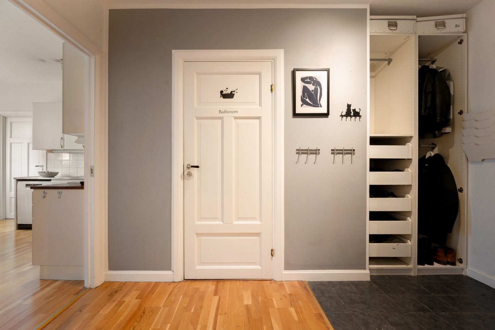 Välkomnande entré med gott om svängutrymme och plats för avhängning av ytterkläder direkt till höger. Praktisk klinker vid entrén som övergår i ekparkett längre in. I anslutning till hallen finns bostadens badrum. Hallen leder vidare till kök, vardagsrum samt ett av sovrummen och skapar ett fint flöde genom bostaden.