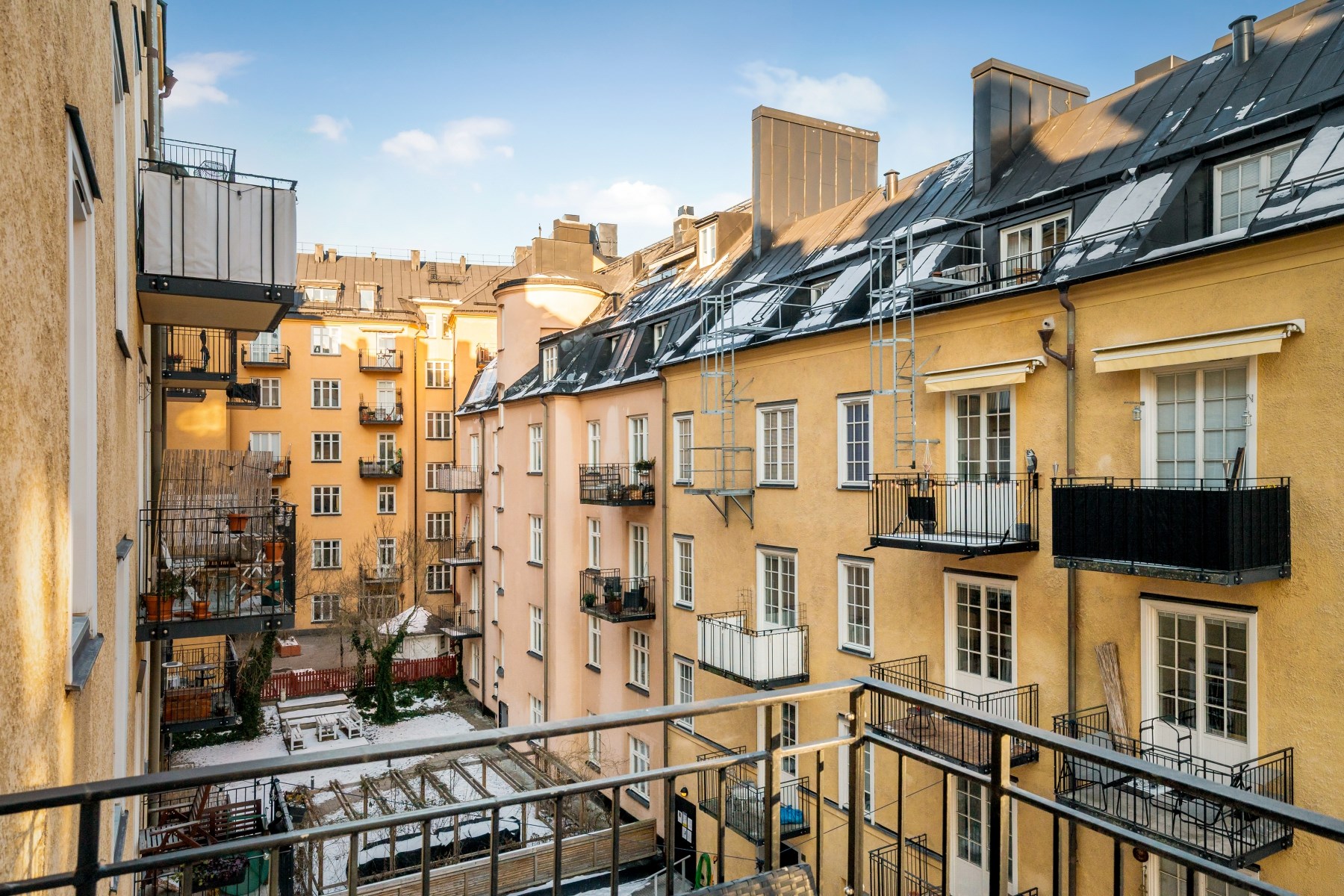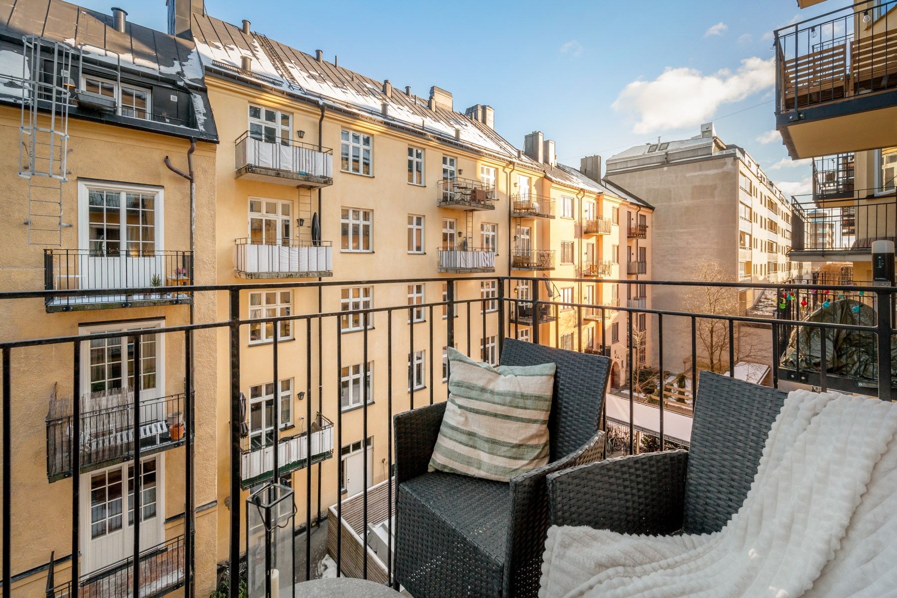 Mysig och möblerbar balkong med förmiddagssol över lugn innergård, en självklar plats för morgonkaffet och en fin förlängning av bostaden under årets varmare månader.