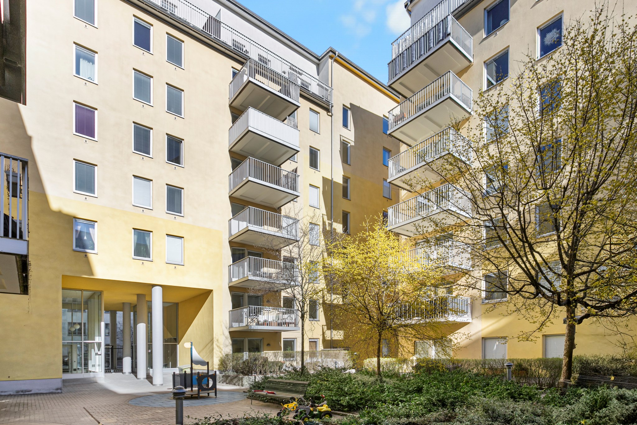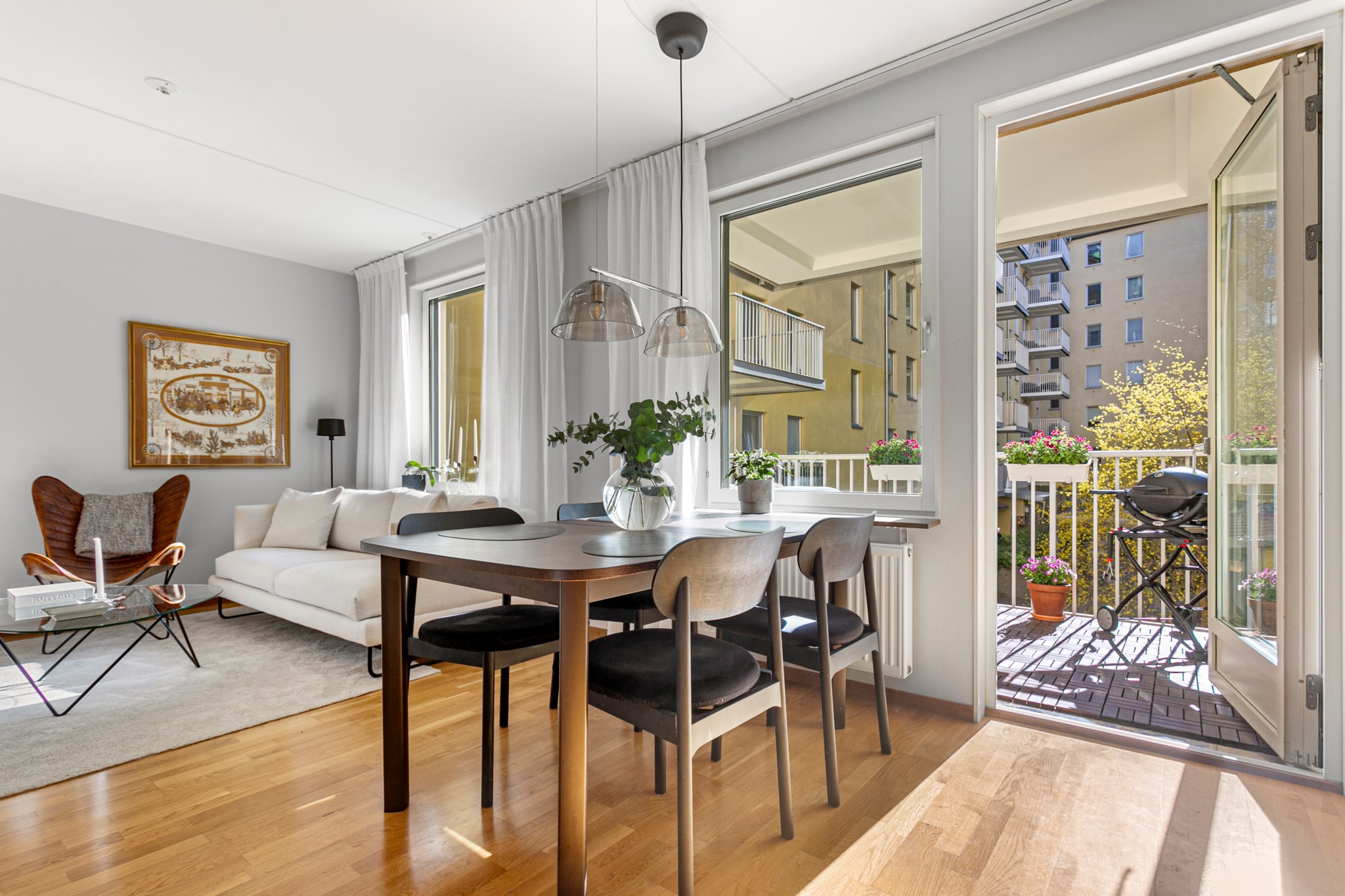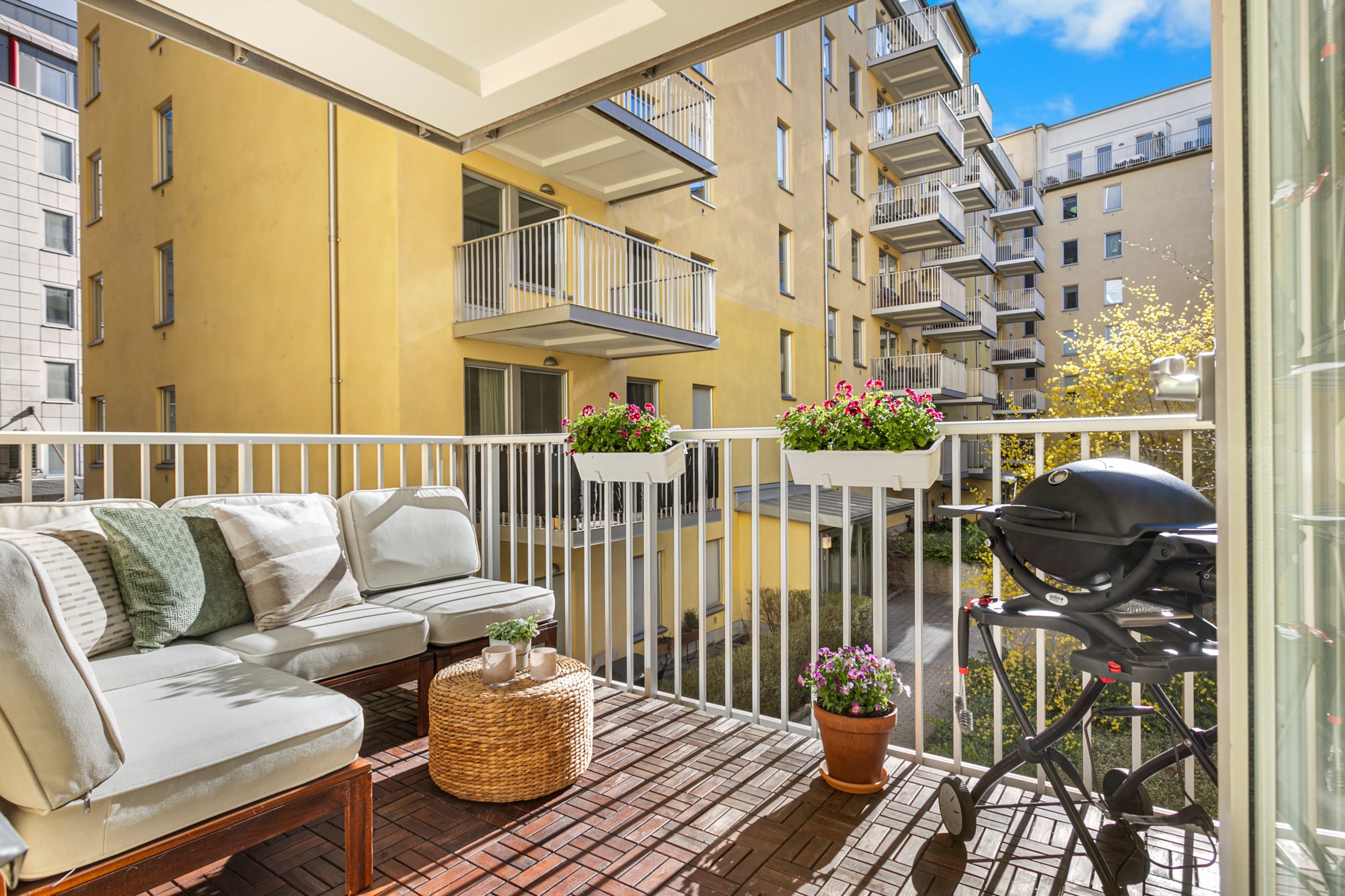 Från vardagsrummet och köket tar ni er enkelt ut till en stor balkong med lungt läge mot innergården. Balkongen rymmer både soffa och matplats.