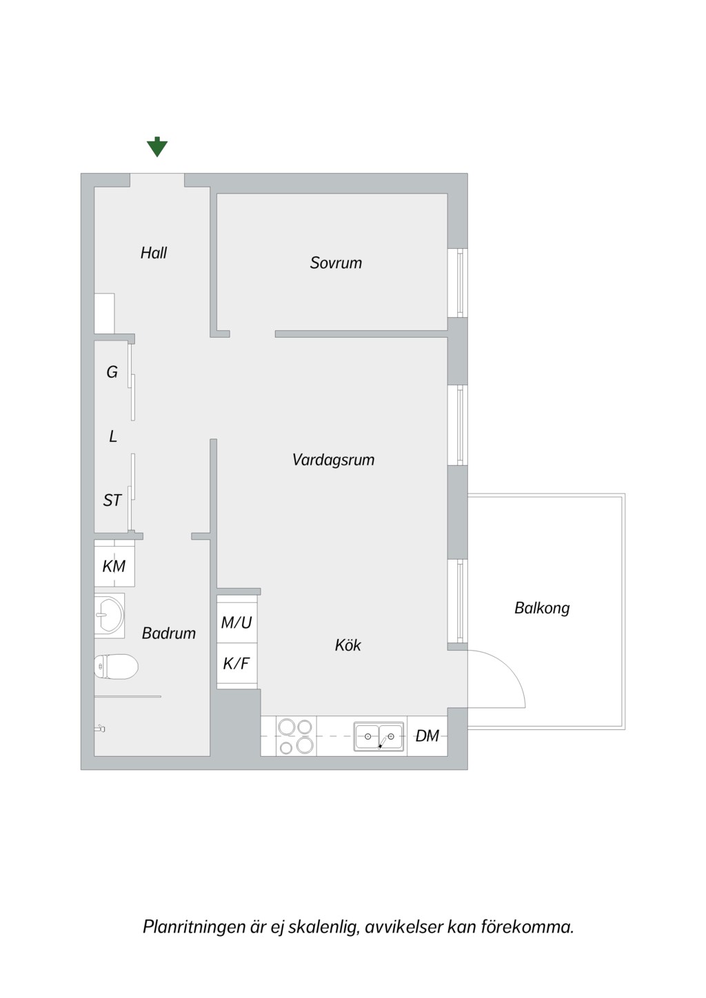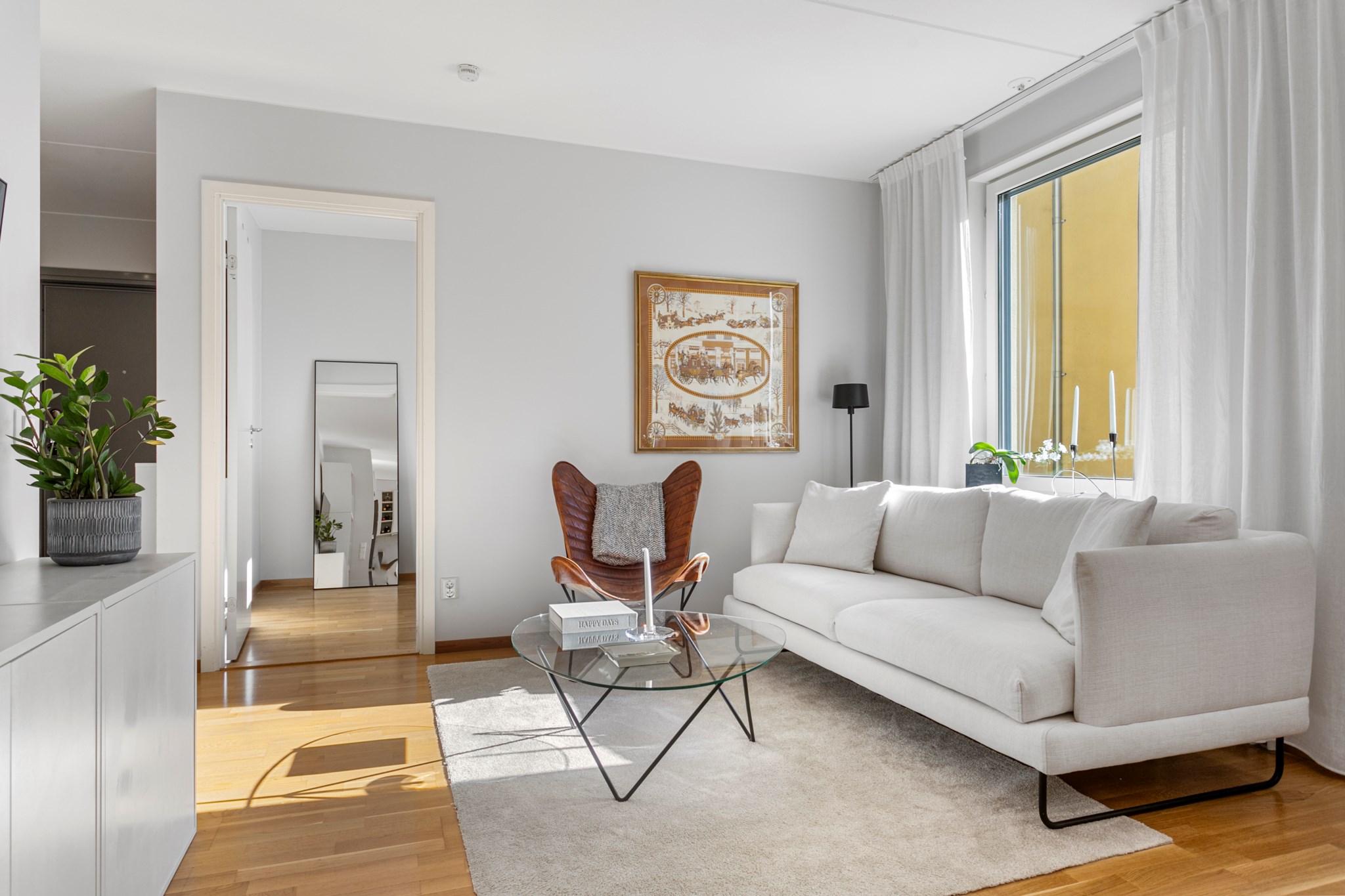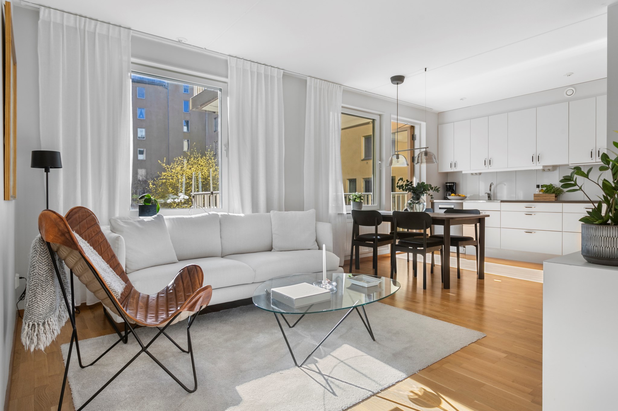 Från vardagsrummet och köket tar ni er enkelt ut till en stor balkong med lungt läge mot innergården. Balkongen rymmer både soffa och matplats.