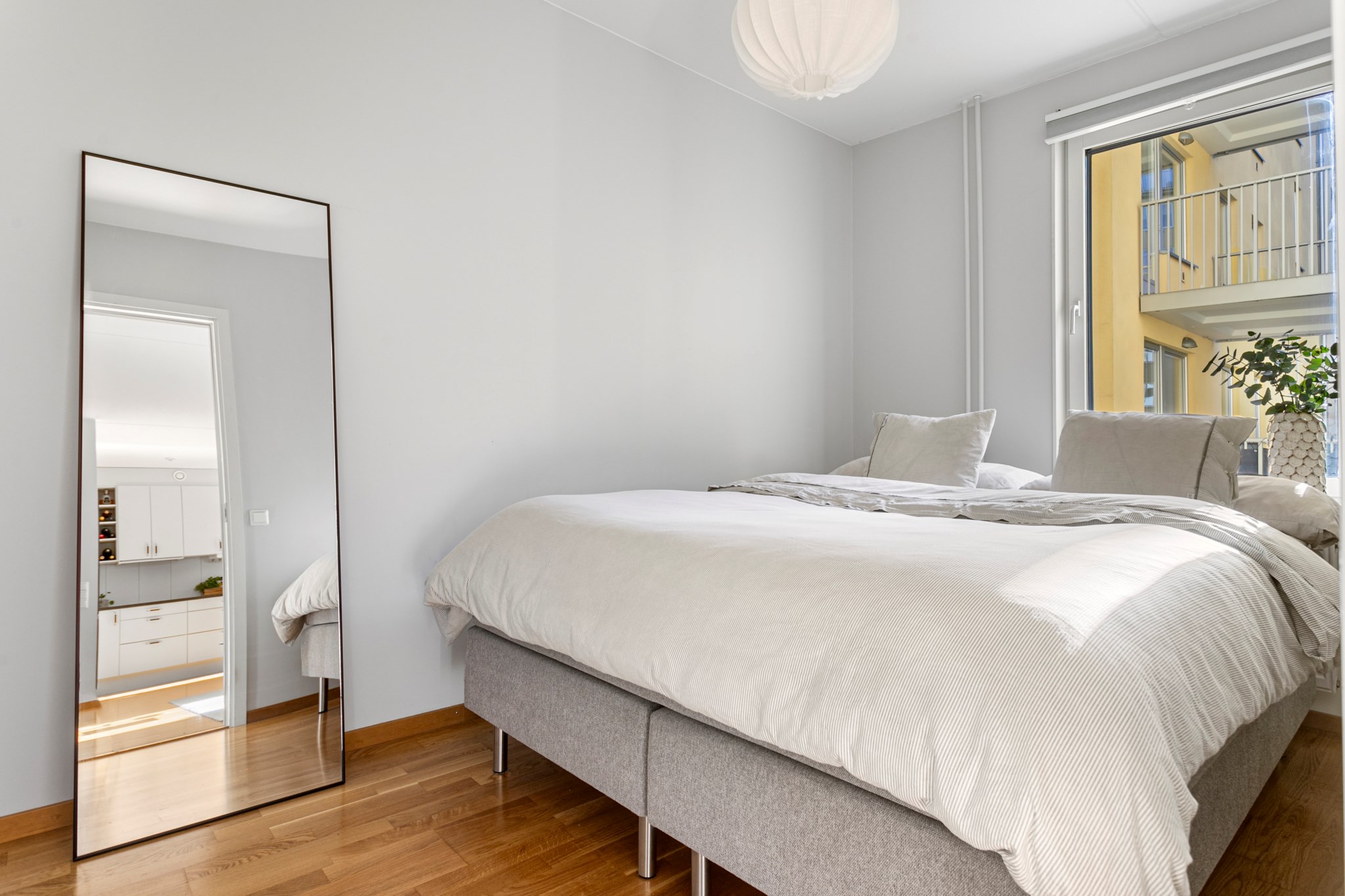 Lägenheten har sovrum med plats för dubbelsäng i lugnt läge mot innergården.