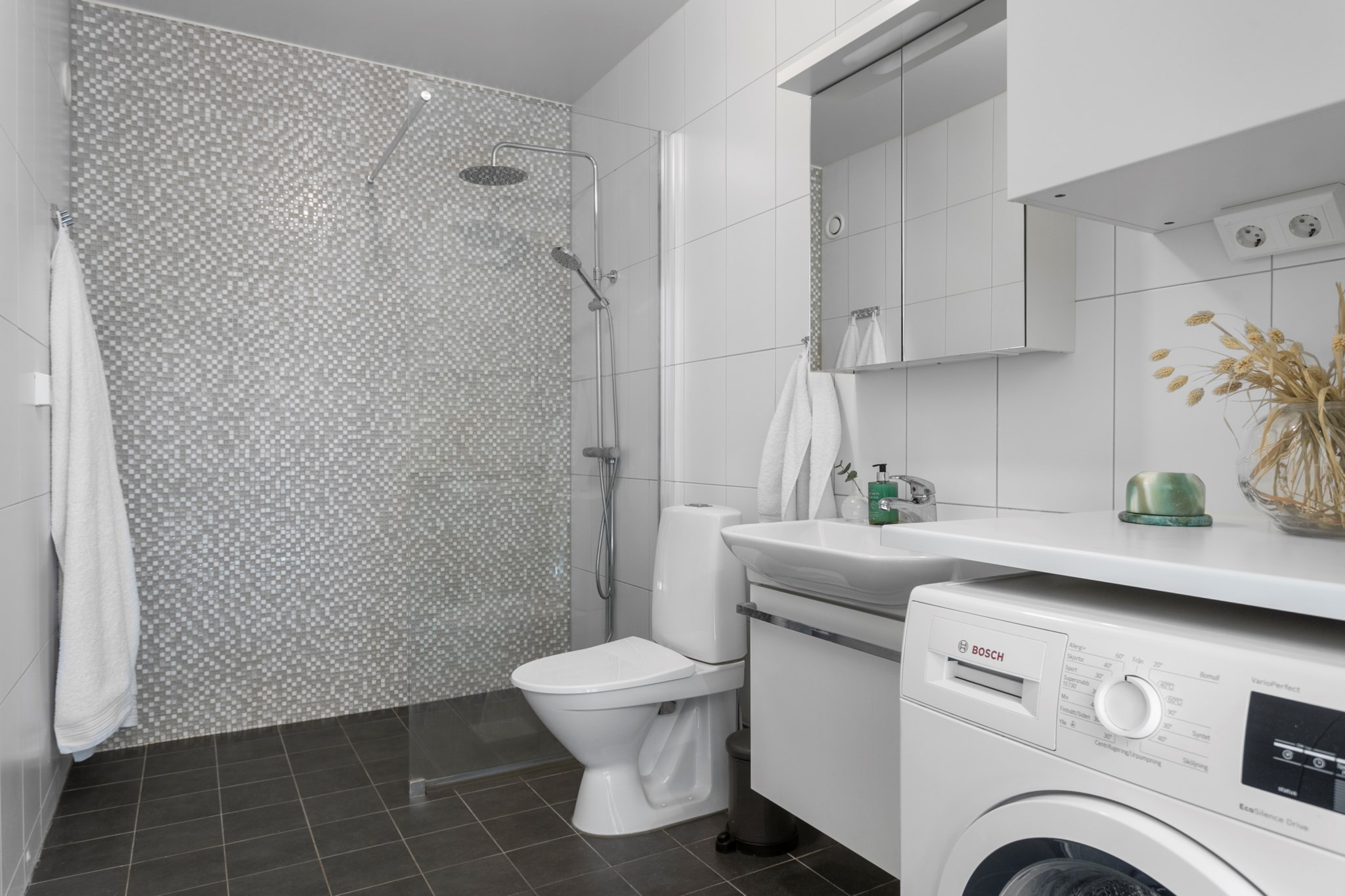 Badrummet ligger i anslutning till hallen. Ett helkaklat och modernt badrum med wc, dusch samt en mycket praktisk tvättavdelning med fina arbetsytor och förvaring ovan.