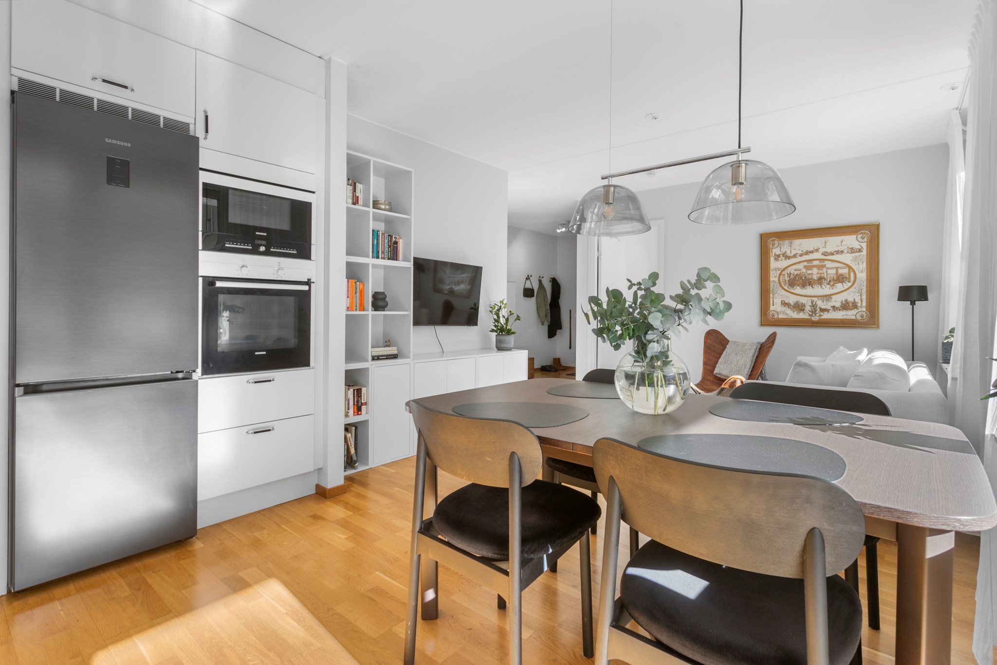 Vardagsrummet är stort och ljust med rejäla fönsterpartier och har en öppen planlösning mot köket. Här rymmer ni utan problem en ordentlig matplats, soffgrupp, fåtölj, bord och mycket mer om så önskas.