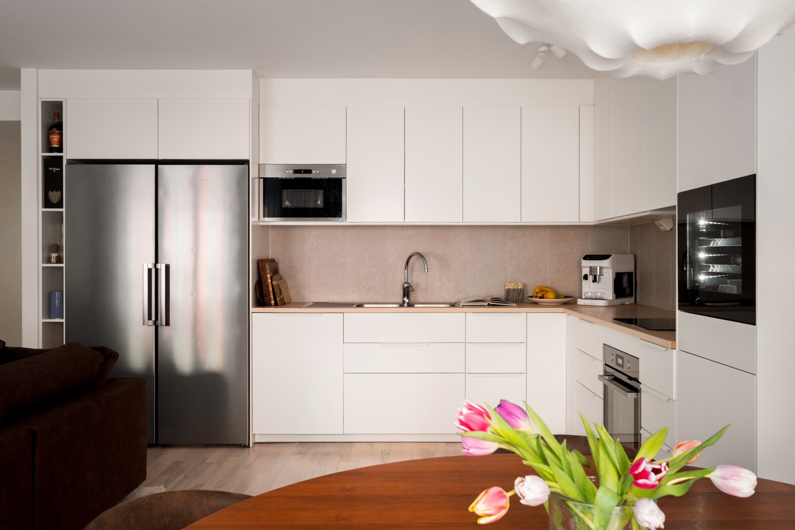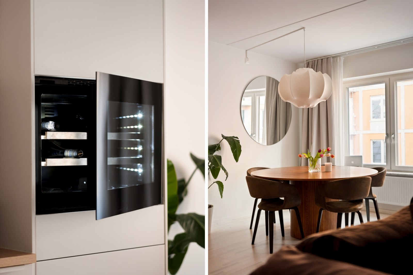 Kök med diskreta beslag och push-to open i överskåp. Här finner du en full maskinell park inklusive en inbyggd vinkyl med ledbelysning och god förvaring.