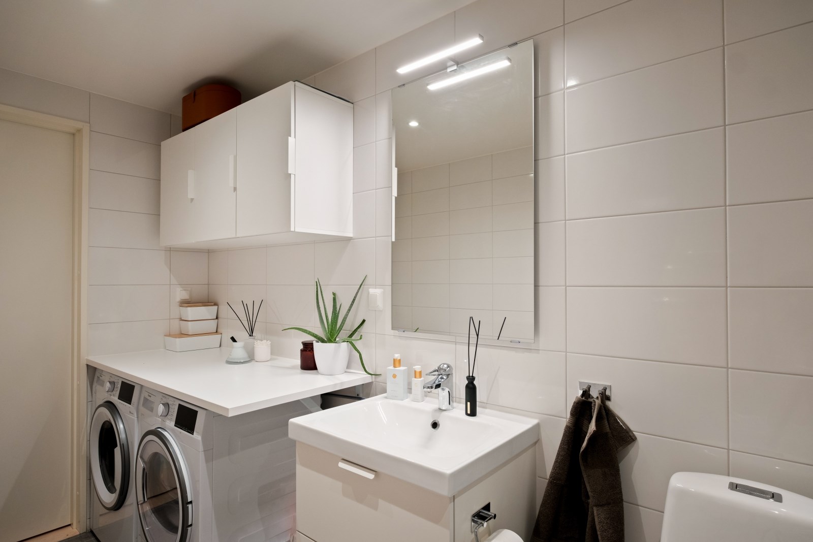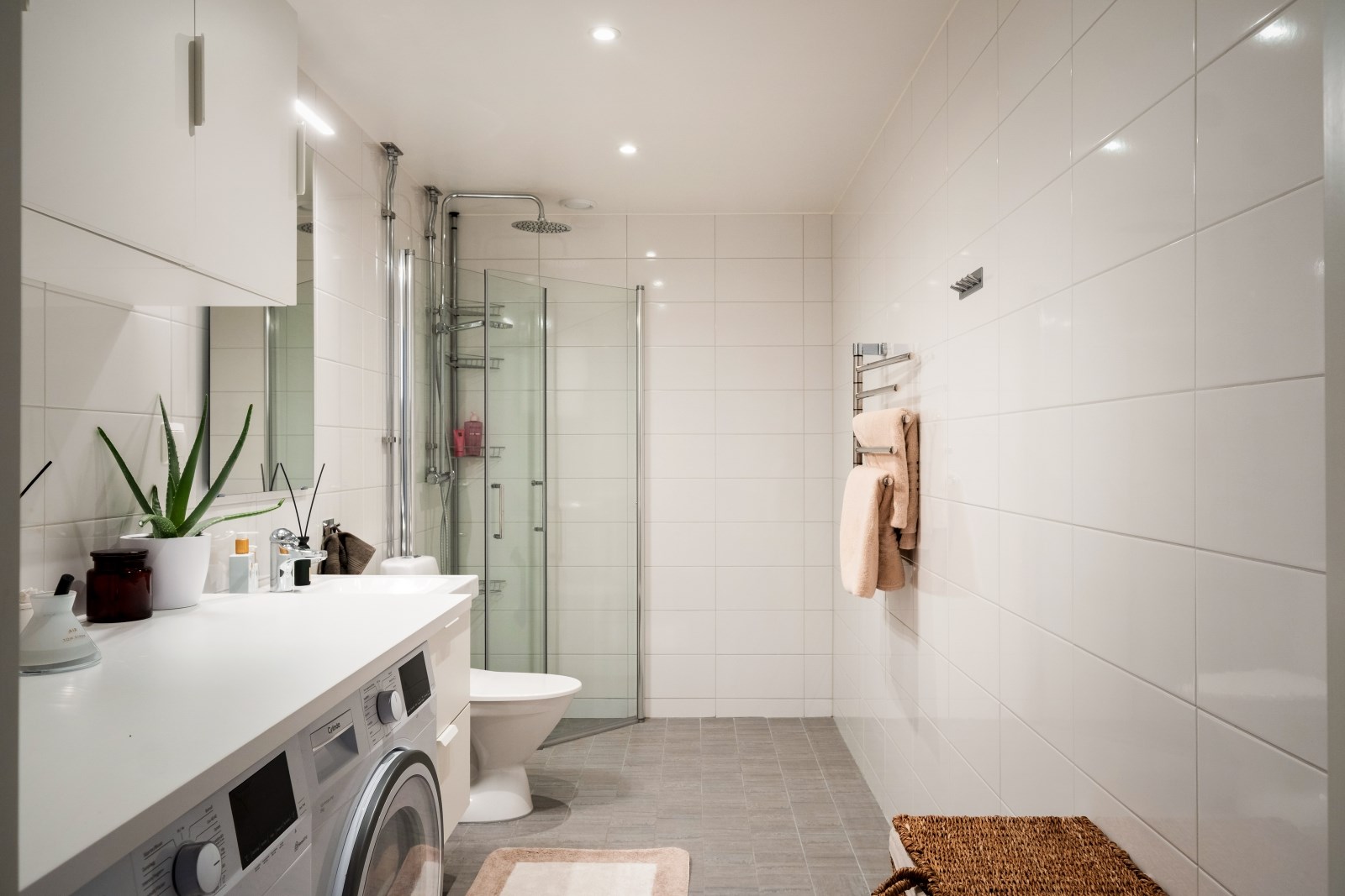 Helkaklat badrum med en egen tvättavdelning och förvaring, här finns även en stor dusch från Gustavsberg samt en handdukstork. Vikbara glasdörrar.
