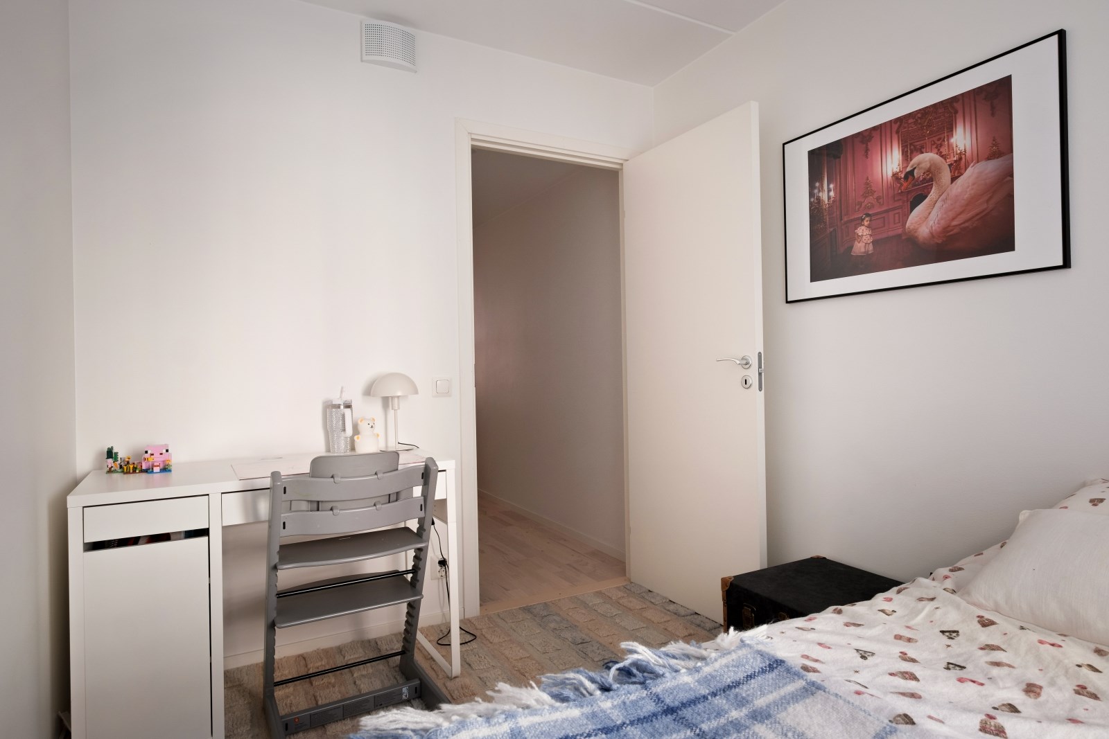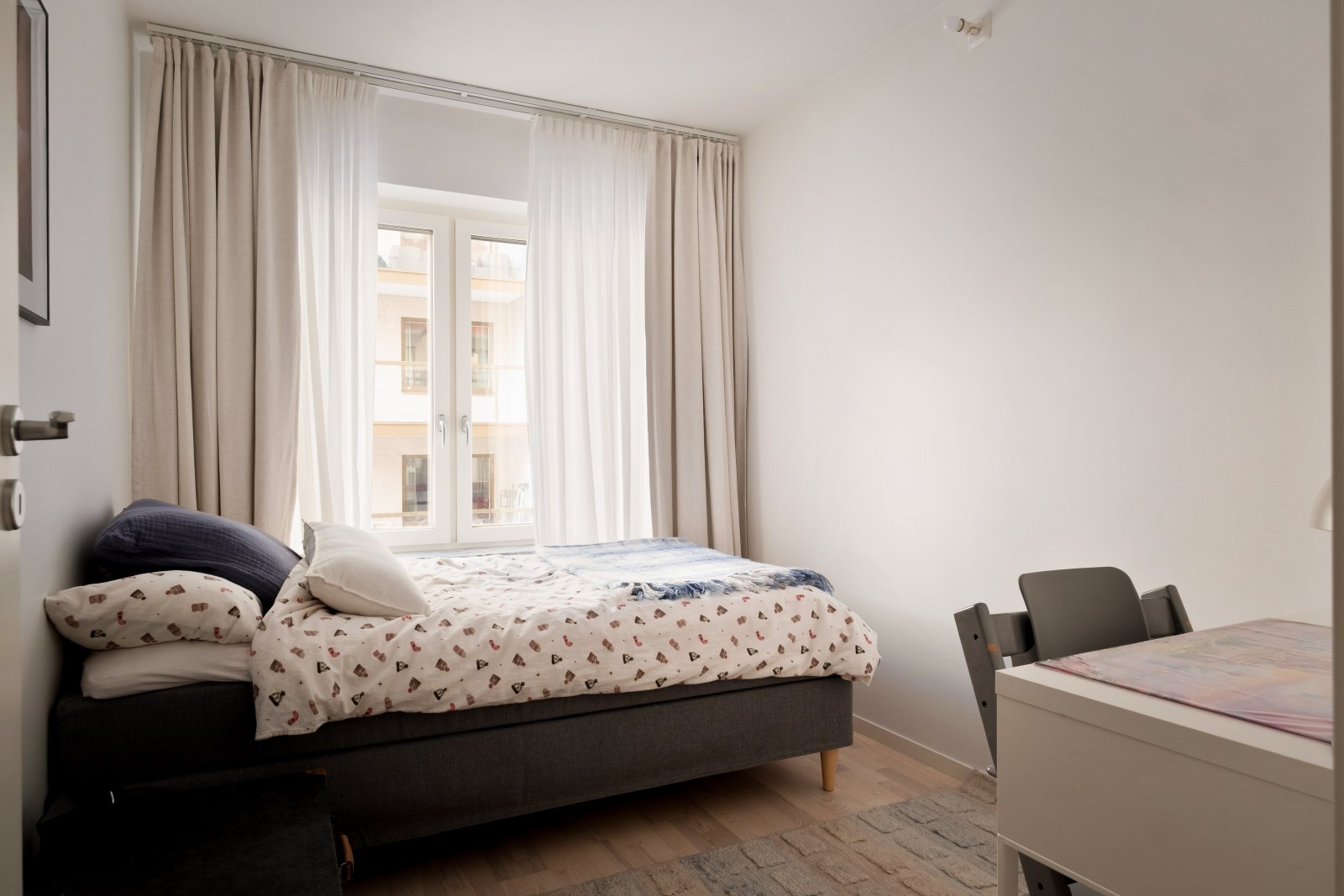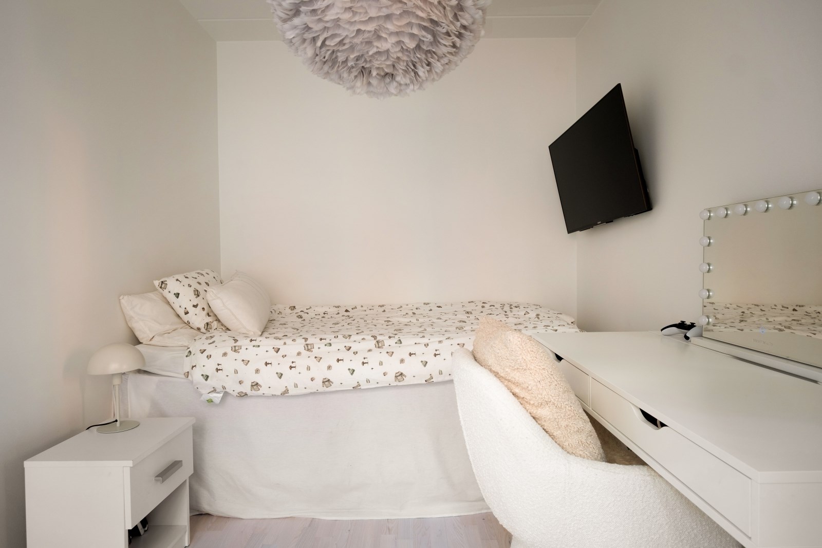 Sovrum med plats för säng och skrivbord. Här finns även en platsbyggd klädkammare med snygg belysning. Detta rum nås från vardagsrummet.