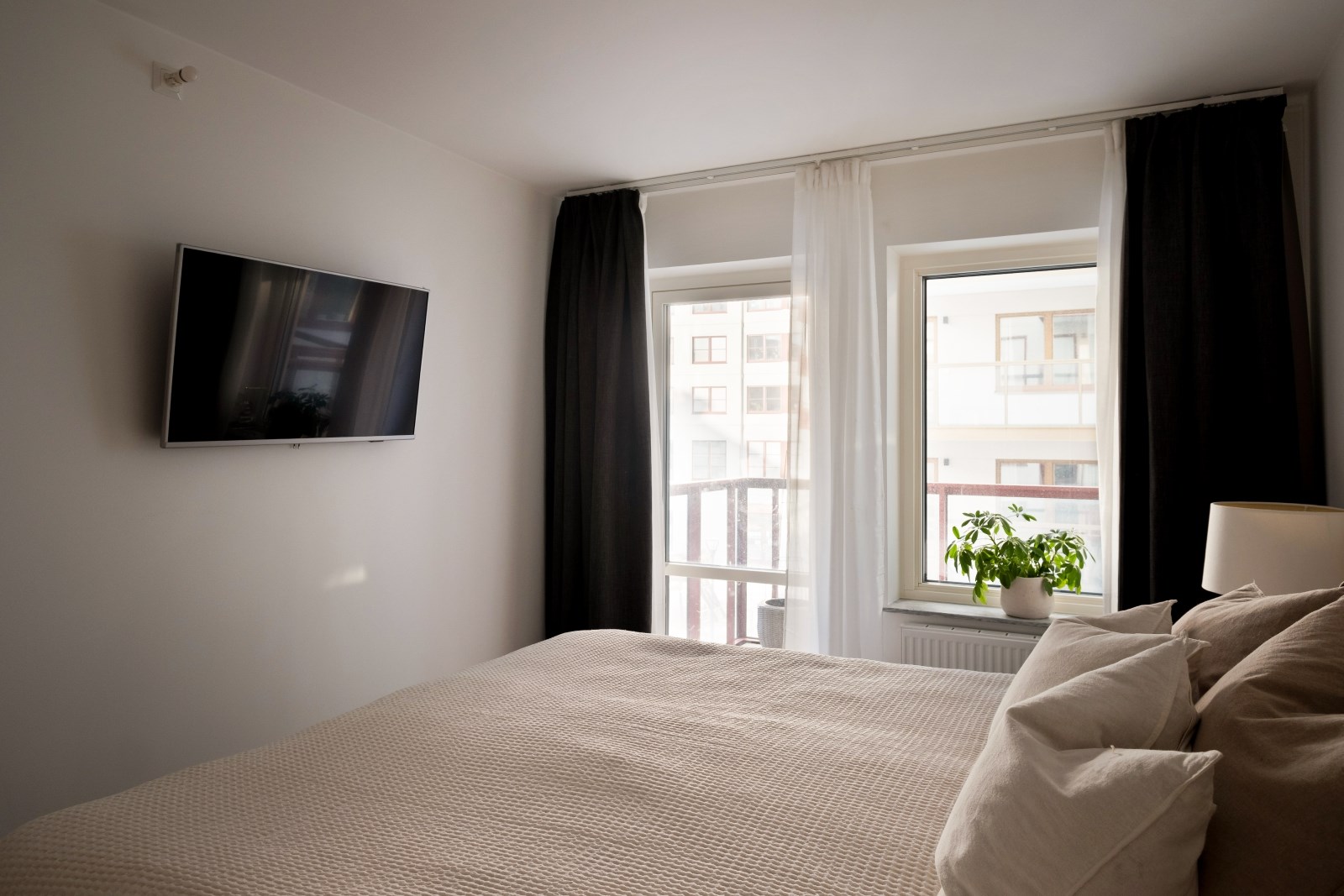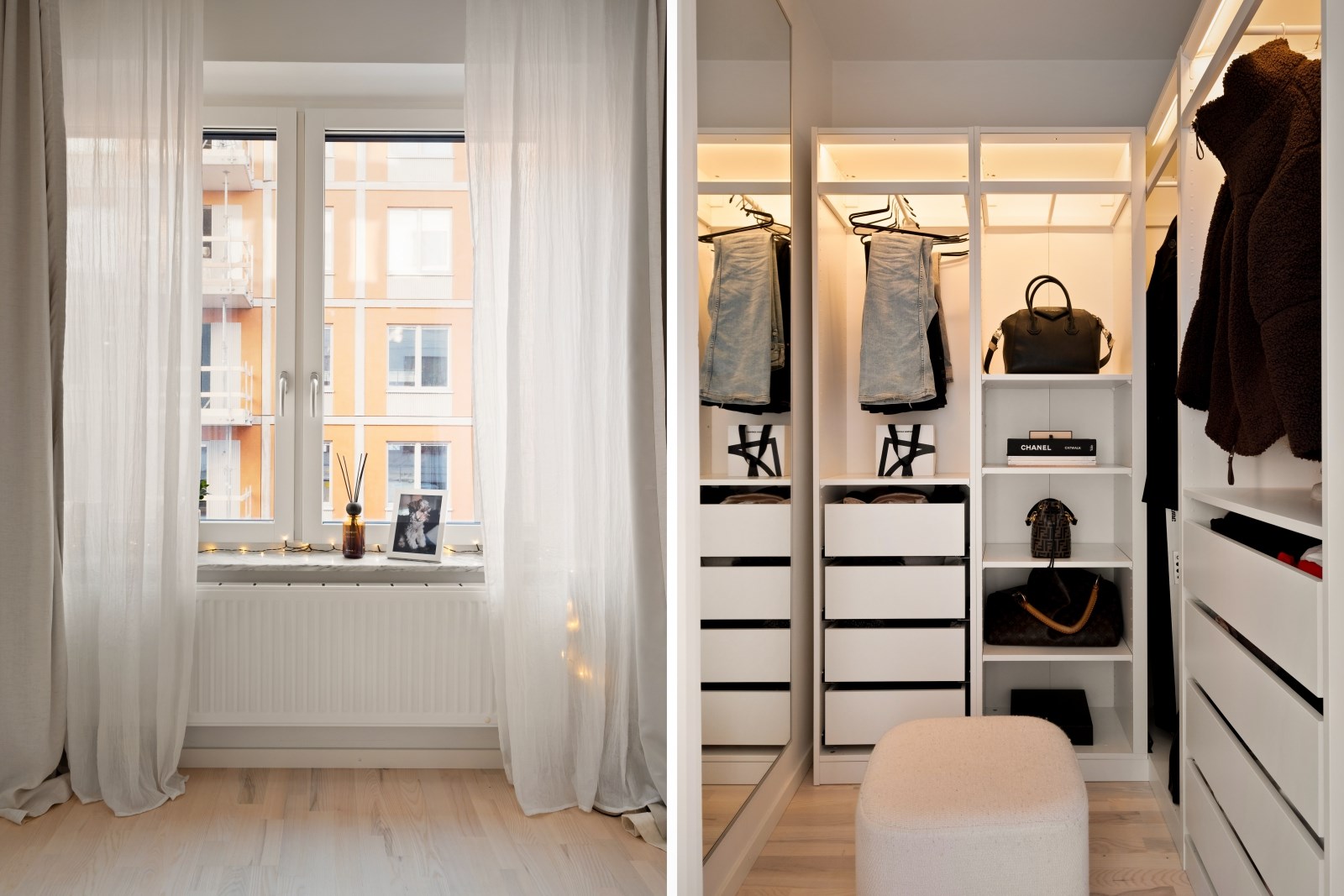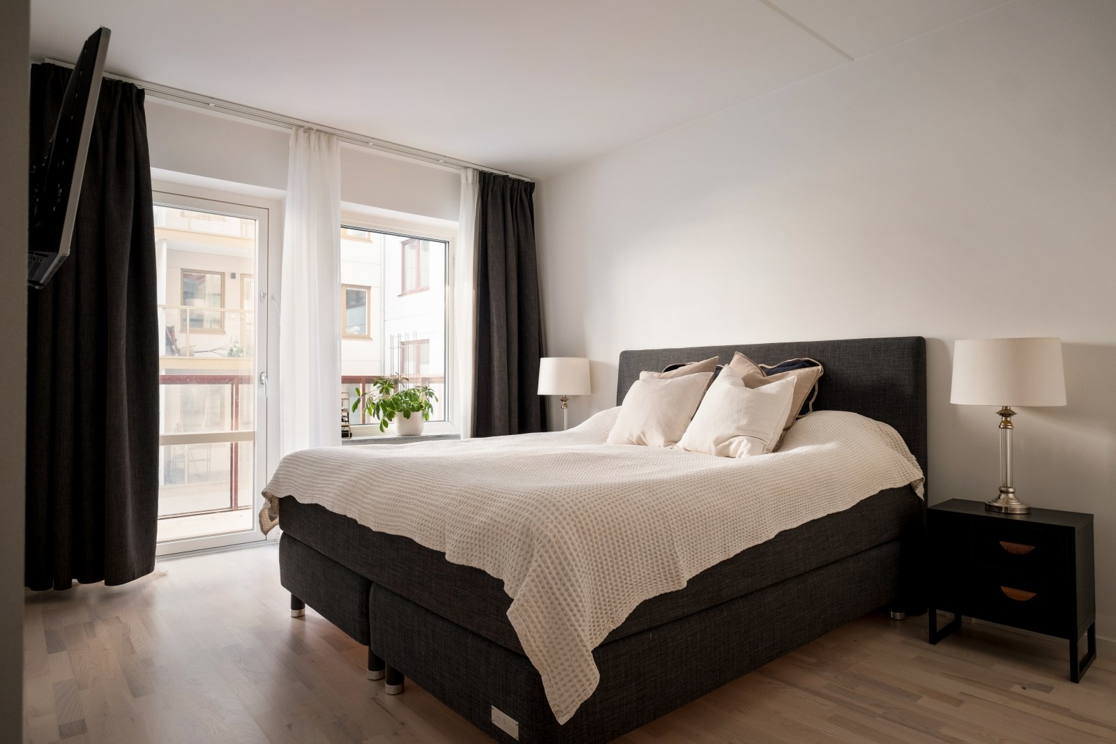 Generöst sovrum med plasts för dubbelsäng. Här finns en garderob från Elfa med skjutdörrar samt en fristående garderob bredvid. Från sovrummet kommer du ut till den trevliga balkongen som vetter ut mot föreningens lugna innergård.