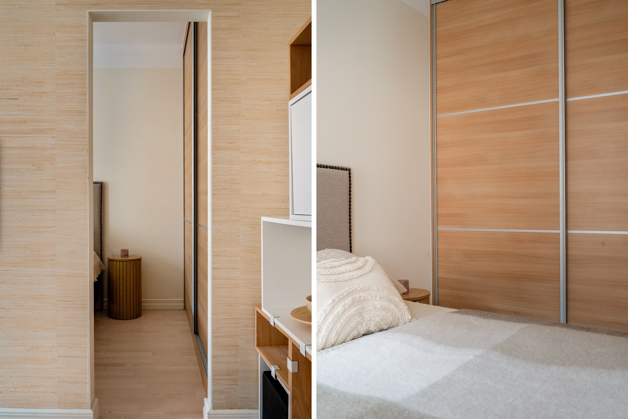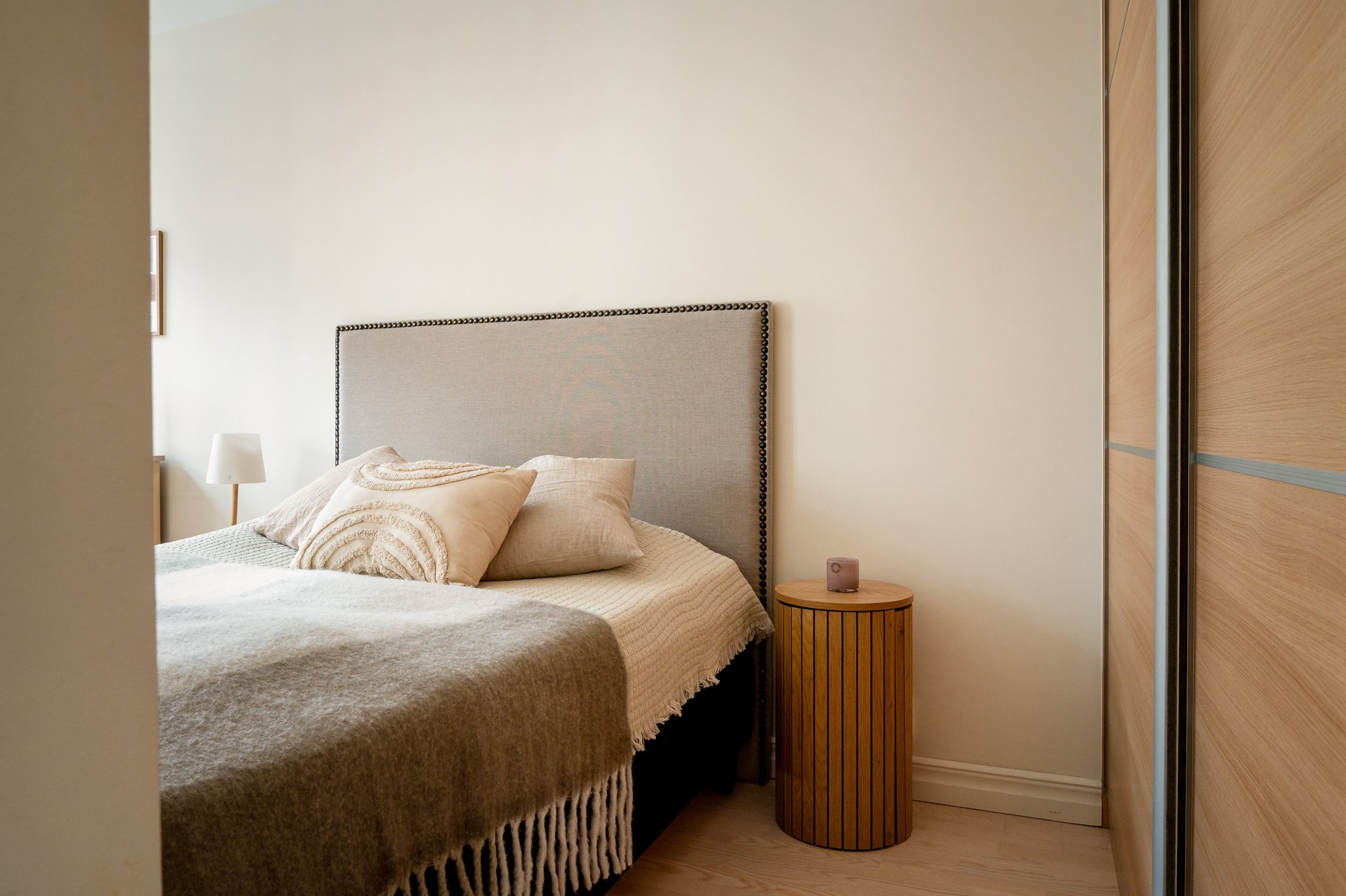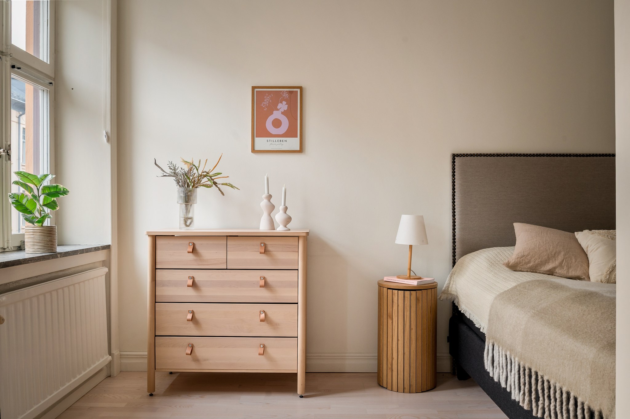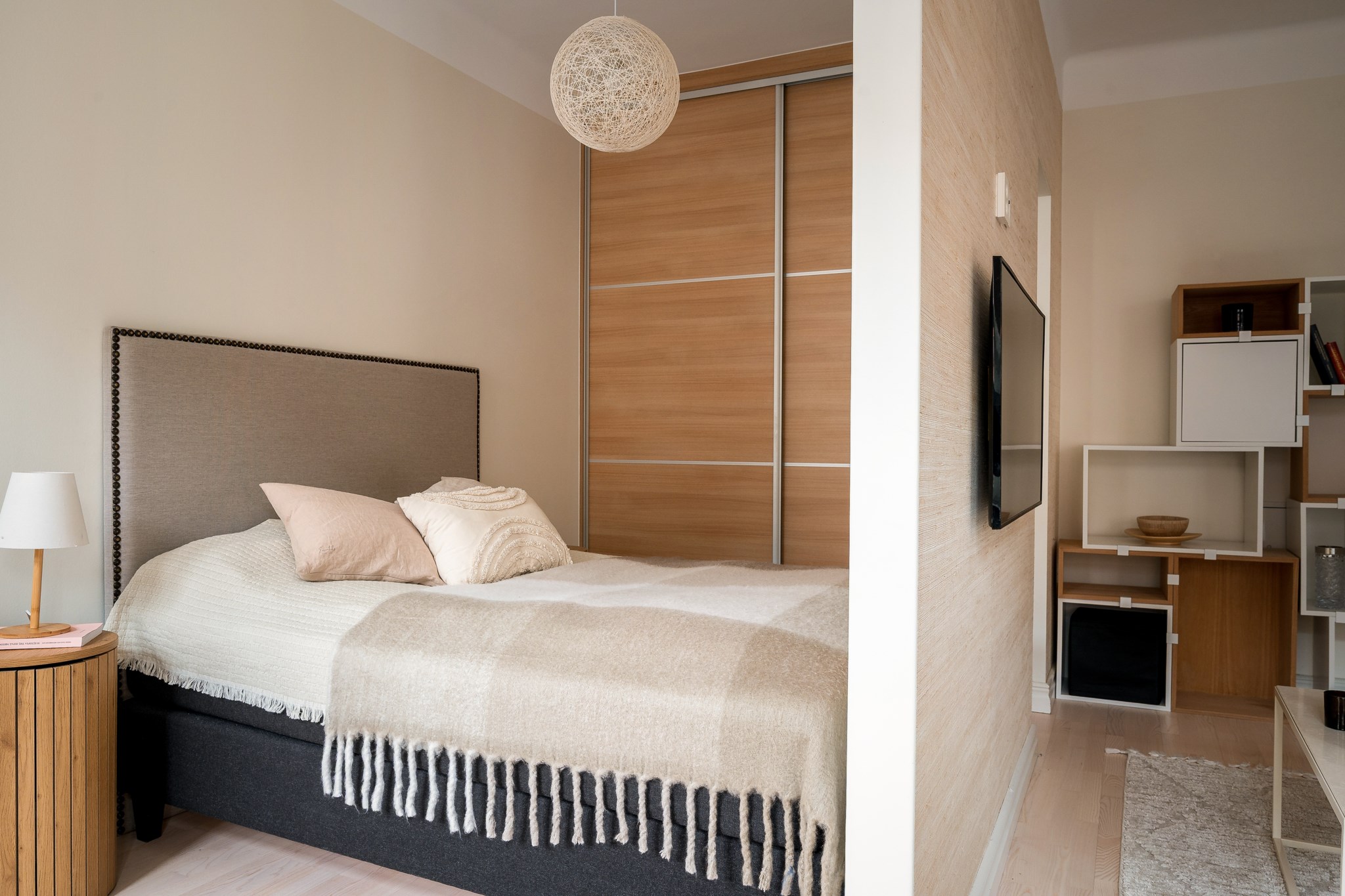 Här ryms dubbelsäng med sängbord samt förvaring i ordentlig skjutdörrsgarderob.