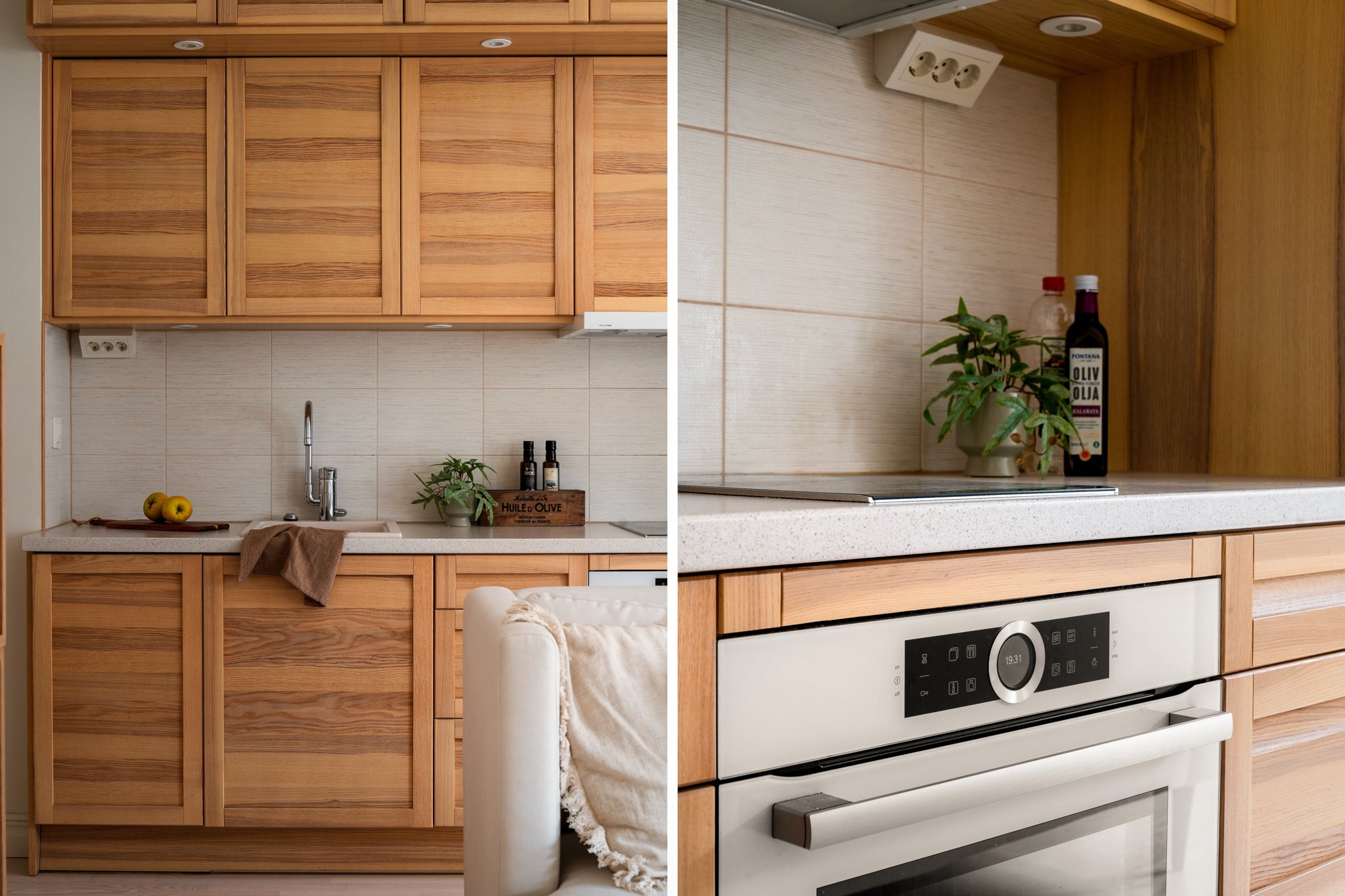 Modernt kök med bra förvaring bakom luckor och lådor i trä samt snygga arbetsytor på vit stenskiva. Bra belysning via spotlights samt stänkskydd i vitt kakel. Köket är utrustat med diskmaskin, ugn, spishäll, spisfläkt samt kombinerad kyl/frys. I anslutning till köket finns naturlig plats för matbord invid fönster.