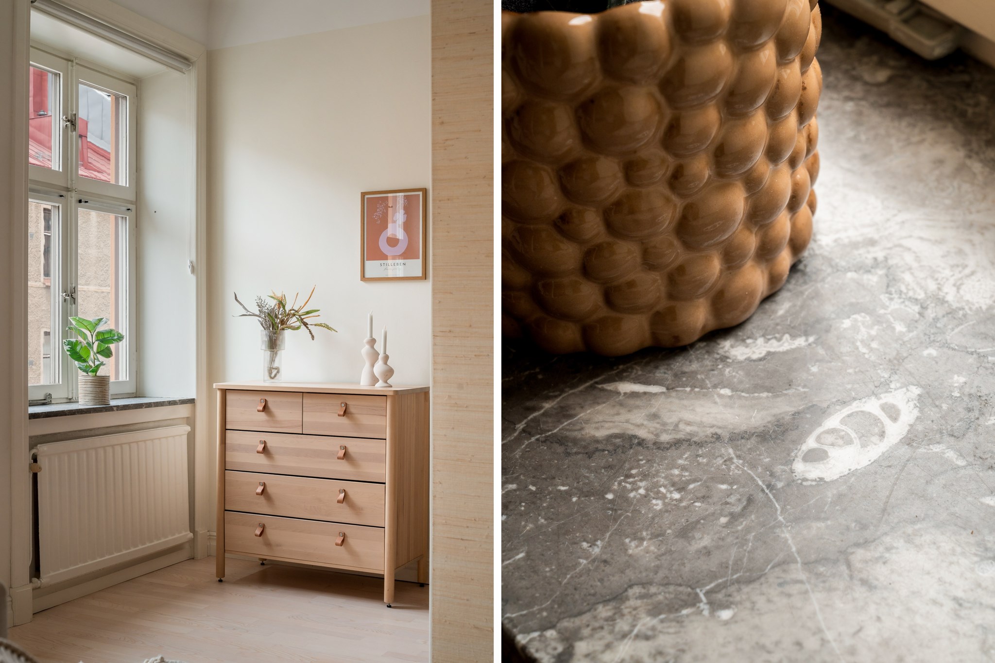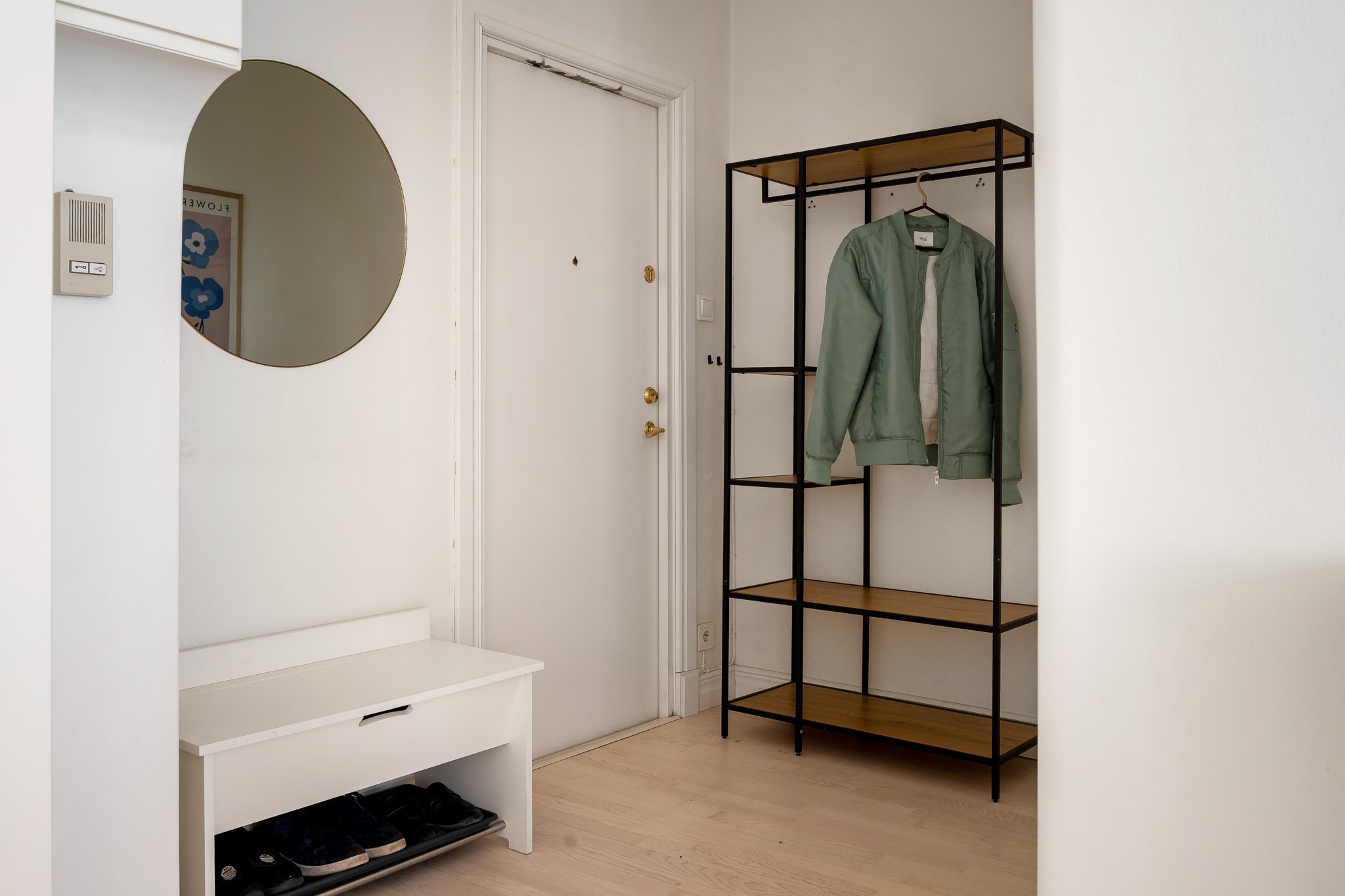 Trivsam hall med plats för hatt och skohylla vid entrén samt ytterligare förvaring i två stycken garderober.