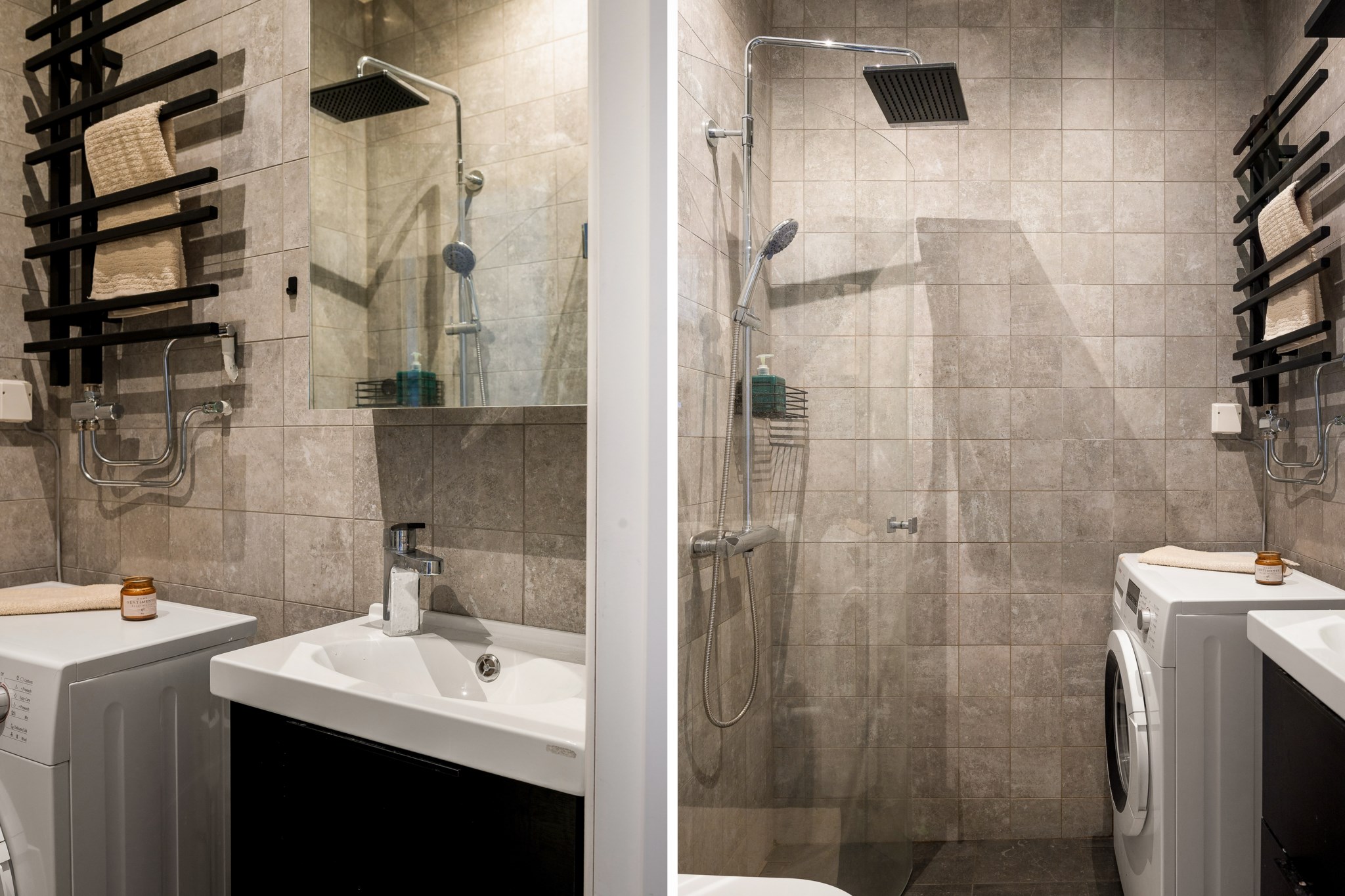 Badrummet är stilrent inrett med ljusgrå kakel på väggar och mörkt klinkergolv. Bra belysning via infällda spotlights i taket. Badrummet är utrustat med wc, dusch med takdusch, handdukstork, tvättmaskin, spegelskåp samt tvättställ med kommod.